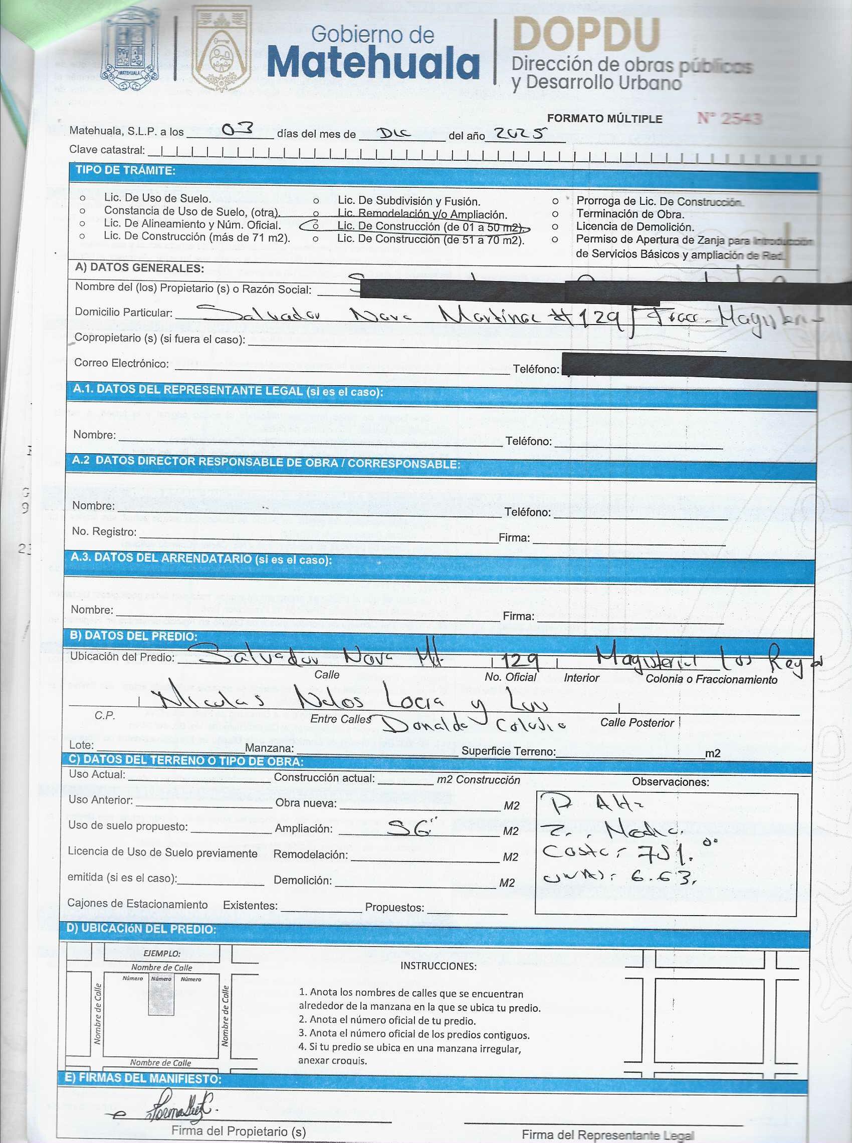 2025 01/12/2025 31/12/2025 DOP/LC/503/2025 CONSTRUCCION PABLO MARTINEZ ALEJO CALDERON Calle CALDERON 420 0 Colonia CENTRO 20 MATEHUALA 20 MATEHUALA 24 San Luis Potosí 78700 "http://www.cegaipslp.org.mx/HV2025.nsf/nombre_de_la_vista/B96E850964A1078606258D7600709E10/$File/13+PABLO+MARTINEZ+ALEJO.jpg " 12/12/2025 12/12/2026 HABITACIONAL "http://www.cegaipslp.org.mx/HV2025.nsf/nombre_de_la_vista/681454125AE55ABB06258D760071ADF7/$File/13+PABLO+MARTINEZ+ALEJO.jpg " DIRECCIÓN DE OBRAS PÚBLICAS Y DESARROLLO URBANO 05/01/2026 COBRO NORMAL