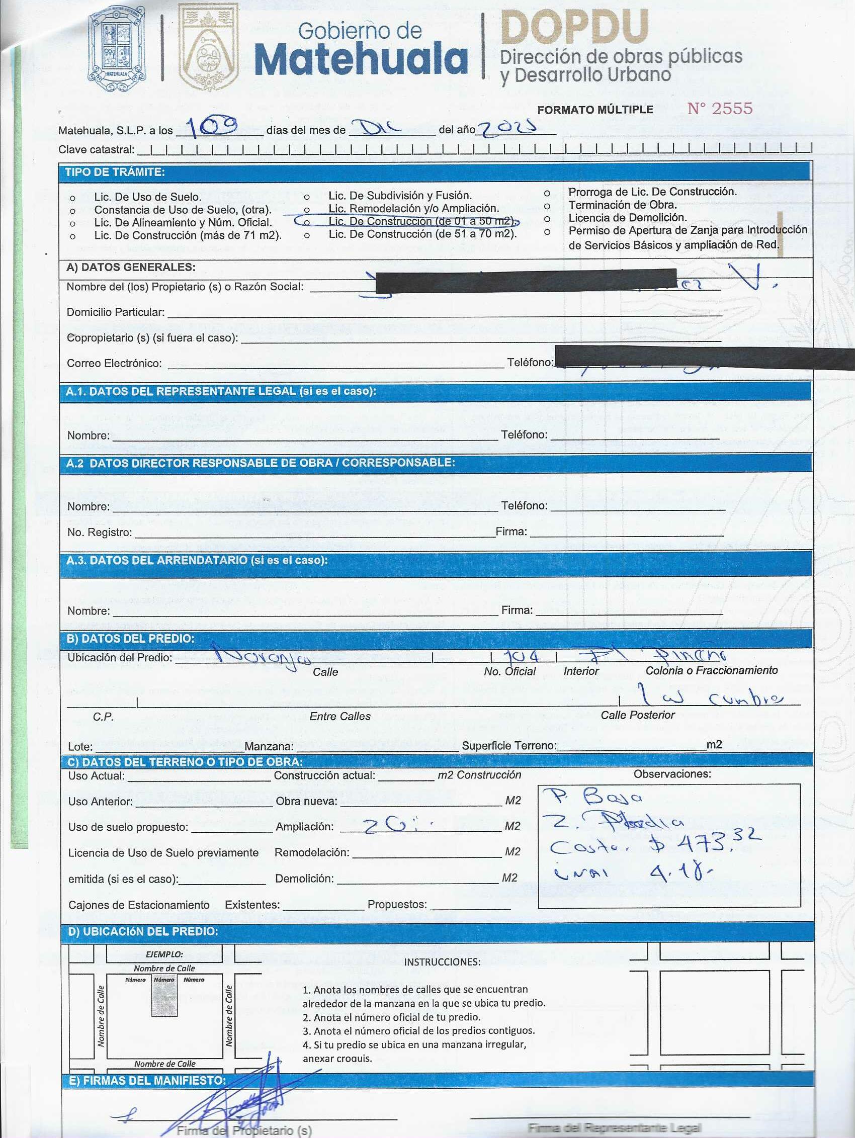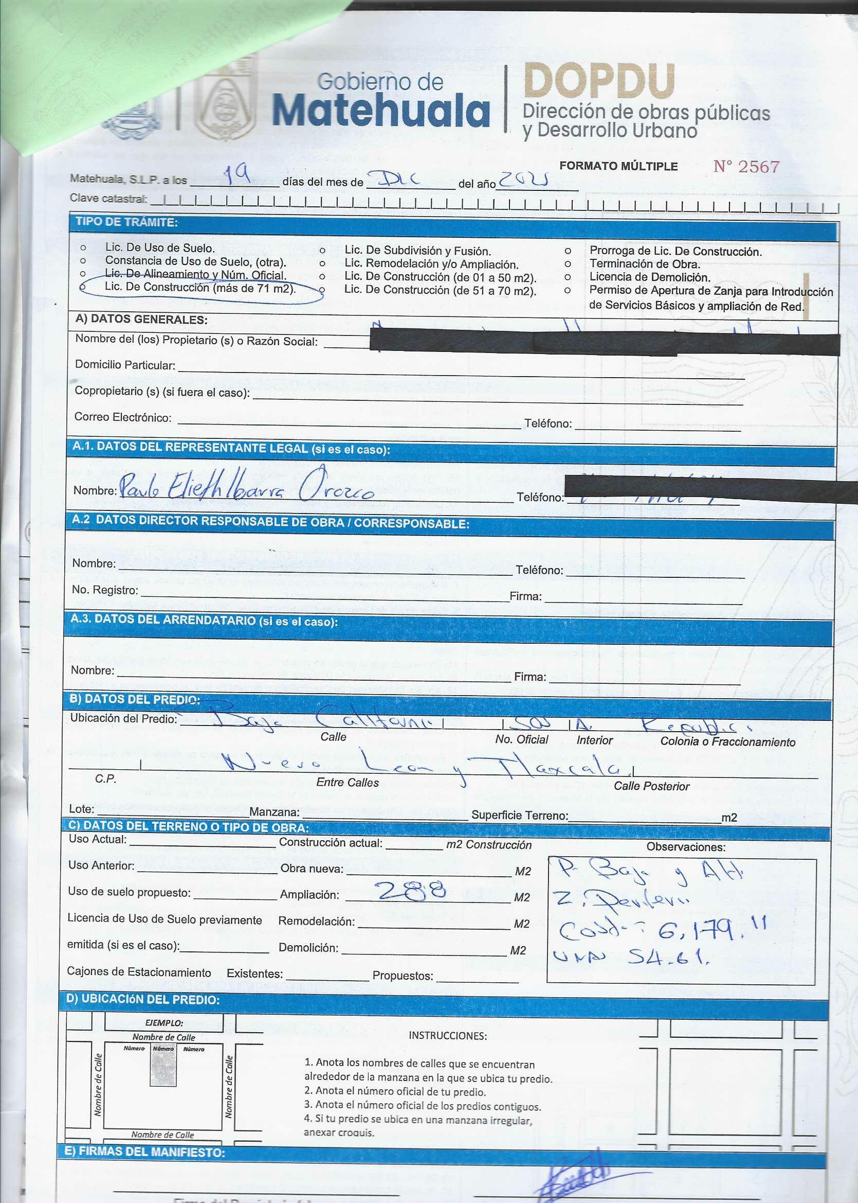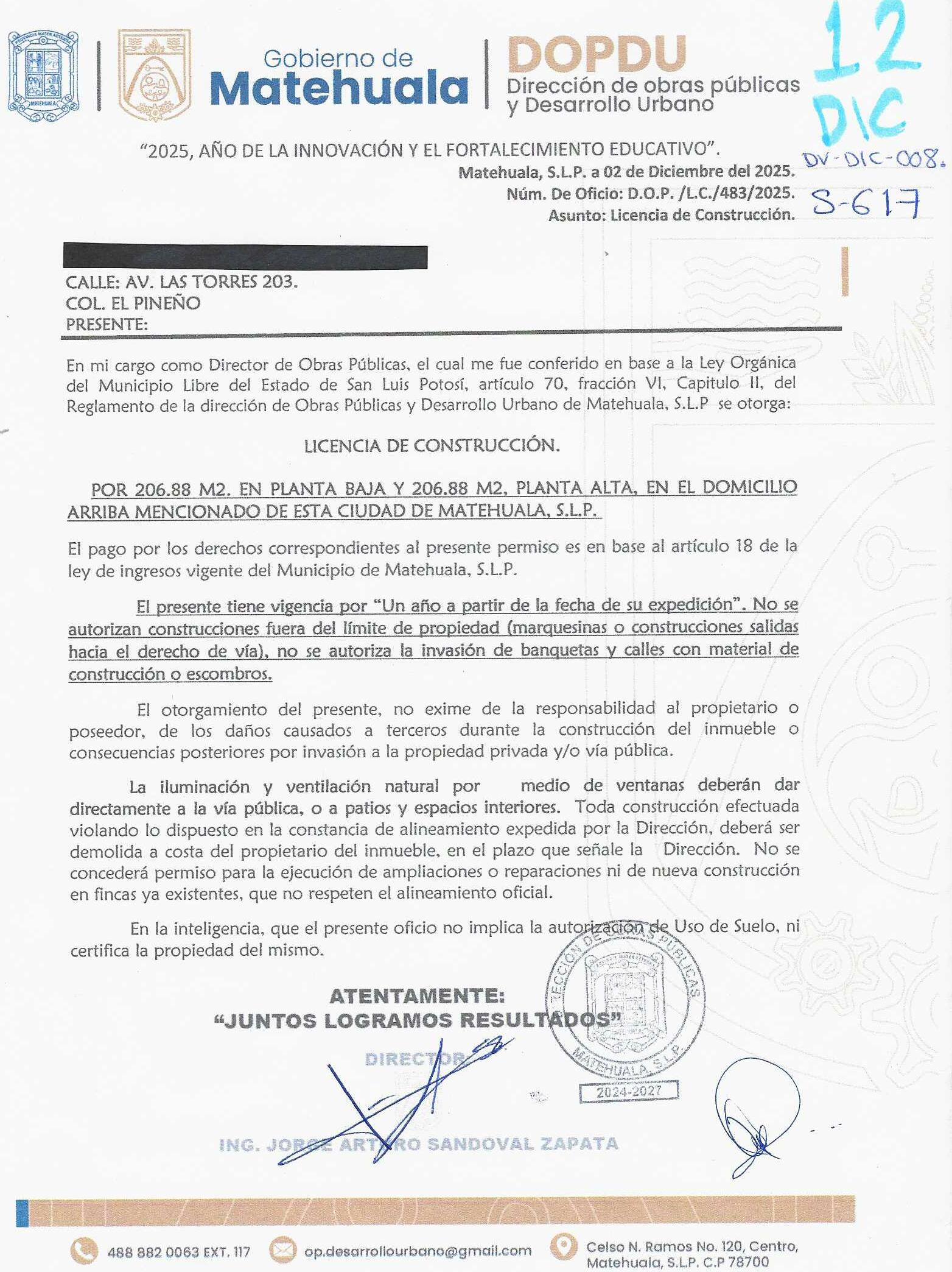 2025 01/12/2025 31/12/2025 DOP/LC/483/2025 CONSTRUCCION DANIELA TRISTAN ATILANO AV. LAS TORRES Calle AV. LAS TORRES 203 0 Colonia EL PINEÑO 20 MATEHUALA 20 MATEHUALA 24 San Luis Potosí 78730 "http://www.cegaipslp.org.mx/HV2025.nsf/nombre_de_la_vista/B6D51B7ED7269A5E06258D760070275C/$File/12+DANIELA+TRISTAN+ATILANO.jpg " 30/12/2025 30/12/2026 HABITACIONAL "http://www.cegaipslp.org.mx/HV2025.nsf/nombre_de_la_vista/96C9A83DABD26F3606258D760071A429/$File/12+DANIELA+TRISTAN+ATILANO.jpg " DIRECCIÓN DE OBRAS PÚBLICAS Y DESARROLLO URBANO 05/01/2026 COBRO NORMAL