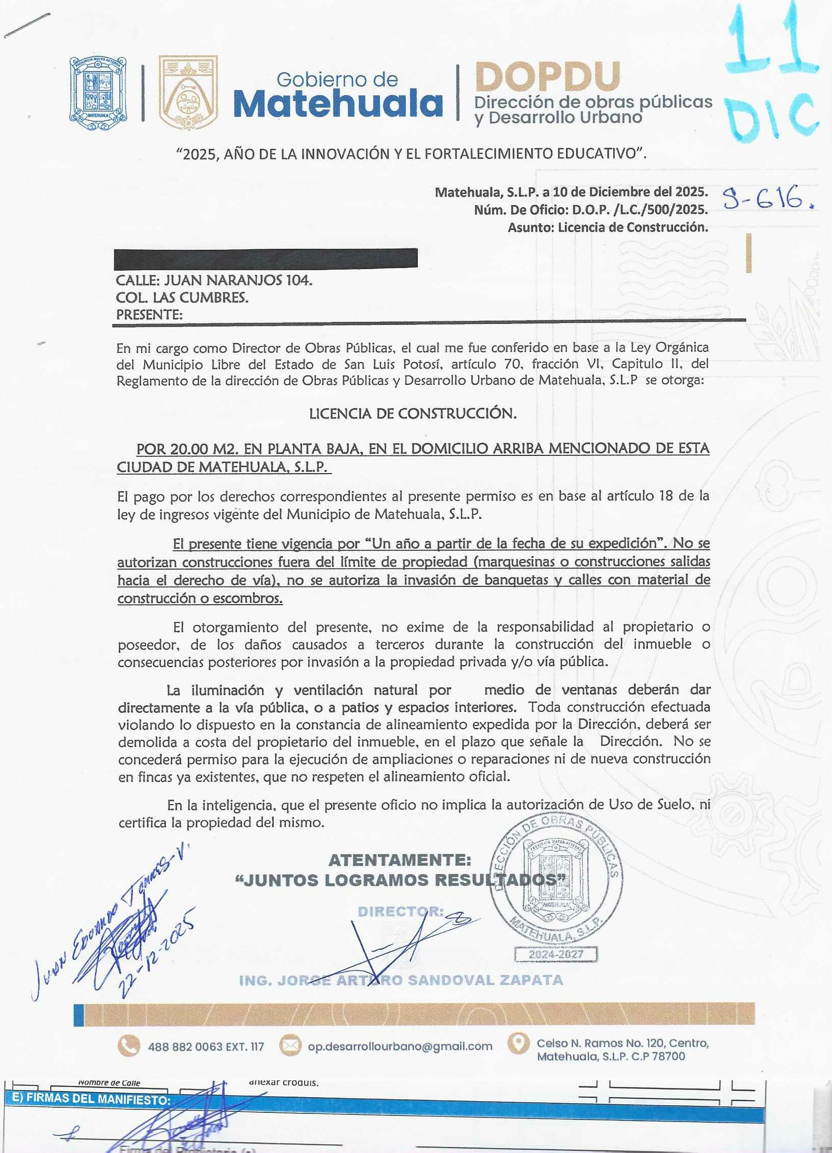 2025 01/12/2025 31/12/2025 DOP/LC/500/2025 CONSTRUCCION JUAN EDUARDO TORRES VELAZQUEZ JUAN NARANJOS Calle JUAN NARANJOS 104 0 Colonia LAS CUMBRES 20 MATEHUALA 20 MATEHUALA 24 San Luis Potosí 78759 "http://www.cegaipslp.org.mx/HV2025.nsf/nombre_de_la_vista/DF0D7CE73926CDF106258D76006FFFBD/$File/11+JUAN+EDUARDO+TORRES+VELAZQUEZ.jpg " 10/12/2025 10/12/2026 HABITACIONAL "http://www.cegaipslp.org.mx/HV2025.nsf/nombre_de_la_vista/C3C8BA350998B57806258D76007199D6/$File/11+JUAN+EDUARDO+TORRES++VELAZQUEZ.jpg " DIRECCIÓN DE OBRAS PÚBLICAS Y DESARROLLO URBANO 05/01/2026 COBRO NORMAL