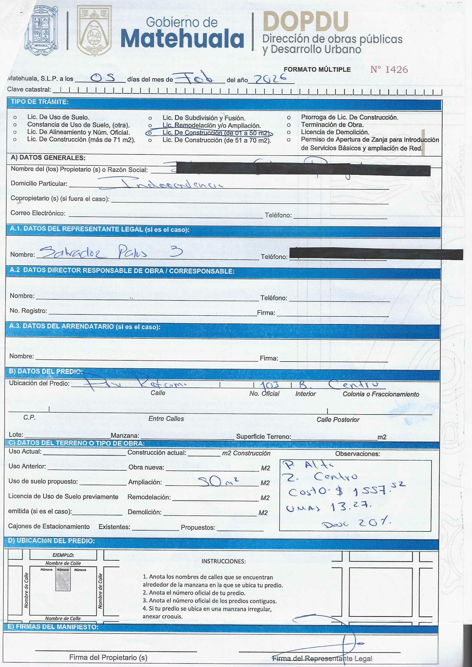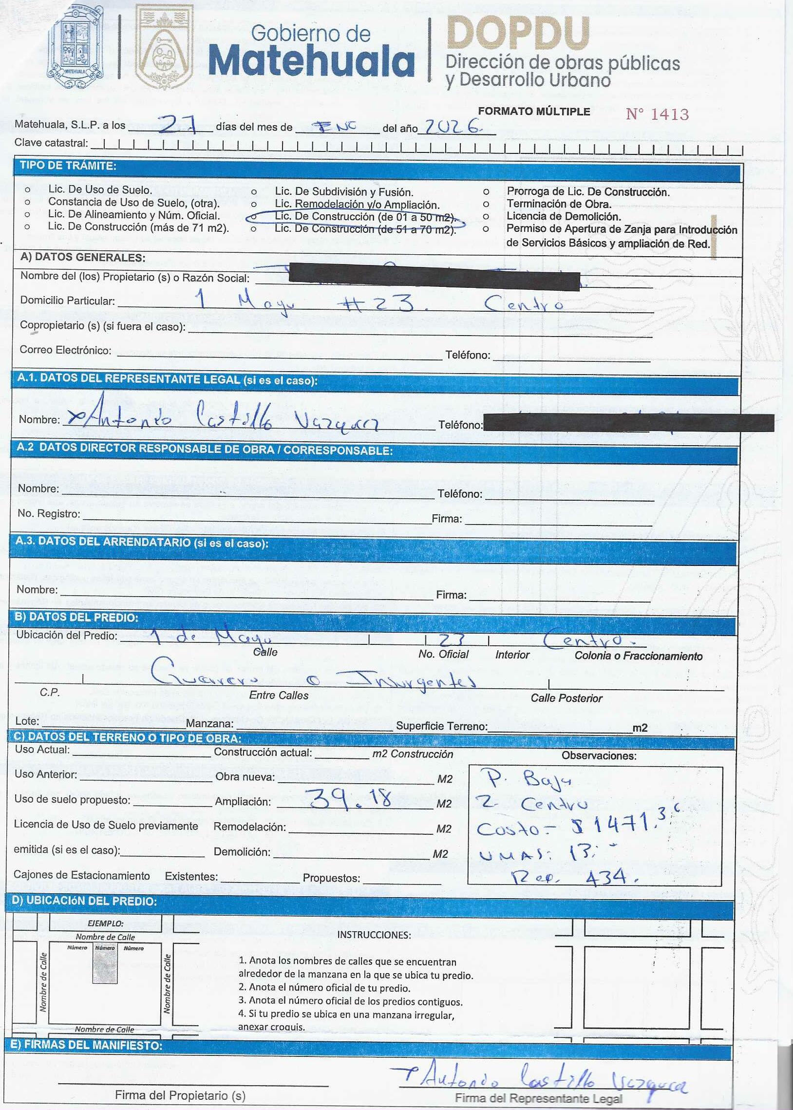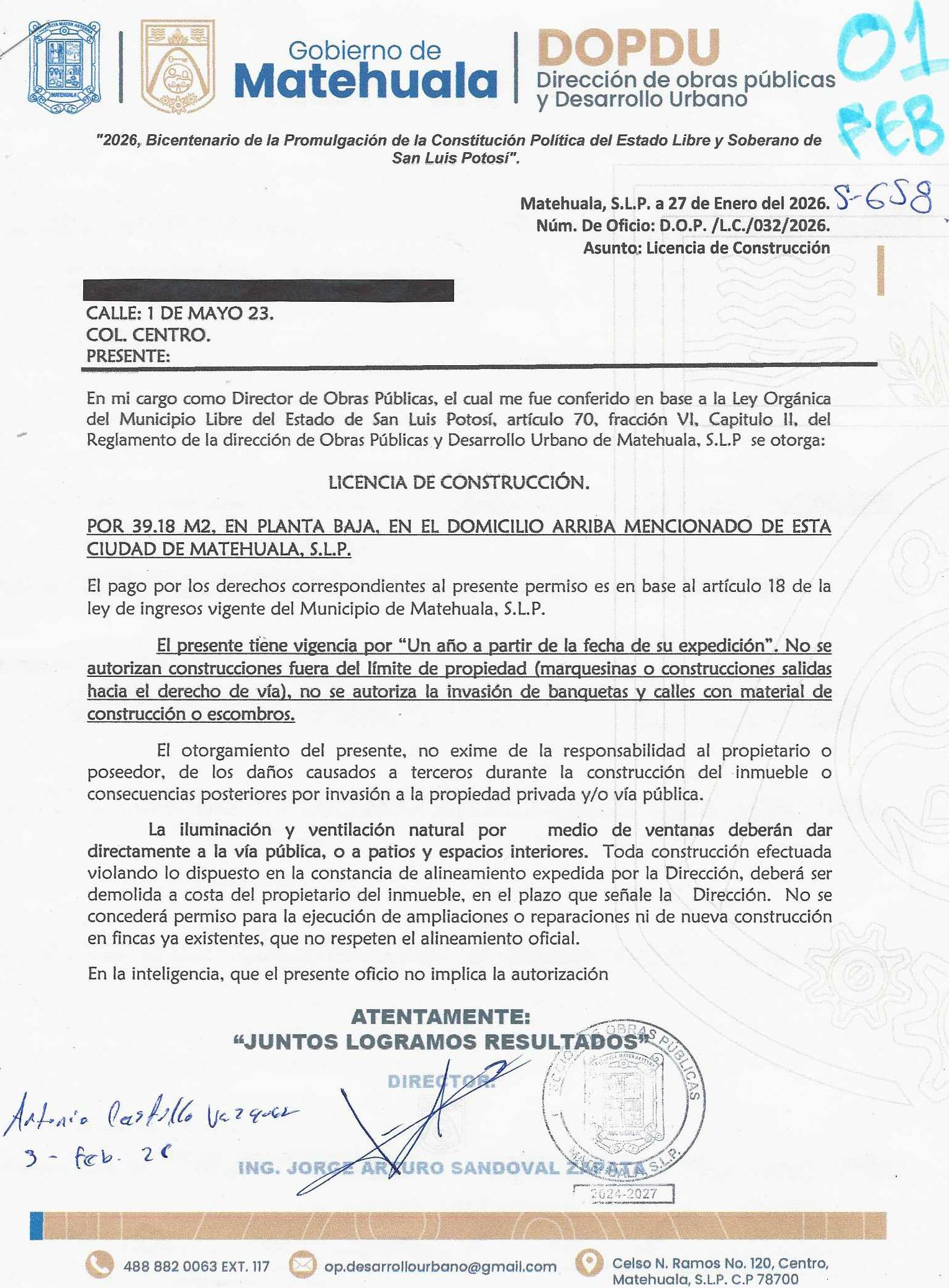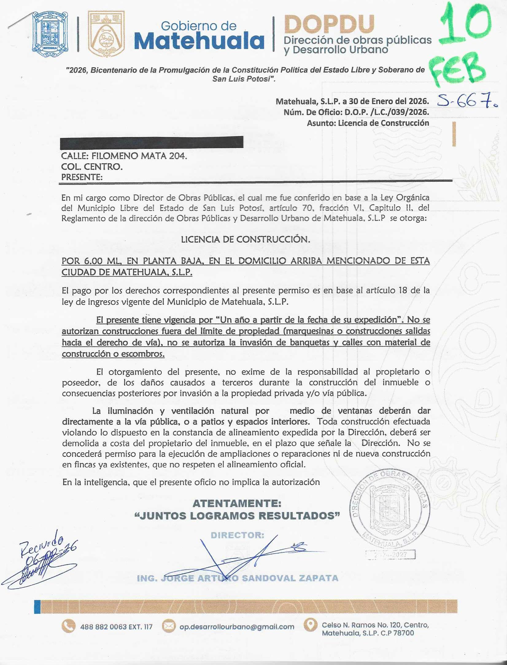 2026 01/02/2026 28/02/2026 DOP/LC/039/2026 CONSTRUCCION JOSE FRANCISCO MARTINEZ SUSTAITA no se genero información Calle FILOMENO MATA 204 0 Colonia CENTRO 20 MATEHUALA 20 MATEHUALA 24 San Luis Potosí 78700 "http://www.cegaipslp.org.mx/HV2026.nsf/nombre_de_la_vista/9639D914F2CCED0006258DB60054B4DC/$File/10+JOSE+FRANCISCO+MARTINEZ+SUSTAITA.jpg " 06/02/2026 06/02/2027 HABITACIONAL "http://www.cegaipslp.org.mx/HV2026.nsf/nombre_de_la_vista/FE068C37EB6001C606258DB500556988/$File/10+JOSE+FRANCISCO+MARTINEZ+SUSTAITA.jpg " DIRECCIÓN DE OBRAS PÚBLICAS Y DESARROLLO URBANO 10/03/2026 COBRO NORMAL