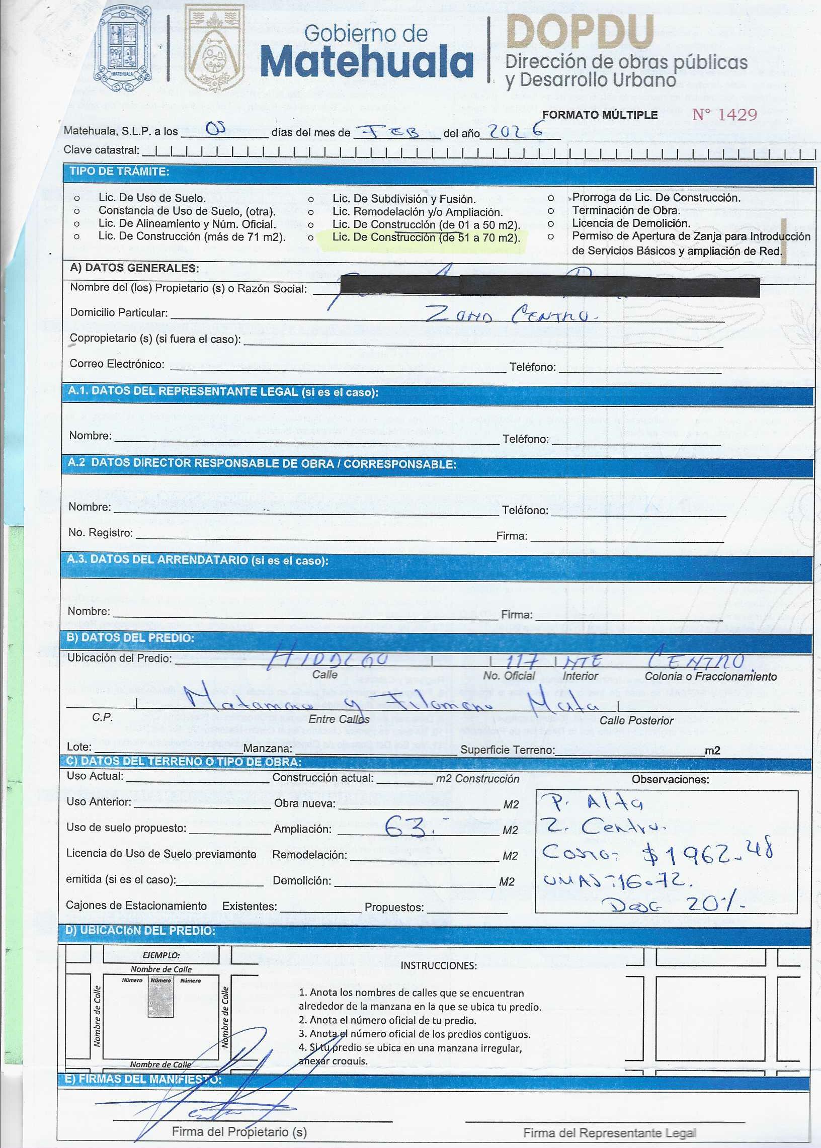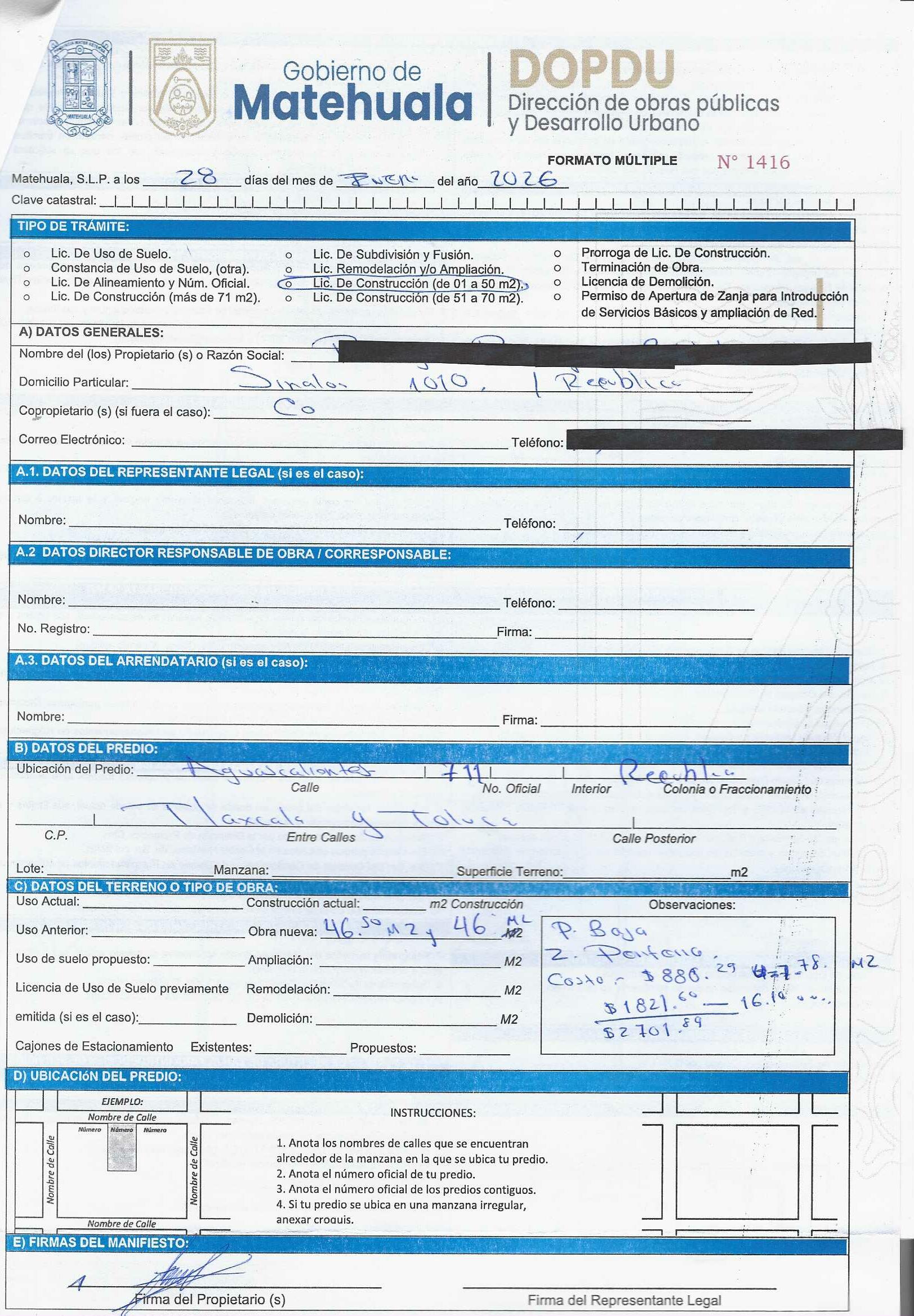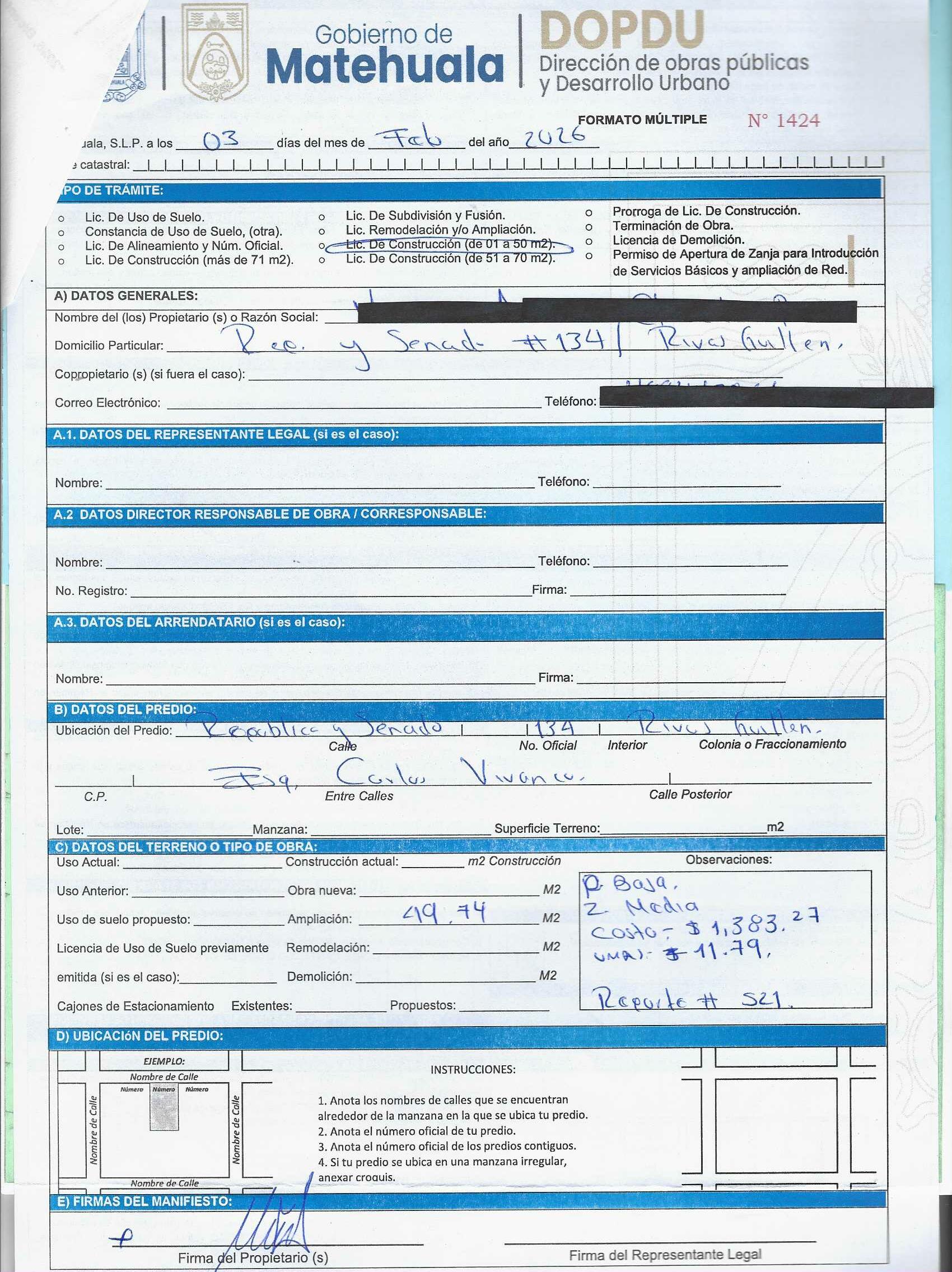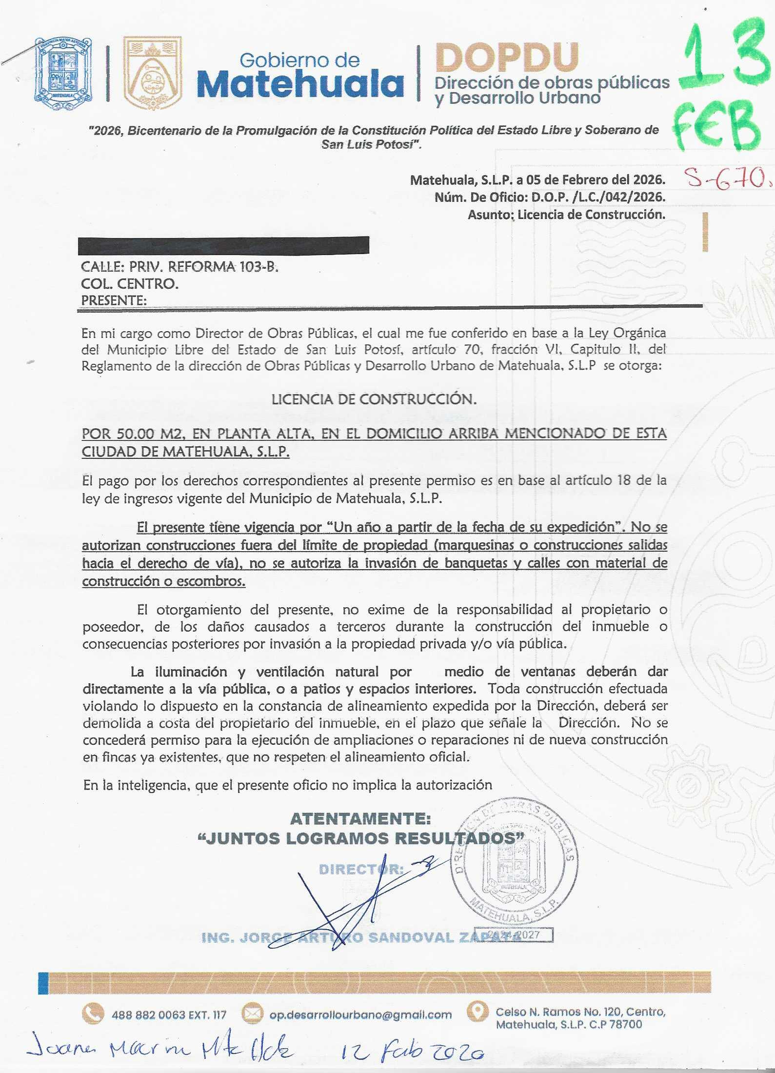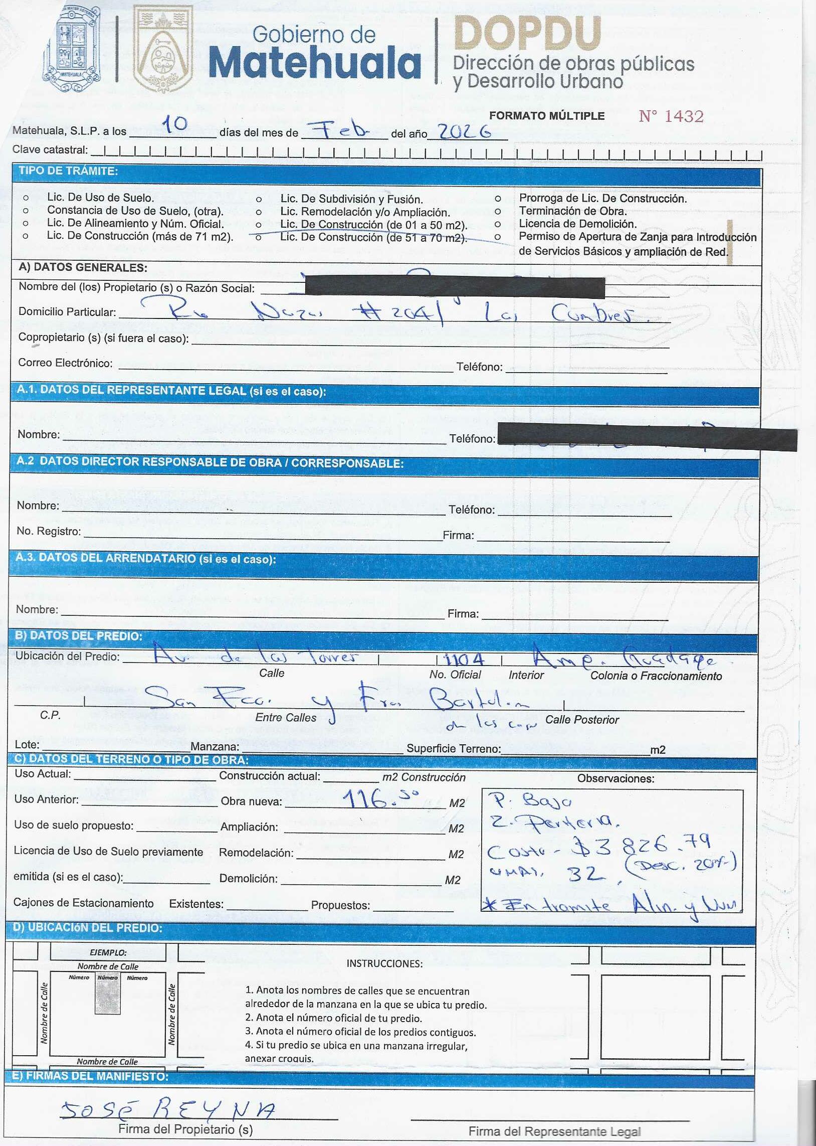2026 01/02/2026 28/02/2026 DOP/LC/039/2026 CONSTRUCCION JOSE FRANCISCO MARTINEZ SUSTAITA no se genero información Calle FILOMENO MATA 204 0 Colonia CENTRO 20 MATEHUALA 20 MATEHUALA 24 San Luis Potosí 78700 "http://www.cegaipslp.org.mx/HV2026.nsf/nombre_de_la_vista/9639D914F2CCED0006258DB60054B4DC/$File/10+JOSE+FRANCISCO+MARTINEZ+SUSTAITA.jpg " 06/02/2026 06/02/2027 HABITACIONAL "http://www.cegaipslp.org.mx/HV2026.nsf/nombre_de_la_vista/FE068C37EB6001C606258DB500556988/$File/10+JOSE+FRANCISCO+MARTINEZ+SUSTAITA.jpg " DIRECCIÓN DE OBRAS PÚBLICAS Y DESARROLLO URBANO 10/03/2026 COBRO NORMAL