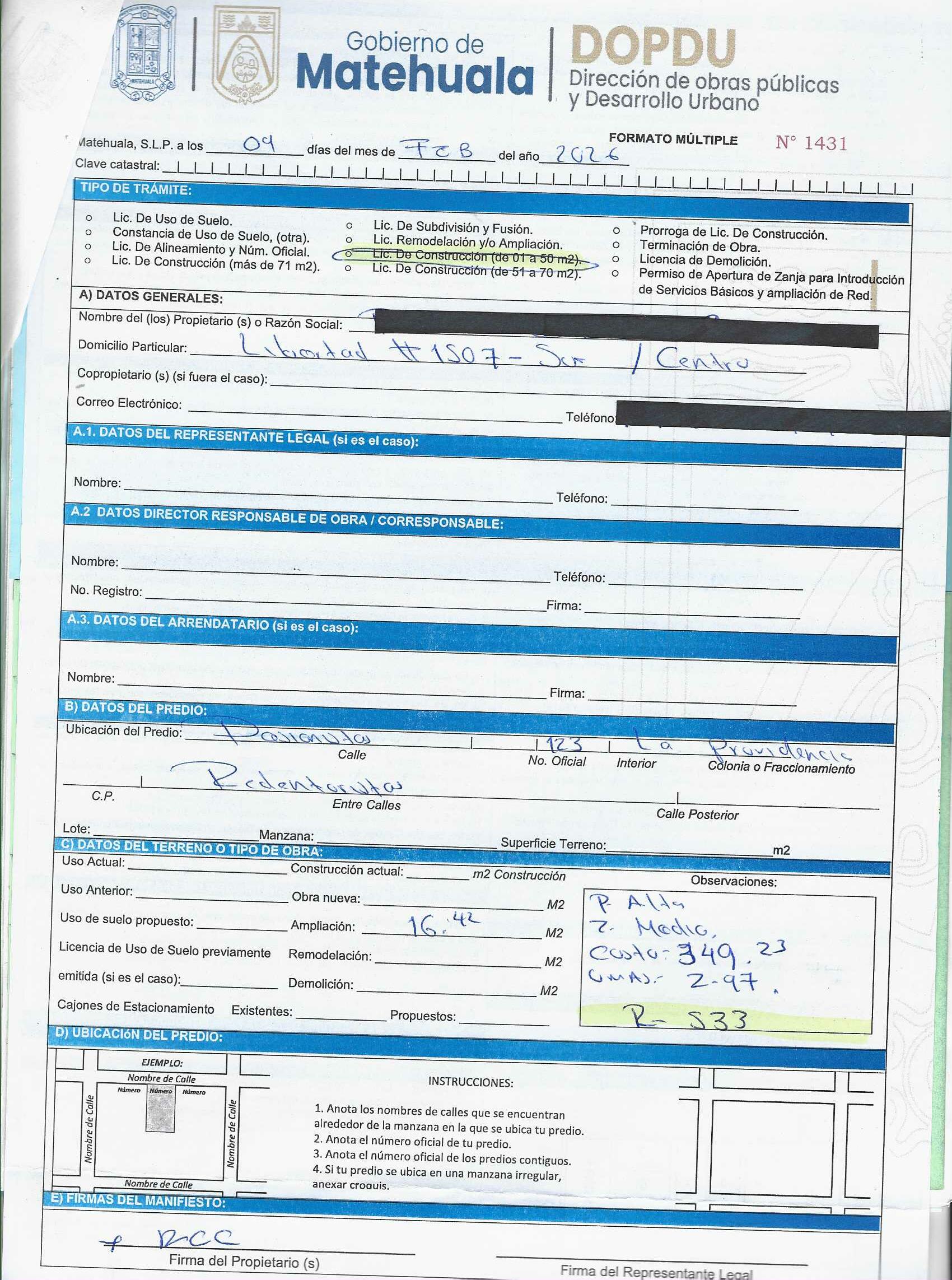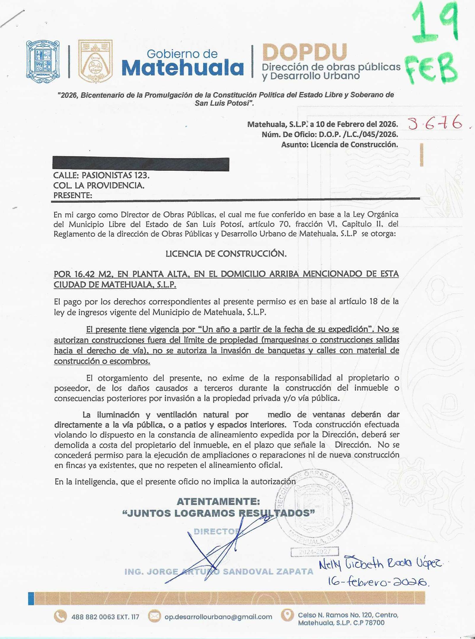 2026 01/02/2026 28/02/2026 DOP/LC/045/2026 CONSTRUCCION RICARDO CARRIZALES CRUZ no se genero información Calle PASIONISTAS 123 0 Colonia LA PROVIDENCIA 20 MATEHUALA 20 MATEHUALA 24 San Luis Potosí 78796 "http://www.cegaipslp.org.mx/HV2026.nsf/nombre_de_la_vista/E33674D30695B47406258DB600561AC5/$File/19+RICARDO+CARRIZALES+CRUZ.jpg " 16/02/2026 16/02/2027 HABITACIONAL "http://www.cegaipslp.org.mx/HV2026.nsf/nombre_de_la_vista/0394DF743C25AA8006258DB50057F500/$File/19+RICARDO+CARRIZALES+CRUZ.jpg " DIRECCIÓN DE OBRAS PÚBLICAS Y DESARROLLO URBANO 10/03/2026 COBRO NORMAL
