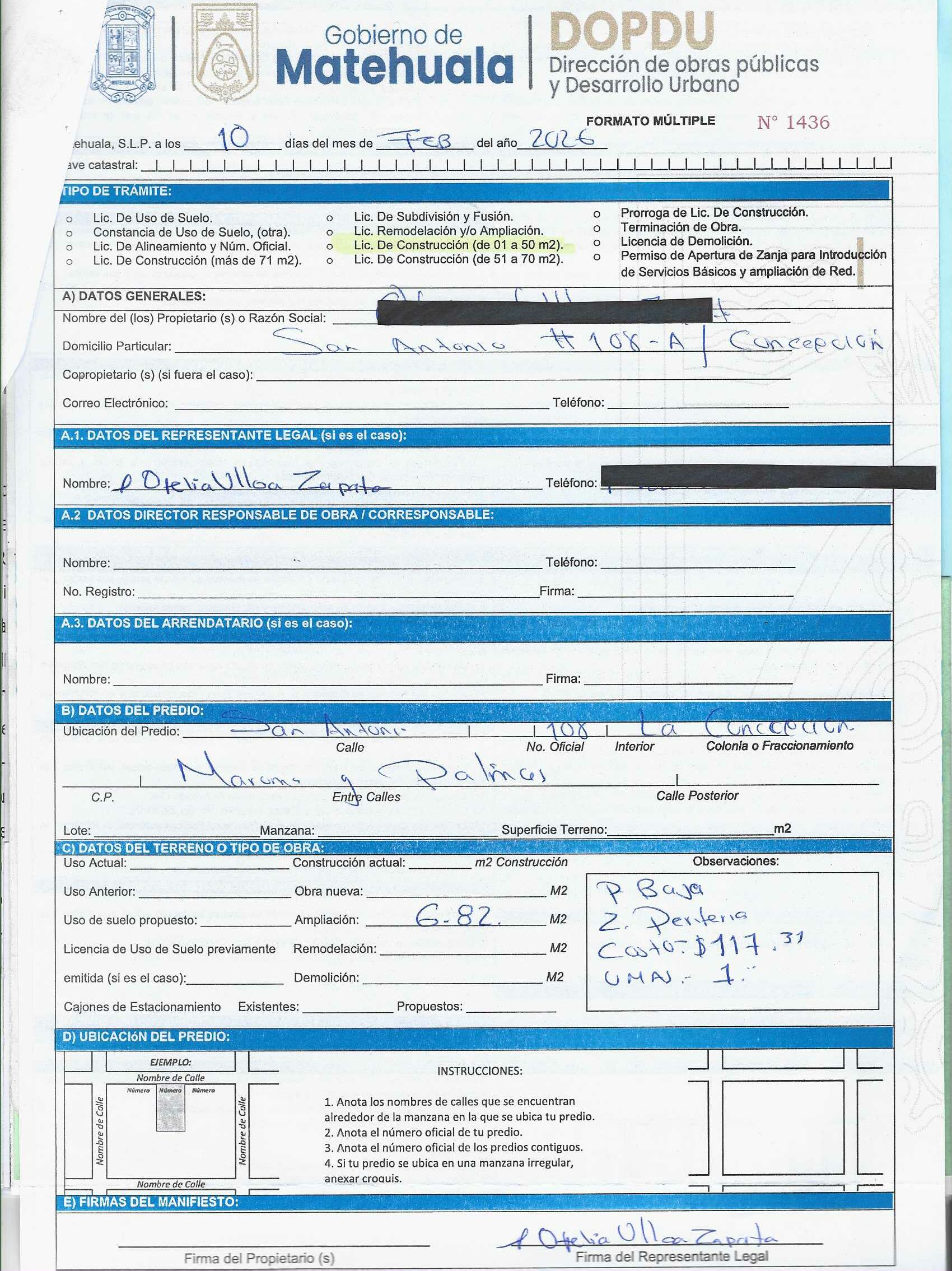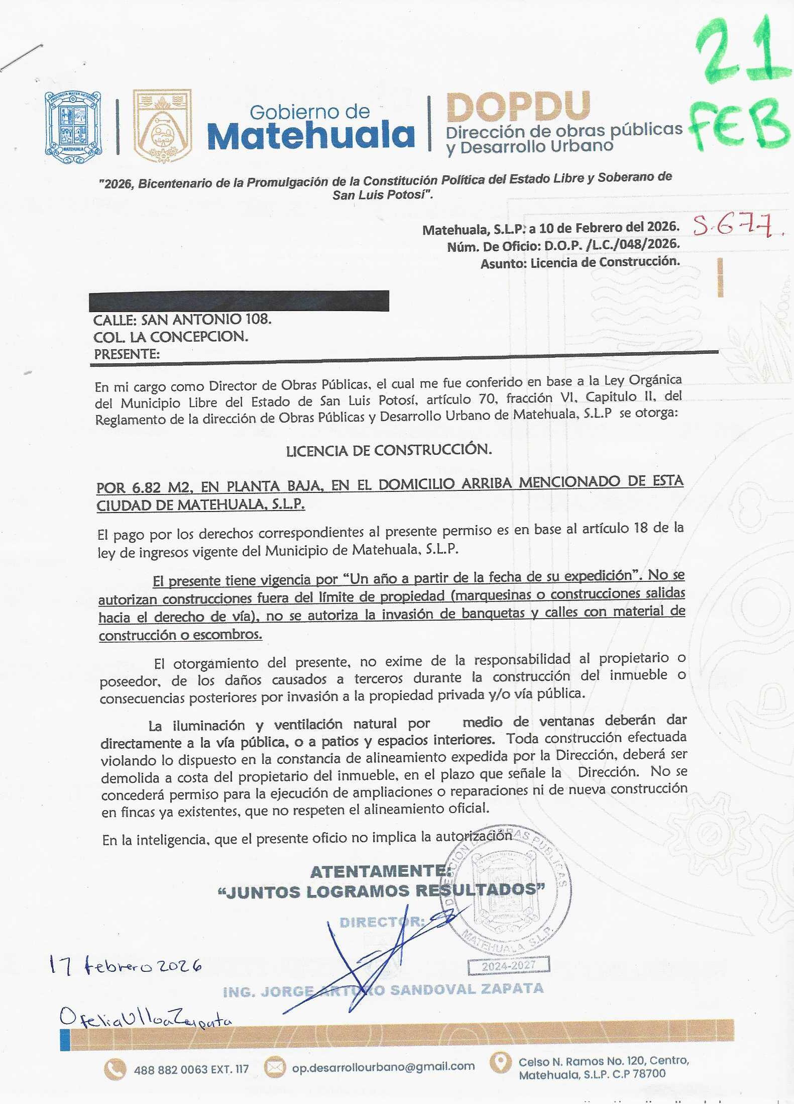 2026 01/02/2026 28/02/2026 DOP/LC/048/2026 CONSTRUCCION OFELIA ULLOA ZAPATA no se genero información Calle SAN ANTONIO 108 0 Colonia LA CONCEPCION 20 MATEHUALA 20 MATEHUALA 24 San Luis Potosí 78784 "http://www.cegaipslp.org.mx/HV2026.nsf/nombre_de_la_vista/05D6D6C85A78BA9C06258DB600563E2D/$File/21+OFELIA+ULLOA+ZAPATA.jpg " 17/02/2026 17/02/2027 HABITACIONAL "http://www.cegaipslp.org.mx/HV2026.nsf/nombre_de_la_vista/A9F1479FA9457EEA06258DB500580DFC/$File/21+OFELIA+ULLOA+ZAPATA.jpg " DIRECCIÓN DE OBRAS PÚBLICAS Y DESARROLLO URBANO 10/03/2026 COBRO NORMAL