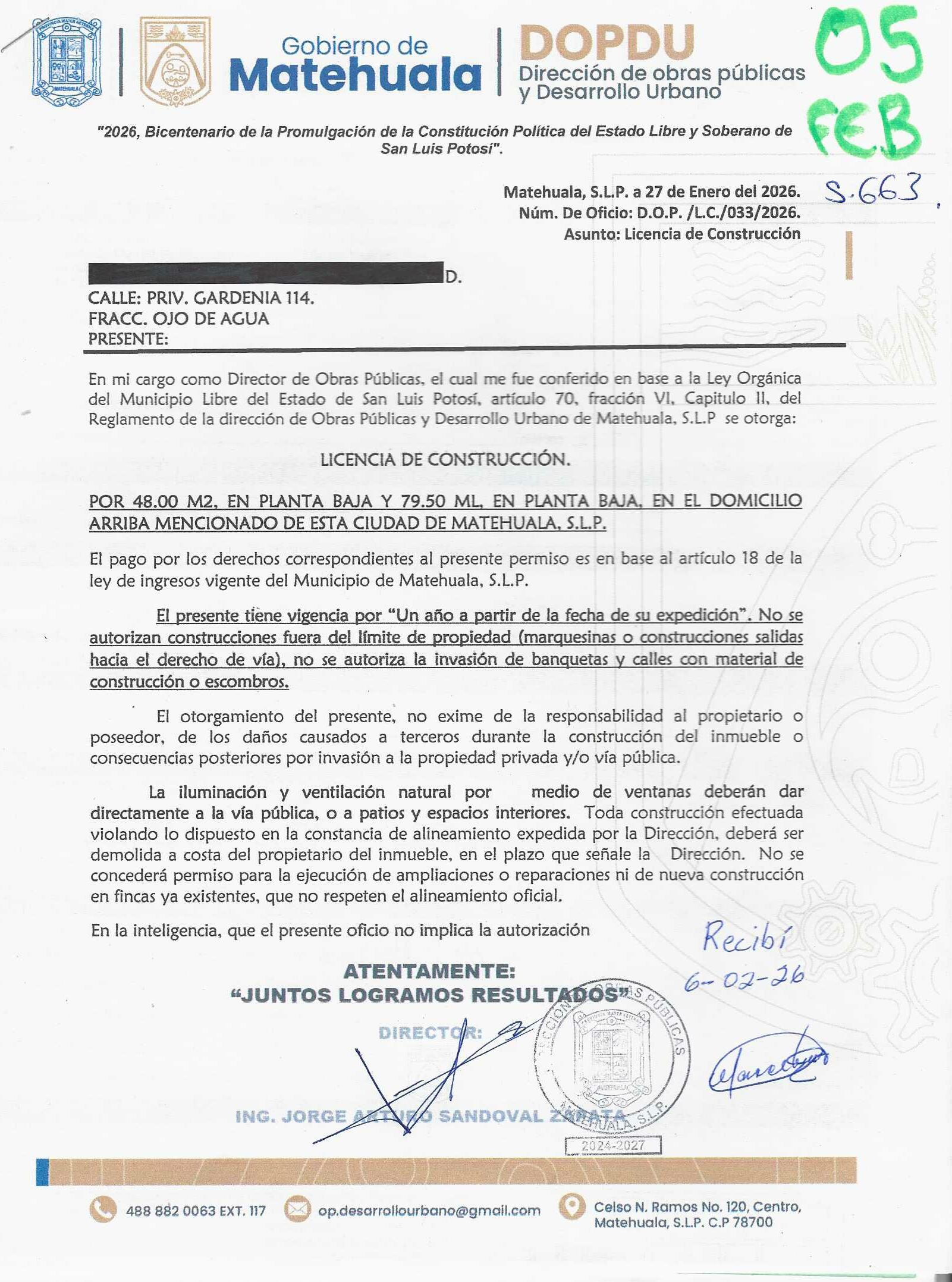 2026 01/02/2026 28/02/2026 DOP/LC/033/2026 CONSTRUCCION MARCELINA MENDOZA PEDROZA no se genero información Calle PRIV. GARDENIA 114 0 Fraccionamiento OJO DE AGUA 20 MATEHUALA 20 MATEHUALA 24 San Luis Potosí 78725 "http://www.cegaipslp.org.mx/HV2026.nsf/nombre_de_la_vista/B6F023E0562736D606258DB50072660C/$File/05+MARCELINA+MENDOZA+PEDROZA.jpg " 27/01/2026 27/01/2027 HABITACIONAL "http://www.cegaipslp.org.mx/HV2026.nsf/nombre_de_la_vista/0E261C04B98CA76006258DB500550F36/$File/05+MARCELINA+MENDOZA+PEDROZA.jpg " DIRECCIÓN DE OBRAS PÚBLICAS Y DESARROLLO URBANO 10/03/2026 50 % DESCUENTO INSEN