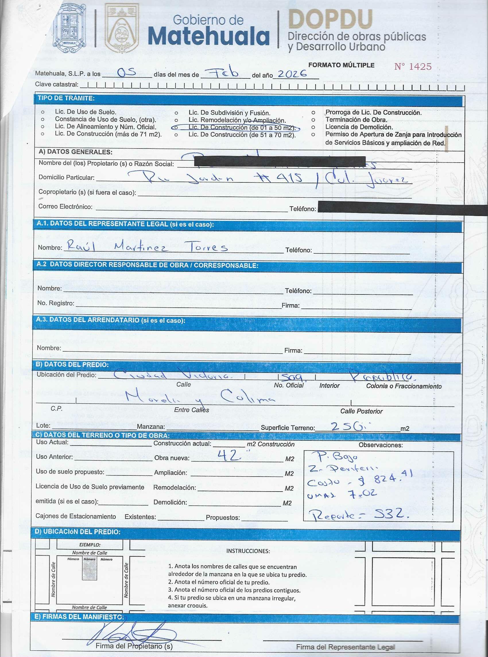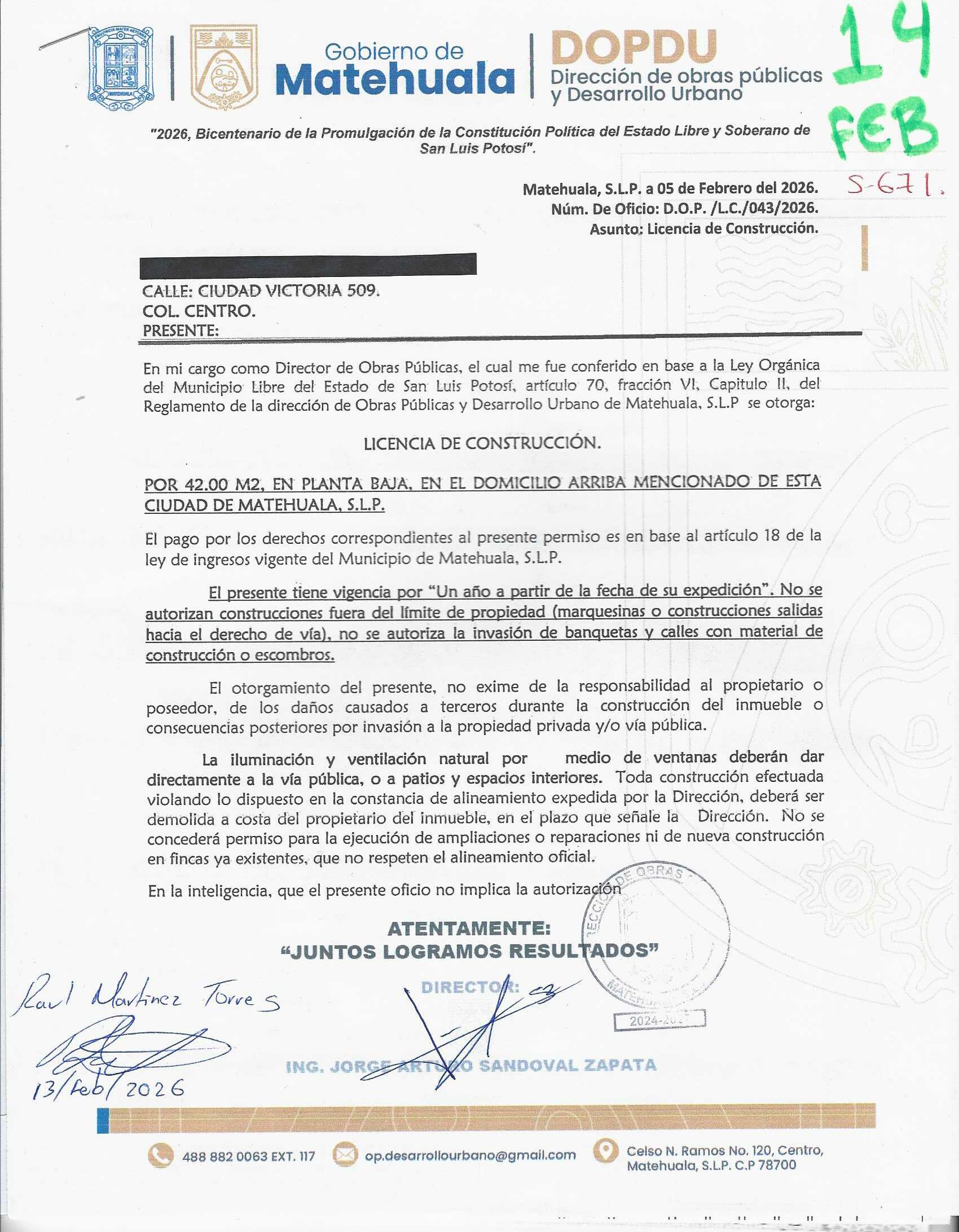 2026 01/02/2026 28/02/2026 DOP/LC/043/2026 CONSTRUCCION RAUL MARTINEZ TORRES no se genero información Calle CIUDAD VICTORIA 509 0 Colonia CENTRO 20 MATEHUALA 20 MATEHUALA 24 San Luis Potosí 78700 "http://www.cegaipslp.org.mx/HV2026.nsf/nombre_de_la_vista/109EA061846AB71F06258DB60055DE23/$File/14+RAUL+MARTINEZ+TORRES.jpg " 05/02/2026 05/02/2027 HABITACIONAL "http://www.cegaipslp.org.mx/HV2026.nsf/nombre_de_la_vista/4F14122B8F0EA7C806258DB50057A6C3/$File/14+RAUL+MARTINEZ+TORRES.jpg " DIRECCIÓN DE OBRAS PÚBLICAS Y DESARROLLO URBANO 10/03/2026 COBRO NORMAL