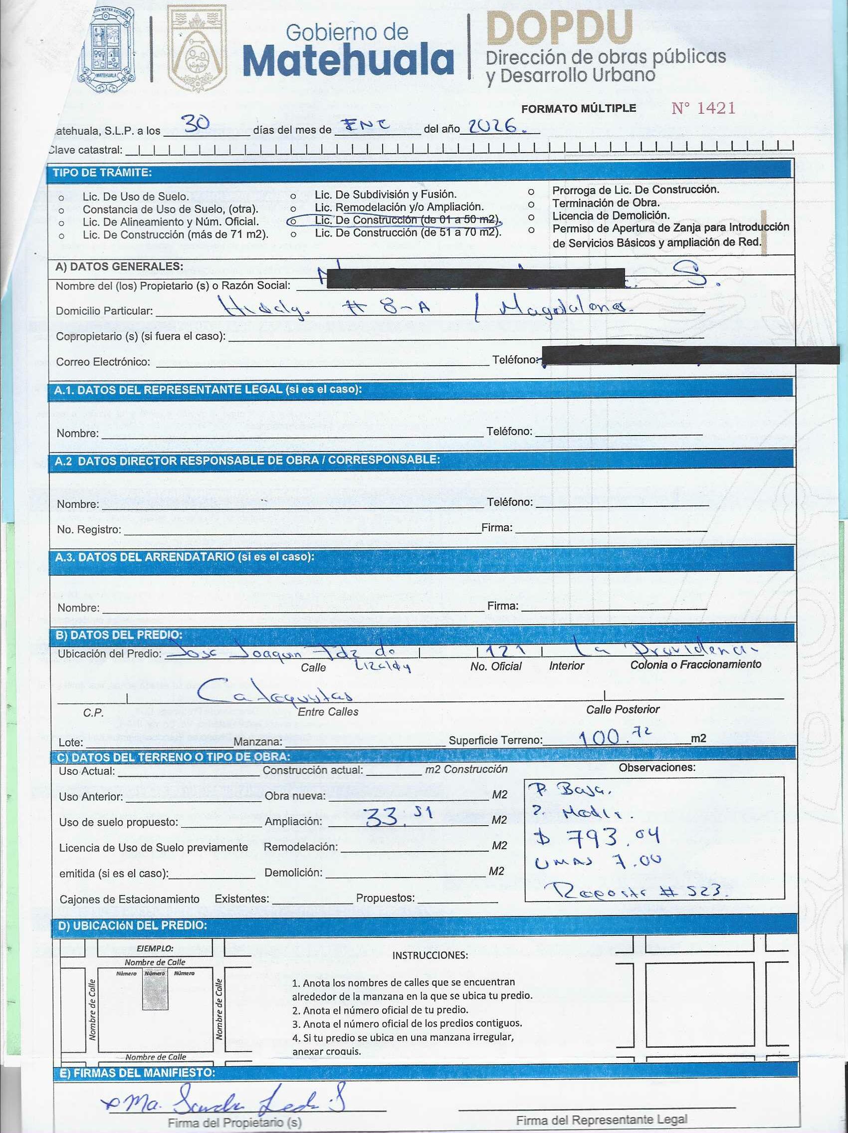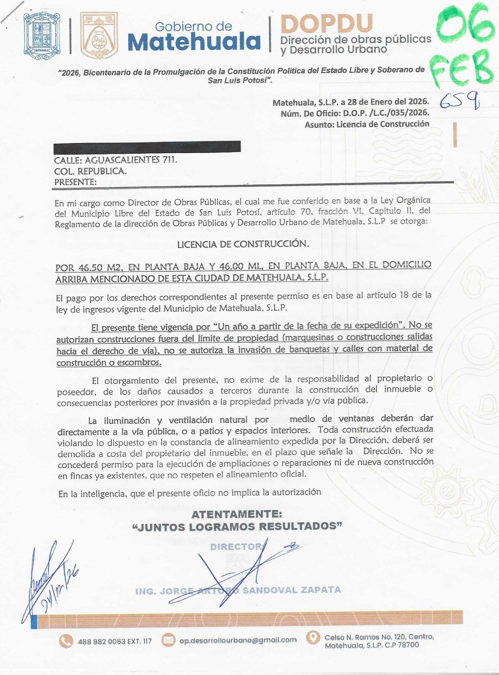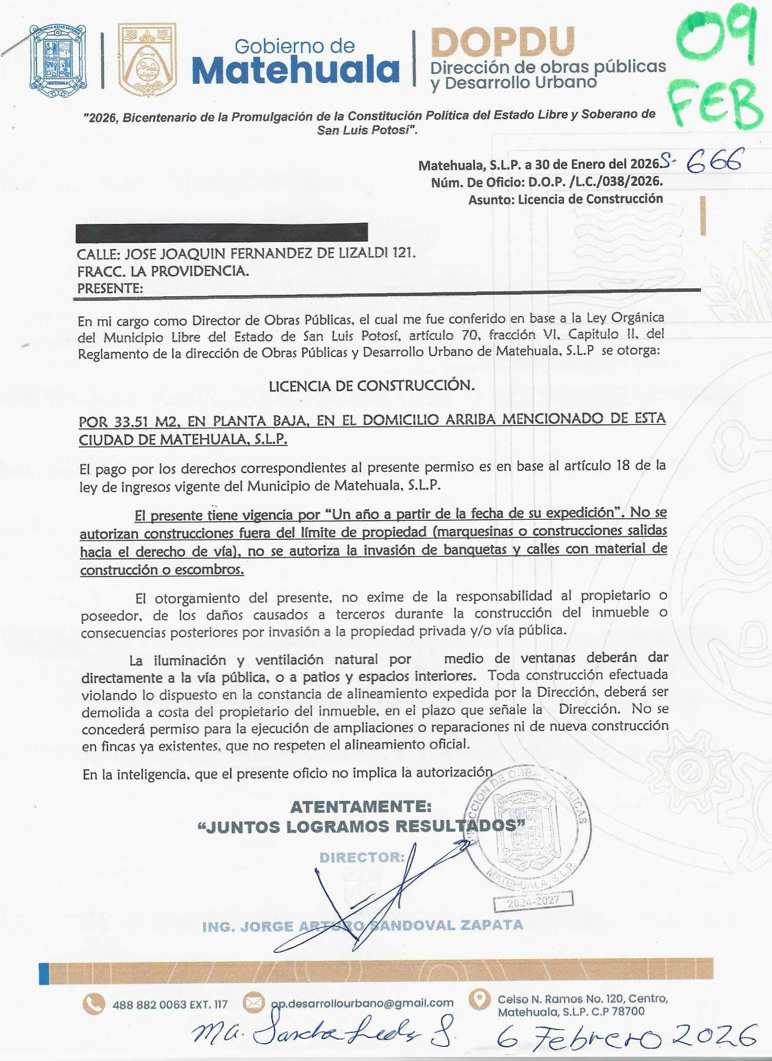2026 01/02/2026 28/02/2026 DOP/LC/038/2026 CONSTRUCCION MA. SANDRA LEDESMA SALAZAR no se genero información Calle JOSE JOAQUIN FERNANDEZ DE LIZALDI 121 0 Fraccionamiento LA PROVIDENCIA 20 MATEHUALA 20 MATEHUALA 24 San Luis Potosí 78796 "http://www.cegaipslp.org.mx/HV2026.nsf/nombre_de_la_vista/22FFA5EB5A4B01DB06258DB600541EEE/$File/09+MA.+SANDRA+LEDESMA+SALAZAR.jpg " 30/01/2026 30/01/2027 HABITACIONAL "http://www.cegaipslp.org.mx/HV2026.nsf/nombre_de_la_vista/D0C2C81D5CAB0D0F06258DB500555F2E/$File/09+MA.+SANDRA+LEDESMA+SALAZAR.jpg " DIRECCIÓN DE OBRAS PÚBLICAS Y DESARROLLO URBANO 10/03/2026 COBRO NORMAL
