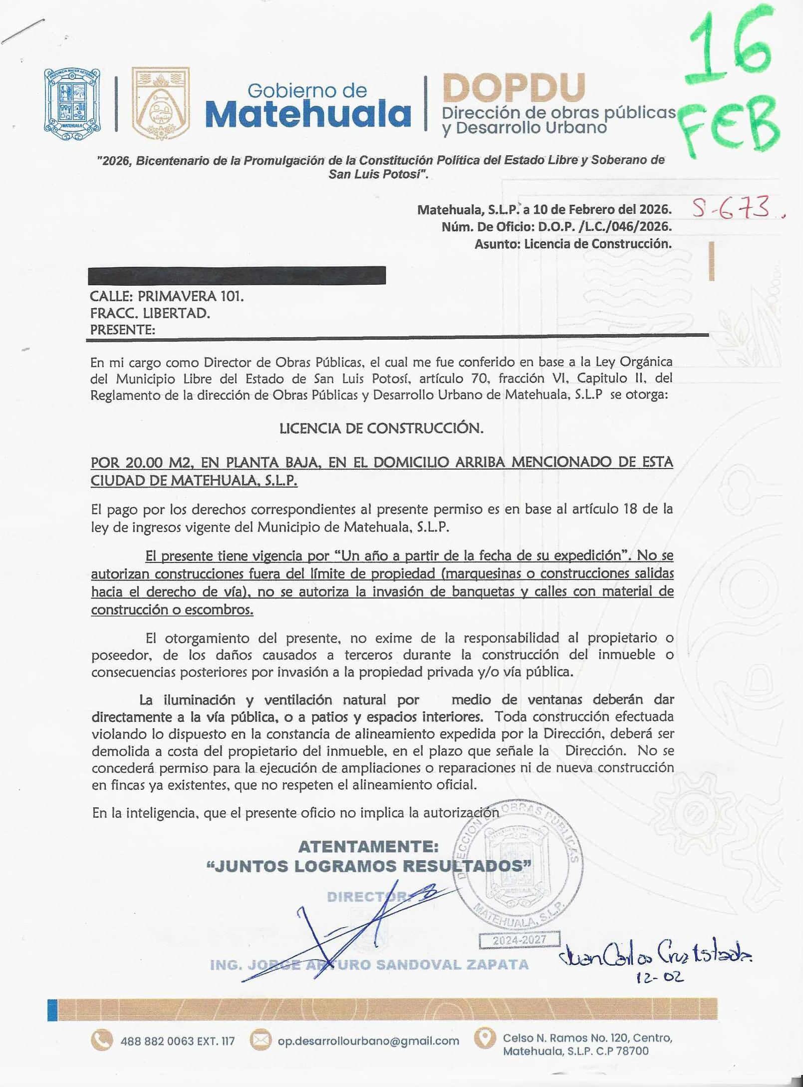 2026 01/02/2026 28/02/2026 DOP/LC/046/2026 CONSTRUCCION JUAN CARLOS CRUZ ESTRADA no se genero información Calle PRIMAVERA 101 0 Fraccionamiento LIBERTAD 20 MATEHUALA 20 MATEHUALA 24 San Luis Potosí 78783 "http://www.cegaipslp.org.mx/HV2026.nsf/nombre_de_la_vista/66CF0D167C0C810606258DB60055FDC9/$File/16+JUAN+CARLOS+CRUZ+ESTRADA.jpg " 12/02/2026 12/02/2027 HABITACIONAL "http://www.cegaipslp.org.mx/HV2026.nsf/nombre_de_la_vista/1C5CC0FCA09418F206258DB50057D29F/$File/16+JUAN+CARLOS+CRUZ+ESTRADA.jpg " DIRECCIÓN DE OBRAS PÚBLICAS Y DESARROLLO URBANO 10/03/2026 20 % DESCUENTO