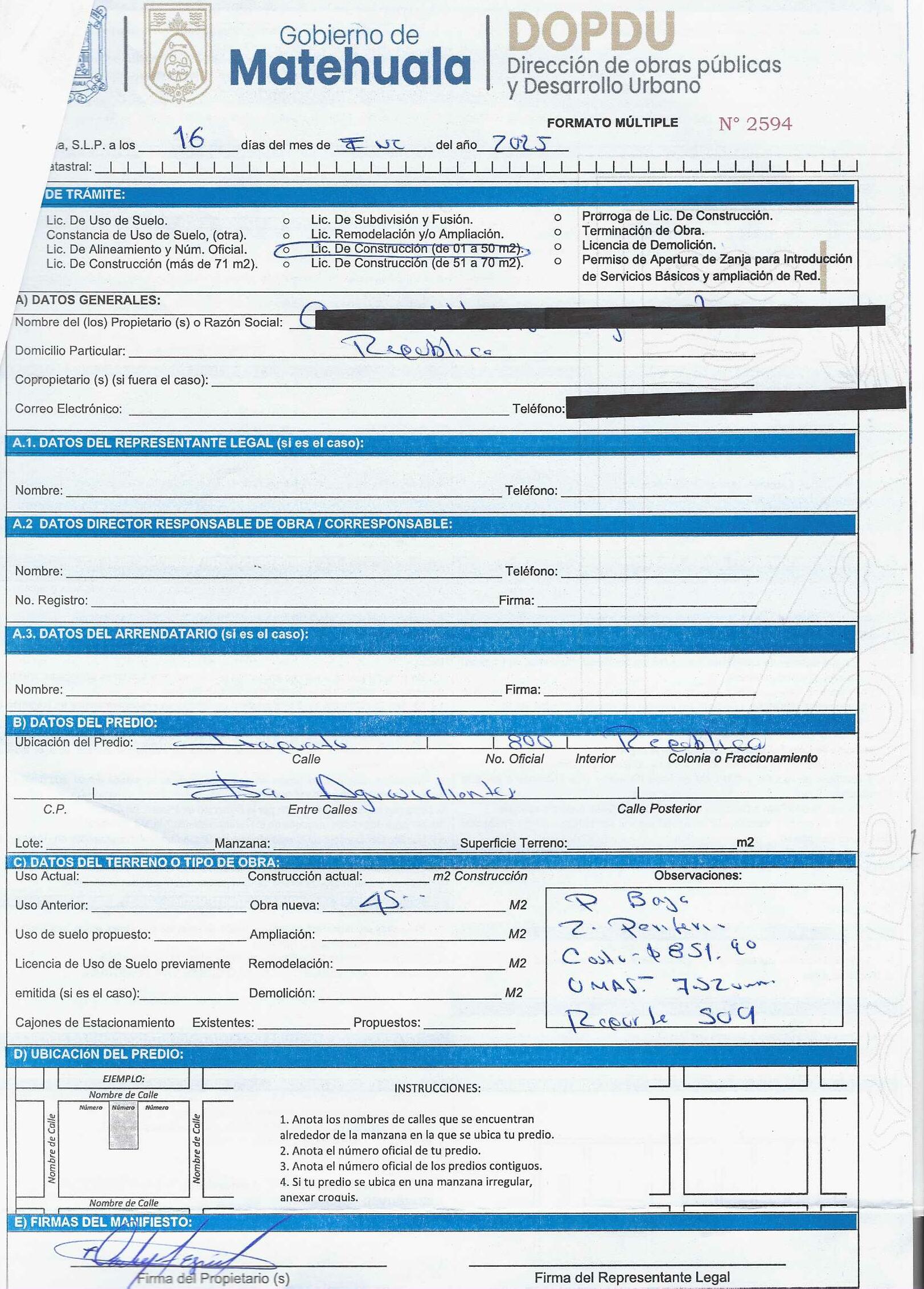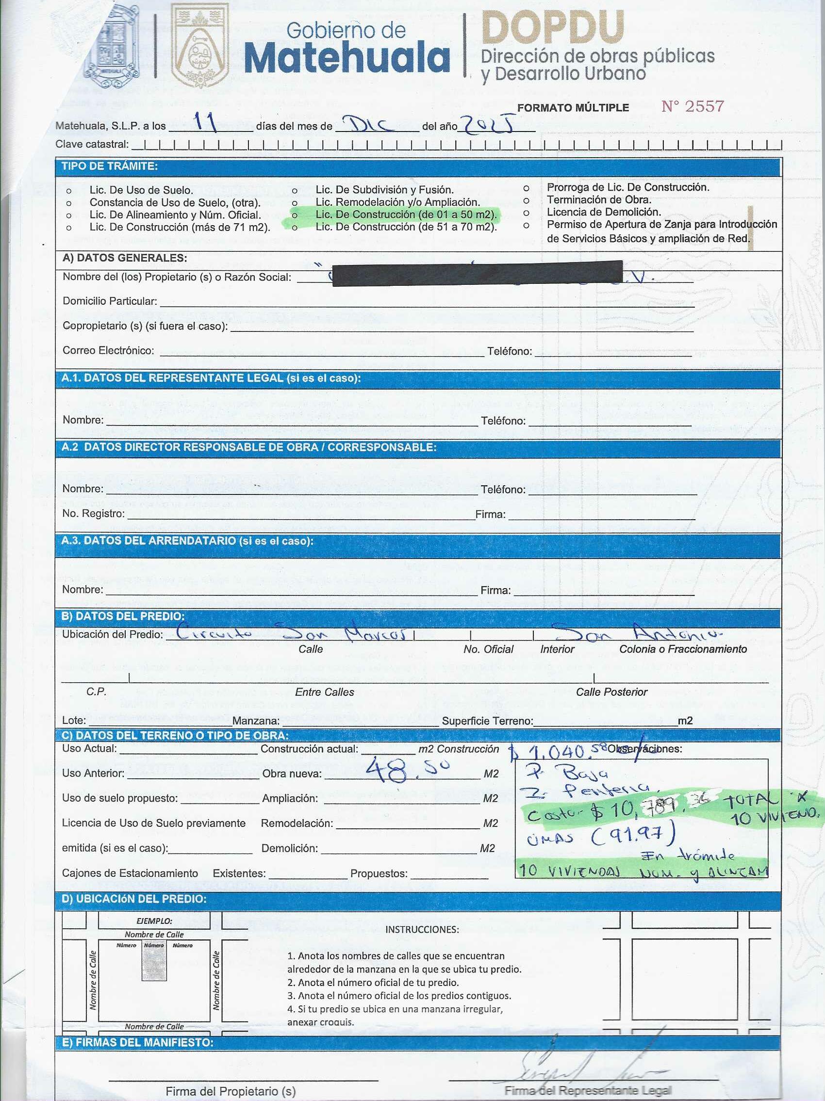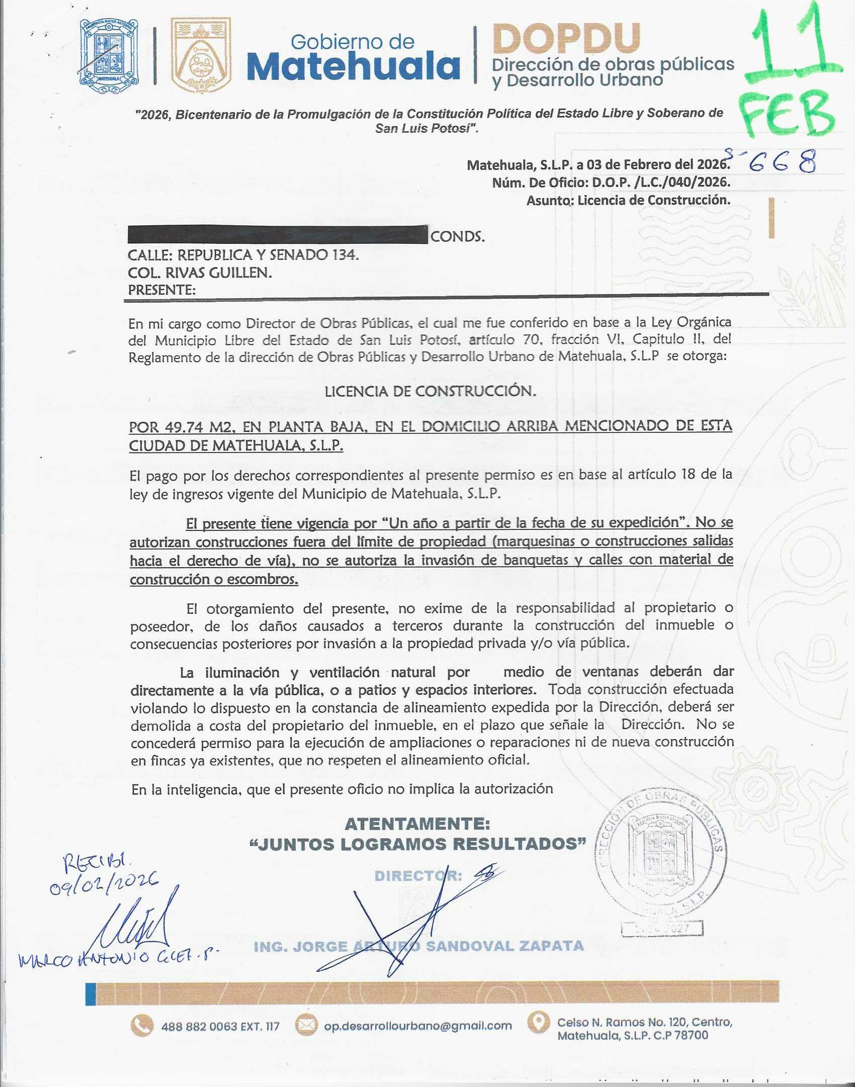 2026 01/02/2026 28/02/2026 DOP/LC/040/2026 CONSTRUCCION MARCO ANTONIO GONZALEZ PINEDA no se genero información Calle REPUBLICA Y SENADO 134 0 Colonia RIVAS GUILLEN 20 MATEHUALA 20 MATEHUALA 24 San Luis Potosí 78780 "http://www.cegaipslp.org.mx/HV2026.nsf/nombre_de_la_vista/23A27EF943498FCD06258DB600559B6C/$File/11+MARCO+ANTONIO+GONZALEZ+PINEDA.jpg " 03/02/2026 03/02/2027 HABITACIONAL "http://www.cegaipslp.org.mx/HV2026.nsf/nombre_de_la_vista/CF23F81344966C9406258DB5005573DD/$File/11+MARCO+ANTONIO+GONZALEZ+PINEDA.jpg " DIRECCIÓN DE OBRAS PÚBLICAS Y DESARROLLO URBANO 10/03/2026 COBRO NORMAL