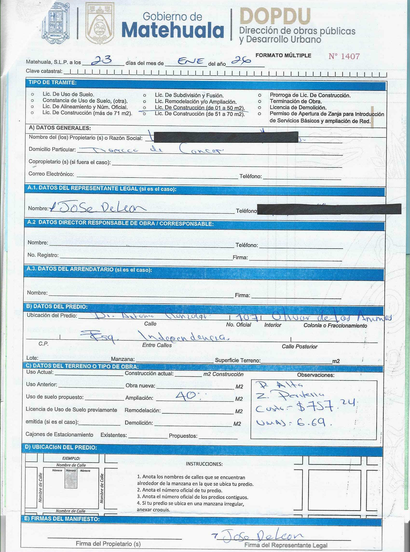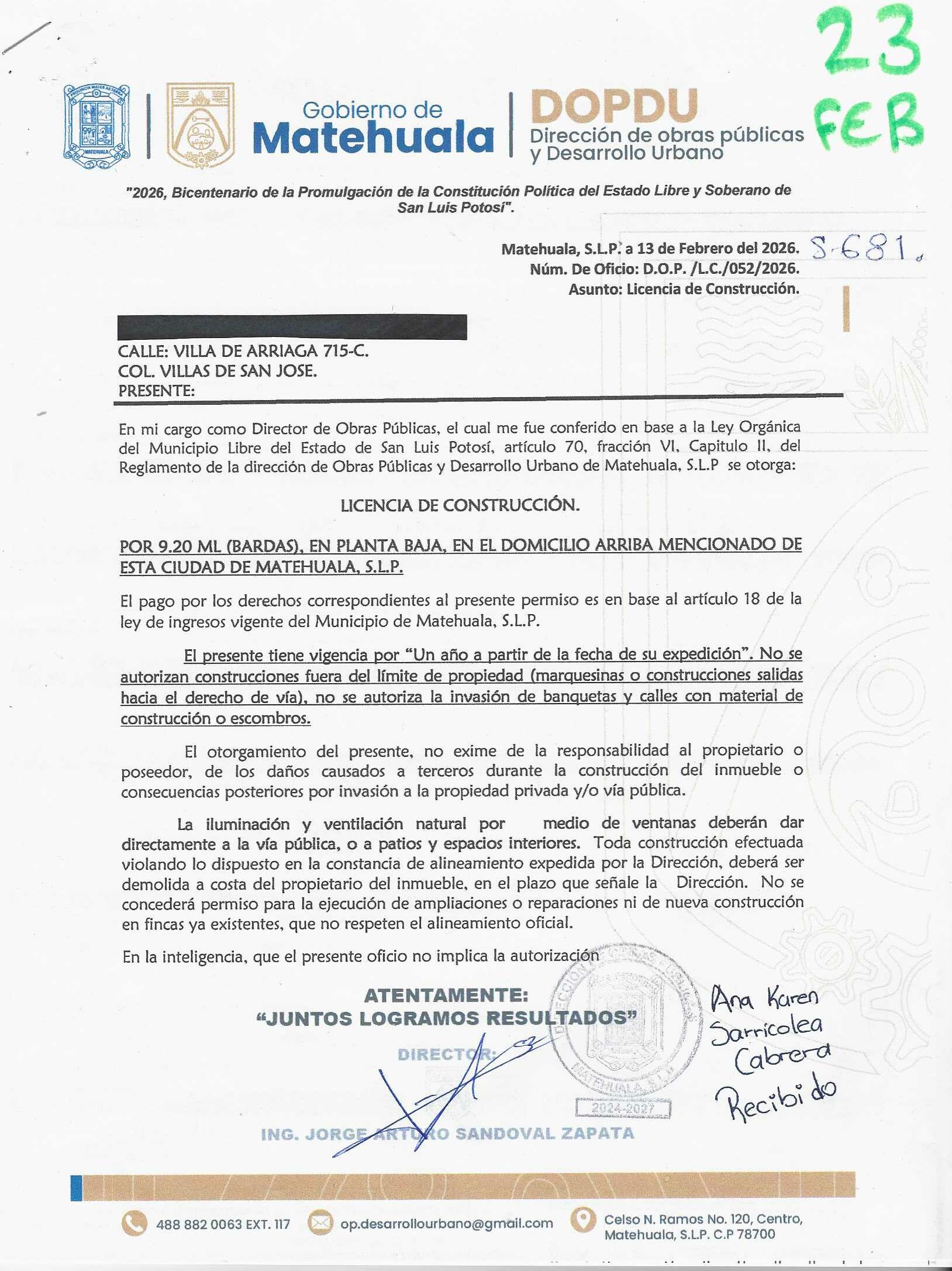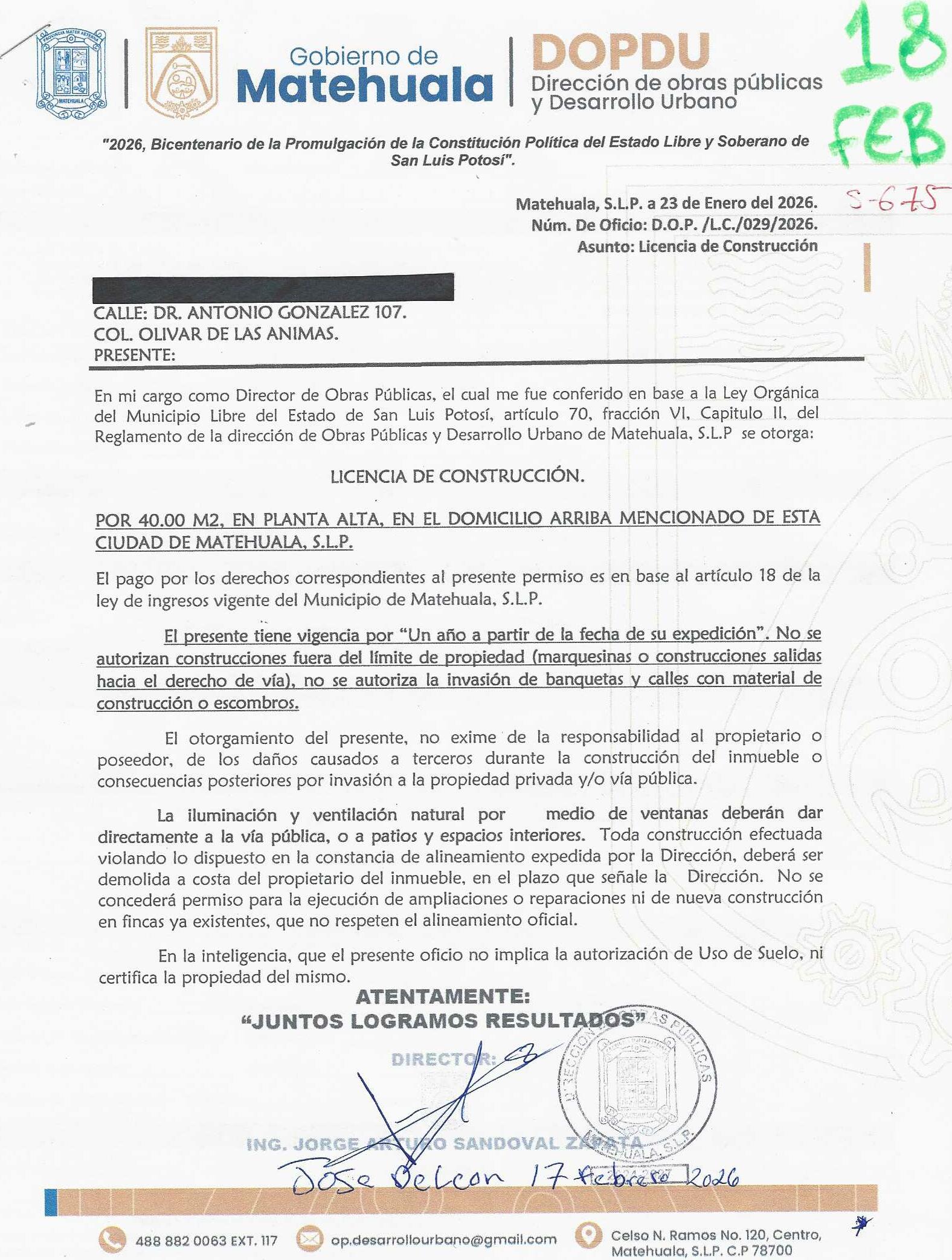 2026 01/02/2026 28/02/2026 DOP/LC/029/2026 CONSTRUCCION LETICIA AREVALO AREVALO no se genero información Calle DR. ANTONIO GONZALEZ 107 0 Colonia OLIVAR DE LAS ANIMAS 20 MATEHUALA 20 MATEHUALA 24 San Luis Potosí 78790 "http://www.cegaipslp.org.mx/HV2026.nsf/nombre_de_la_vista/F722417A3DEF73CA06258DB60056101C/$File/18+LETICIA+AREVALO+AREVALO.jpg " 23/01/2026 23/01/2027 HABITACIONAL "http://www.cegaipslp.org.mx/HV2026.nsf/nombre_de_la_vista/311EFC312FC5314406258DB50057EBC3/$File/18+LETICIA+AREVALO+AREVALO.jpg " DIRECCIÓN DE OBRAS PÚBLICAS Y DESARROLLO URBANO 10/03/2026 COBRO NORMAL