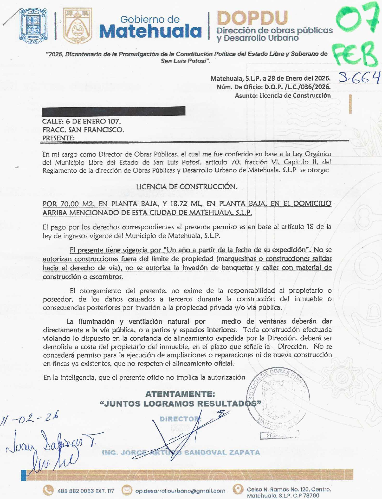 2026 01/02/2026 28/02/2026 DOP/LC/036/2026 CONSTRUCCION JOEL VAZQUEZ MATA no se genero información Calle 6 DE enero 107 0 Fraccionamiento SAN FRANCISCO 20 MATEHUALA 20 MATEHUALA 24 San Luis Potosí 78783 "http://www.cegaipslp.org.mx/HV2026.nsf/nombre_de_la_vista/03440D260CC669D006258DB500729B4D/$File/07+JOEL+VAZQUEZ+MATA.jpg " 11/02/2026 11/02/2027 HABITACIONAL "http://www.cegaipslp.org.mx/HV2026.nsf/nombre_de_la_vista/37A3DD468A1984C406258DB500554BEB/$File/07+JOEL+VAZQUEZ+MATA.jpg " DIRECCIÓN DE OBRAS PÚBLICAS Y DESARROLLO URBANO 10/03/2026 20 % DESCUENTO