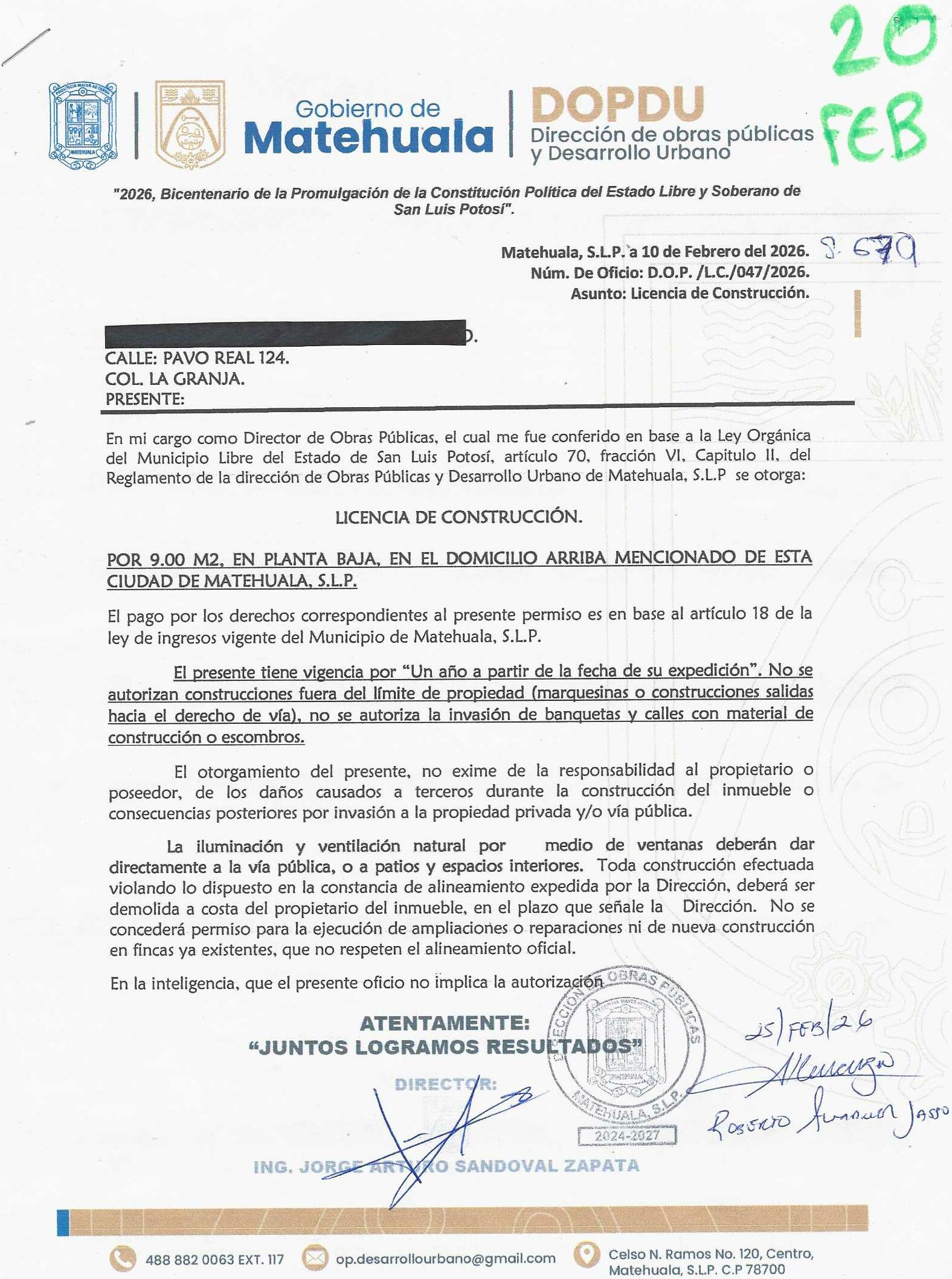 2026 01/02/2026 28/02/2026 DOP/LC/047/2026 CONSTRUCCION JUANA MARIA ELIZABETH ALMANZA JASSO no se genero información Calle PAVO REAL 124 0 Colonia LA GRANJA 20 MATEHUALA 20 MATEHUALA 24 San Luis Potosí 78716 "http://www.cegaipslp.org.mx/HV2026.nsf/nombre_de_la_vista/4E2F3DF84912C64C06258DB6005629AA/$File/20+JUANA+MARIA+ELIZABETH+ALMANZA+JASSO.jpg " 25/02/2026 25/02/2027 HABITACIONAL "http://www.cegaipslp.org.mx/HV2026.nsf/nombre_de_la_vista/5A884481EC3D821806258DB500580575/$File/20+JUANA+MARIA+ELIZABETH+ALMANZA+JASSO.jpg " DIRECCIÓN DE OBRAS PÚBLICAS Y DESARROLLO URBANO 10/03/2026 20 % DESCUENTO