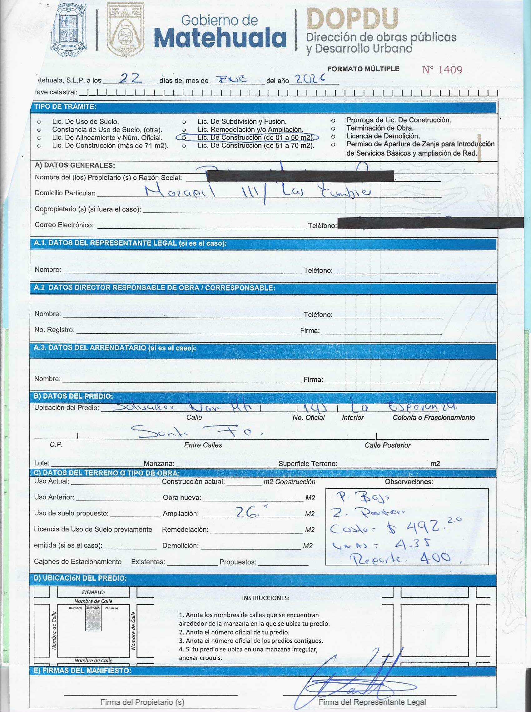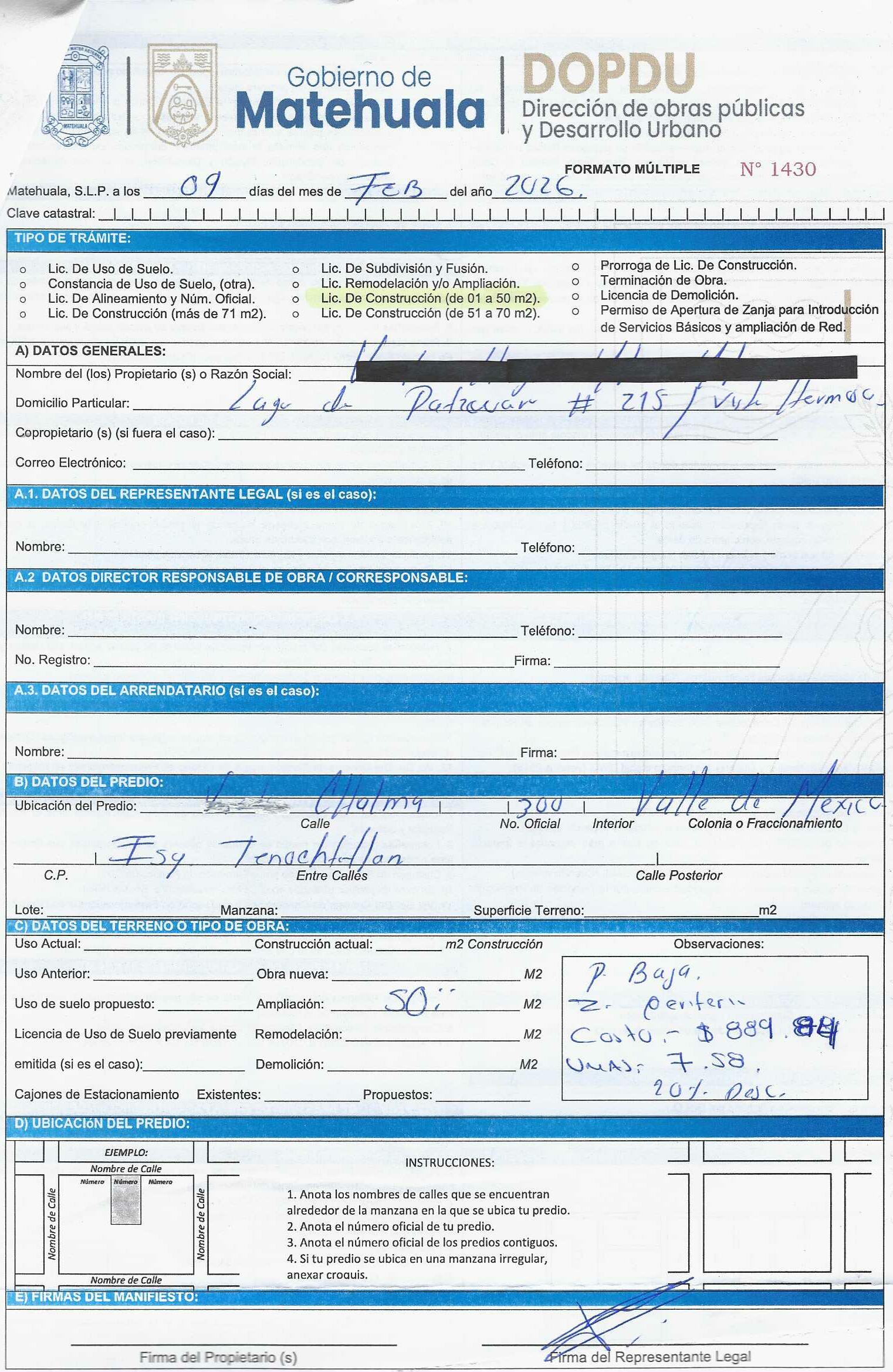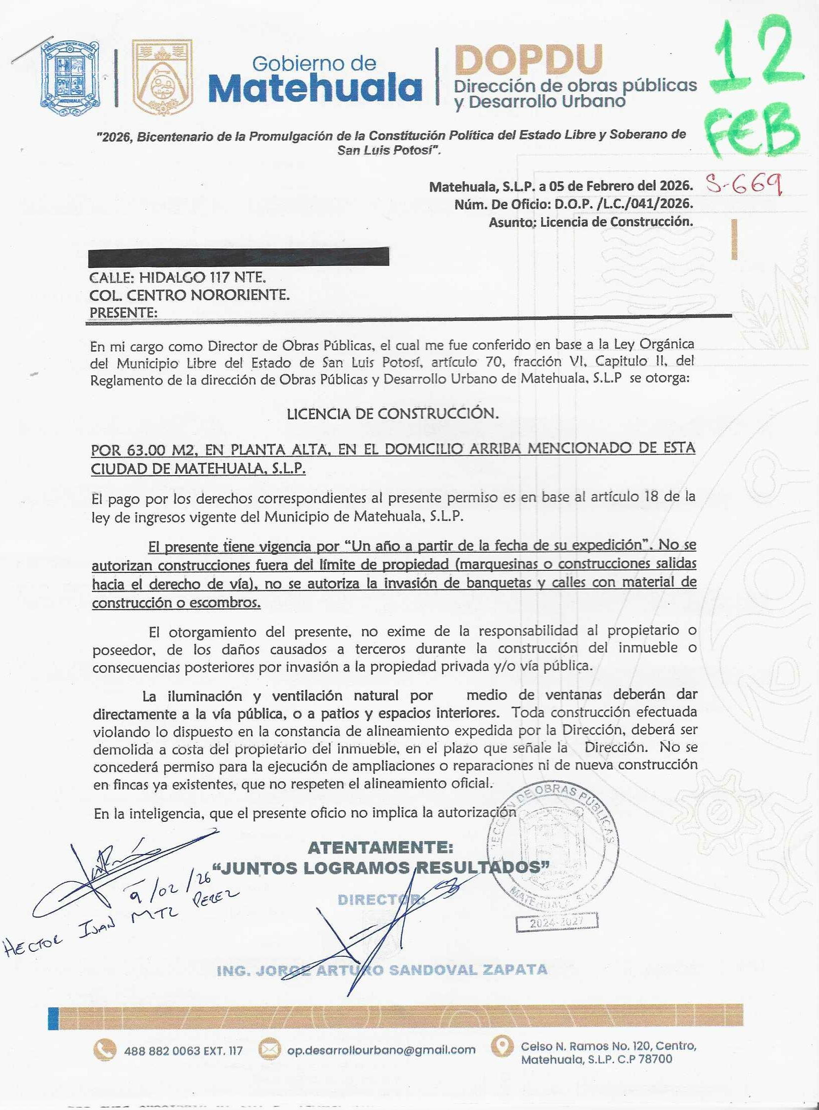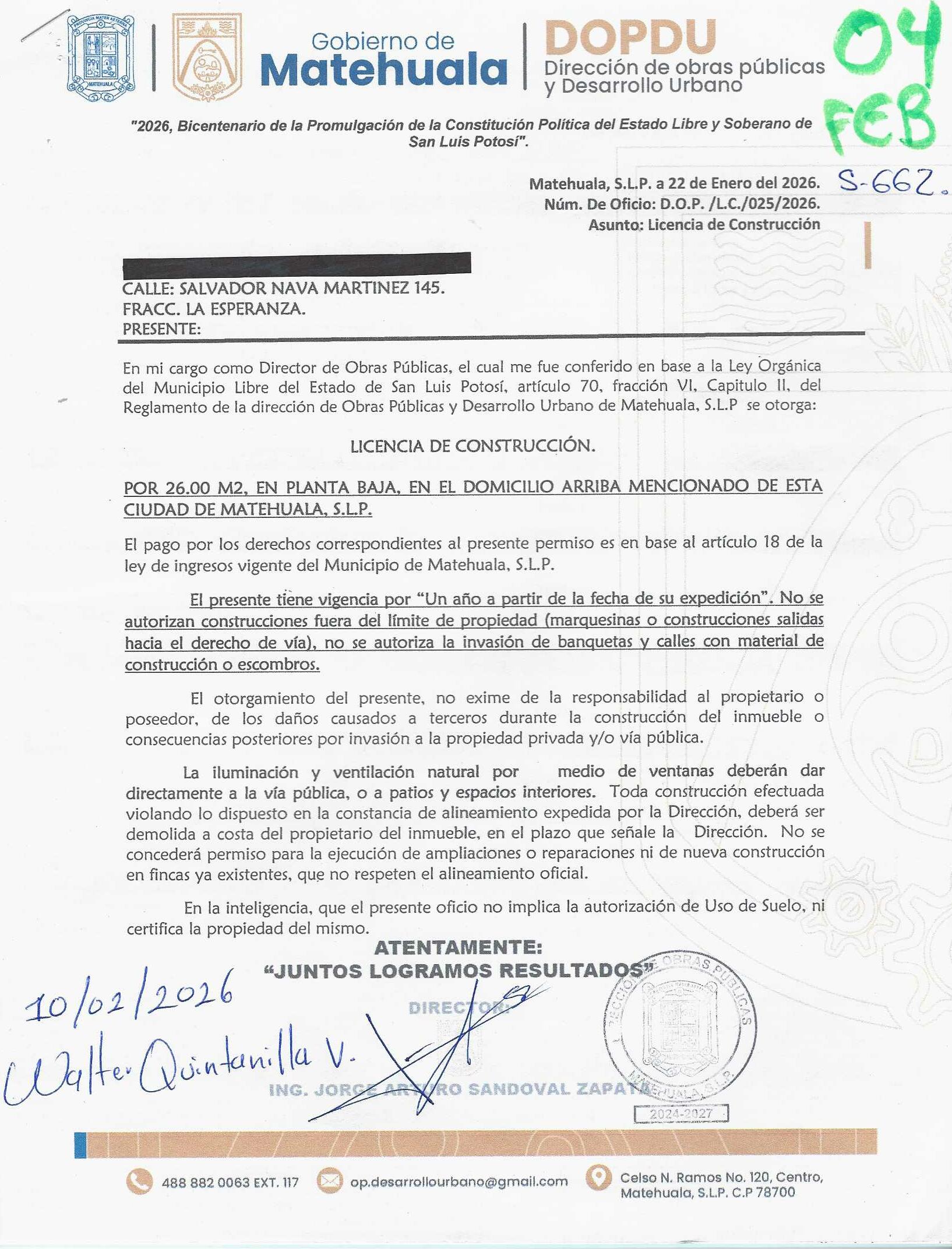 2026 01/02/2026 28/02/2026 DOP/LC/025/2026 CONSTRUCCION RUBEN MONTOYA RUIZ no se genero información Calle SALVADOR NAVA MARTINEZ 145 0 Fraccionamiento LA ESPERANZA 20 MATEHUALA 20 MATEHUALA 24 San Luis Potosí 0 "http://www.cegaipslp.org.mx/HV2026.nsf/nombre_de_la_vista/5B7CEC104B6EEC1506258DB500725BC7/$File/04+RUBEN+MONTOYA+RUIZ.jpg " 10/02/2026 10/02/2027 HABITACIONAL "http://www.cegaipslp.org.mx/HV2026.nsf/nombre_de_la_vista/E1E8910C9566834206258DB50054F4A6/$File/04+RUBEN+MONTOYA+RUIZ.jpg " DIRECCIÓN DE OBRAS PÚBLICAS Y DESARROLLO URBANO 10/03/2026 COBRO NORMAL