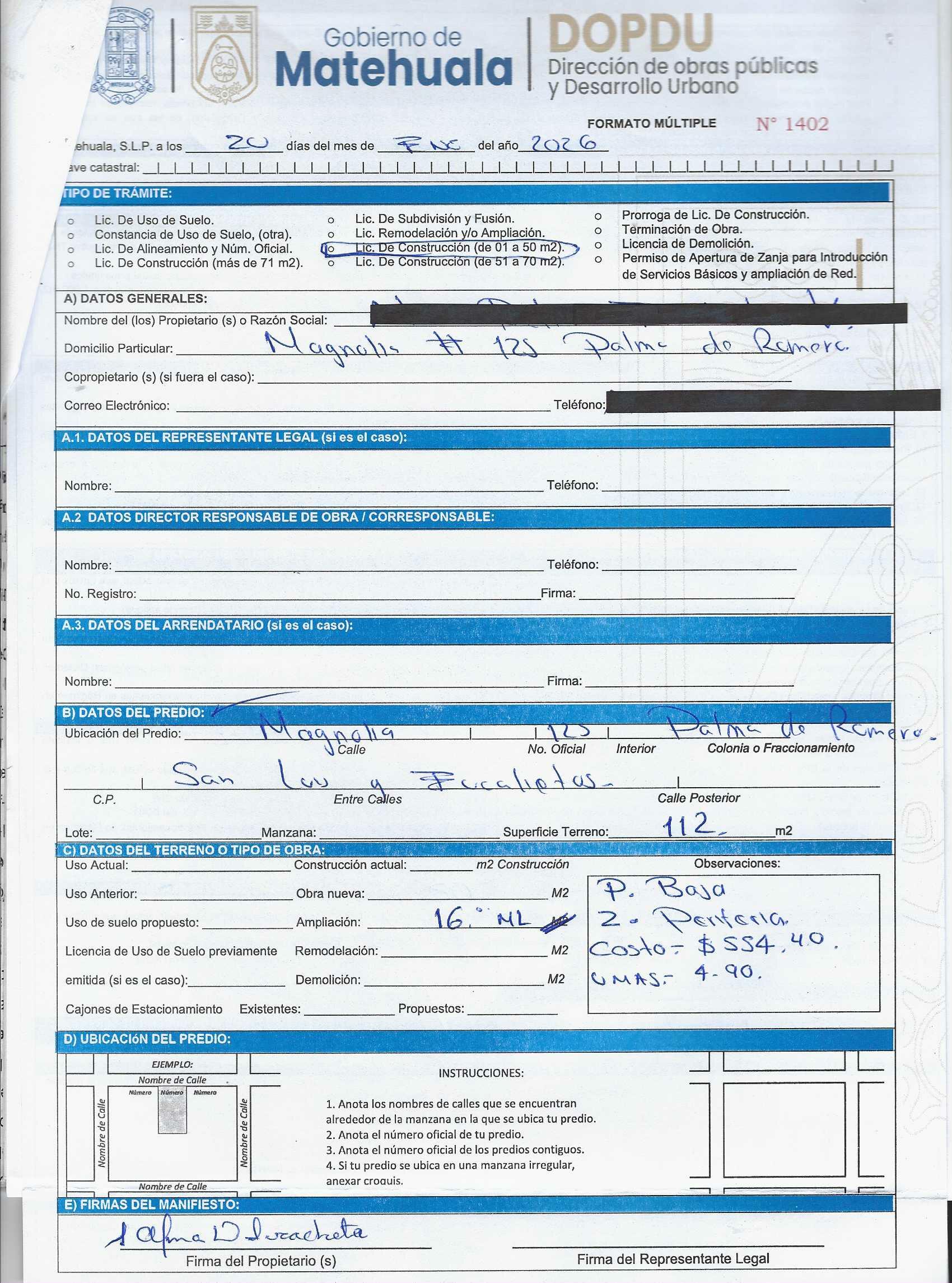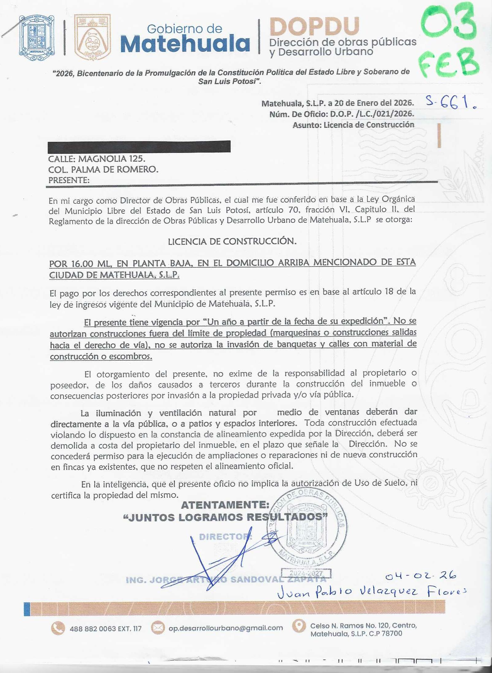 2026 01/02/2026 28/02/2026 DOP/LC/021/2026 CONSTRUCCION ALMA DELIA IRACHETA VELAZQUEZ no se genero información Calle MAGNOLIA 125 0 Colonia PALMA DE ROMERO 20 MATEHUALA 20 MATEHUALA 24 San Luis Potosí 78730 "http://www.cegaipslp.org.mx/HV2026.nsf/nombre_de_la_vista/718ECC39654A928E06258DB500724CE8/$File/03+ALMA+DELIA+IRACHETA+VELAZQUEZ.jpg " 20/01/2026 20/01/2027 HABITACIONAL "http://www.cegaipslp.org.mx/HV2026.nsf/nombre_de_la_vista/FA765622117D2ADC06258DB50054B142/$File/03+ALMA+DELIA+IRACHETA+VELAZQUEZ.jpg " DIRECCIÓN DE OBRAS PÚBLICAS Y DESARROLLO URBANO 10/03/2026 COBRO NORMAL