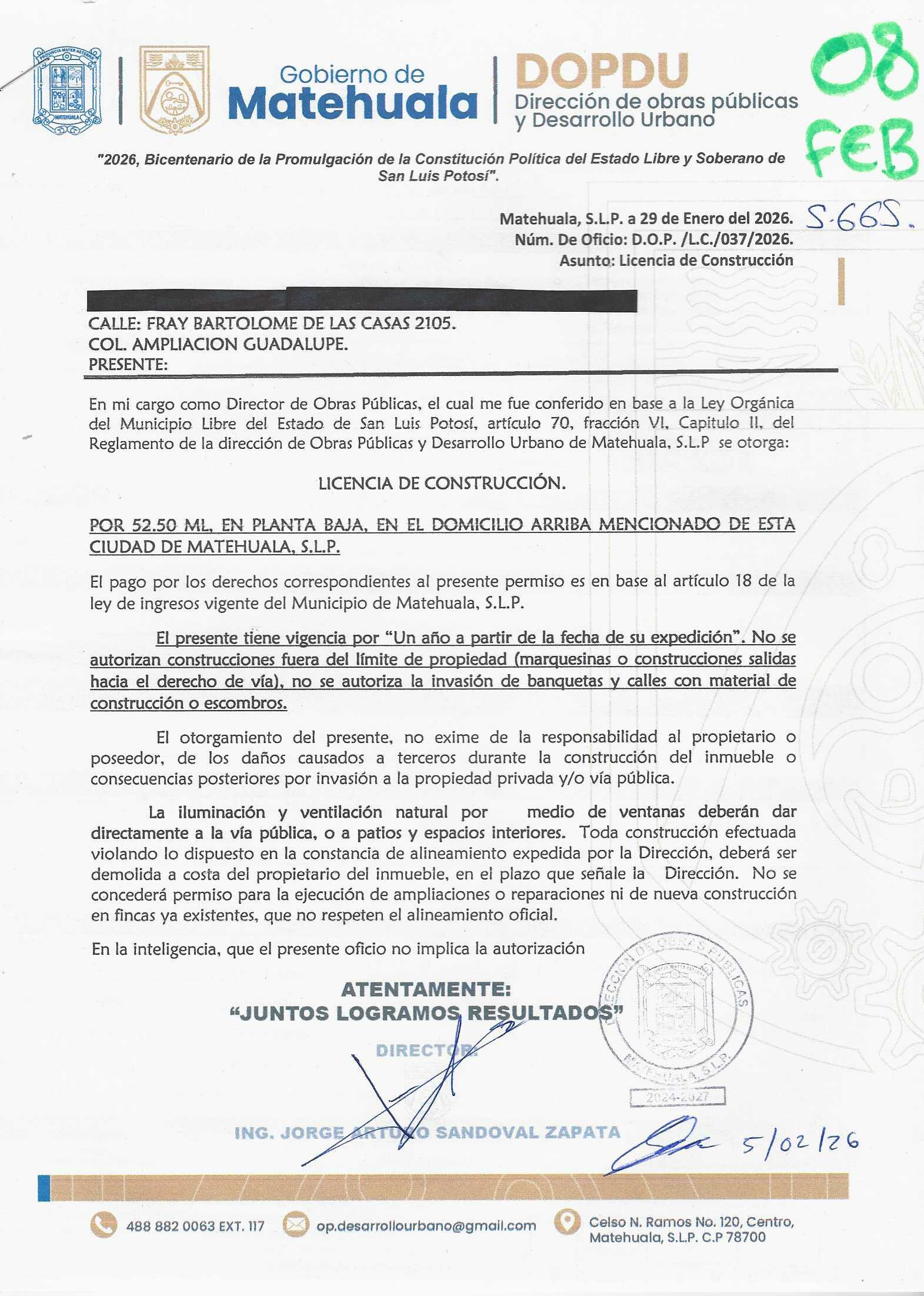 2026 01/02/2026 28/02/2026 DOP/LC/037/2026 CONSTRUCCION SERGIO ELEAZAR MENDOZA PINALES no se genero información Calle FRAY BARTOLOME DE LAS CASAS 2105 0 Colonia AMPLIACION GUADALUPE 20 MATEHUALA 20 MATEHUALA 24 San Luis Potosí 78786 "http://www.cegaipslp.org.mx/HV2026.nsf/nombre_de_la_vista/0E2C58484C8A29C406258DB50072AD18/$File/08+SERGIO+ELEAZAR+MENDOZA+PINALES.jpg " 05/02/2026 05/02/2027 HABITACIONAL "http://www.cegaipslp.org.mx/HV2026.nsf/nombre_de_la_vista/82A0AD1B8315514406258DB50055557A/$File/08+SERGIO+ELEAZAR+MENDOZA+PINALES.jpg " DIRECCIÓN DE OBRAS PÚBLICAS Y DESARROLLO URBANO 10/03/2026 20 % DESCUENTO