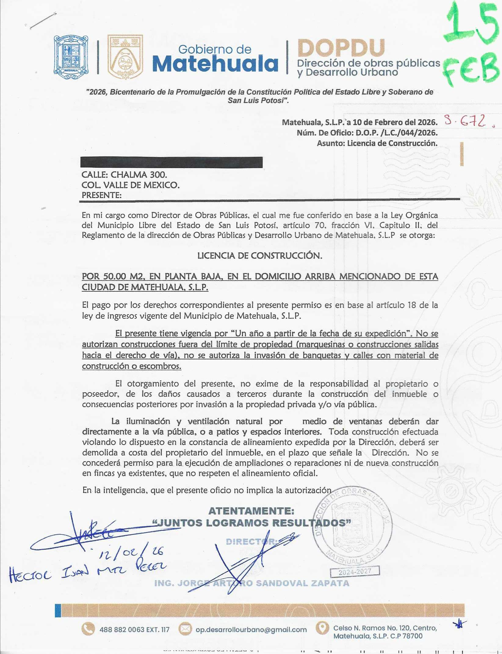 2026 01/02/2026 28/02/2026 DOP/LC/044/2026 CONSTRUCCION VICTOR HUGO MARTINEZ MARTINEZ no se genero información Calle CHALMA 300 0 Colonia VALLE DE MEXICO 20 MATEHUALA 20 MATEHUALA 24 San Luis Potosí 0 "http://www.cegaipslp.org.mx/HV2026.nsf/nombre_de_la_vista/E001710CCB9BE8ED06258DB60055EC7D/$File/15+VICTOR+HUGO+MARTINEZ+MARTINEZ.jpg " 12/02/2026 12/02/2027 HABITACIONAL "http://www.cegaipslp.org.mx/HV2026.nsf/nombre_de_la_vista/846FCDCC569C4B2B06258DB50057B3EB/$File/15+VICTOR+HUGO+MARTINEZ+MARTINEZ.jpg " DIRECCIÓN DE OBRAS PÚBLICAS Y DESARROLLO URBANO 10/03/2026 20 % DESCUENTO