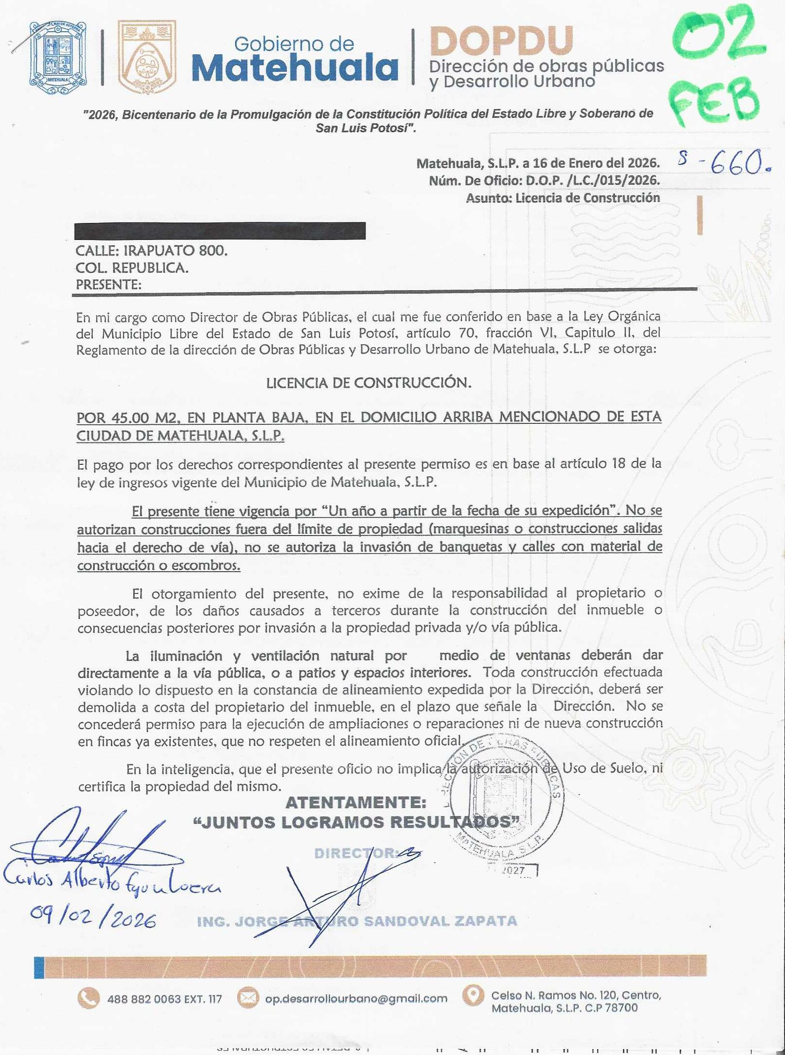 2026 01/02/2026 28/02/2026 DOP/LC/015/2026 CONSTRUCCION CARLOS ALBERTO EGUIA LOERA no se genero información Calle IRAPUATO 800 0 Colonia REPUBLICA 20 MATEHUALA 20 MATEHUALA 24 San Luis Potosí 78740 "http://www.cegaipslp.org.mx/HV2026.nsf/nombre_de_la_vista/35B2F4E19ADE29E506258DB500723153/$File/02+CARLOS+ALBERTO+EGUIA+LOERA.jpg " 16/01/2026 16/01/2027 HABITACIONAL "http://www.cegaipslp.org.mx/HV2026.nsf/nombre_de_la_vista/8E4AB0C12A51589C06258DB500549EA4/$File/02+CARLOS+ALBERTO+EGUIA+LOERA.jpg " DIRECCIÓN DE OBRAS PÚBLICAS Y DESARROLLO URBANO 10/03/2026 COBRO NORMAL