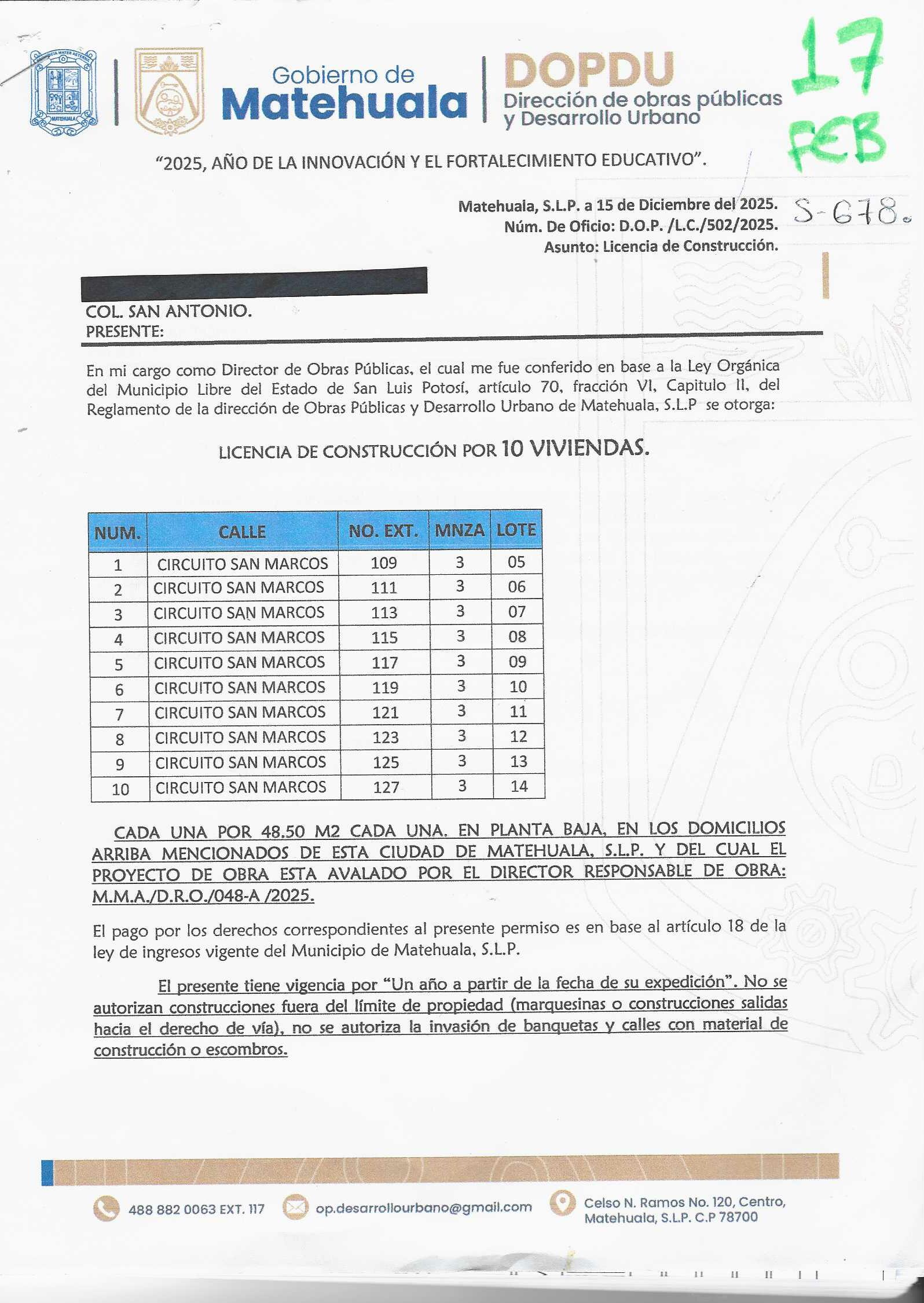 2026 01/02/2026 28/02/2026 DOP/LC/502/2025 CONSTRUCCION no se genero información no se genero información no se genero información URBANIKALI S.A. DE C.V. Calle CIRCUITO SAN MARCOS 109,111,113,115,117,119,121,123,125,127 0 Colonia SAN ANTONIO 20 MATEHUALA 20 MATEHUALA 24 San Luis Potosí 78784 "http://www.cegaipslp.org.mx/HV2026.nsf/nombre_de_la_vista/25CBB3BB2215465A06258DB600560782/$File/17+URBANIKALI+S.A.+DE+C.V..jpg " 26/02/2026 26/02/2027 HABITACIONAL "http://www.cegaipslp.org.mx/HV2026.nsf/nombre_de_la_vista/CF7363D3BE9031FD06258DB50057E20B/$File/17+URBANIKALI+S.A.+DE+C.V..jpg " DIRECCIÓN DE OBRAS PÚBLICAS Y DESARROLLO URBANO 10/03/2026 COBRO NORMAL