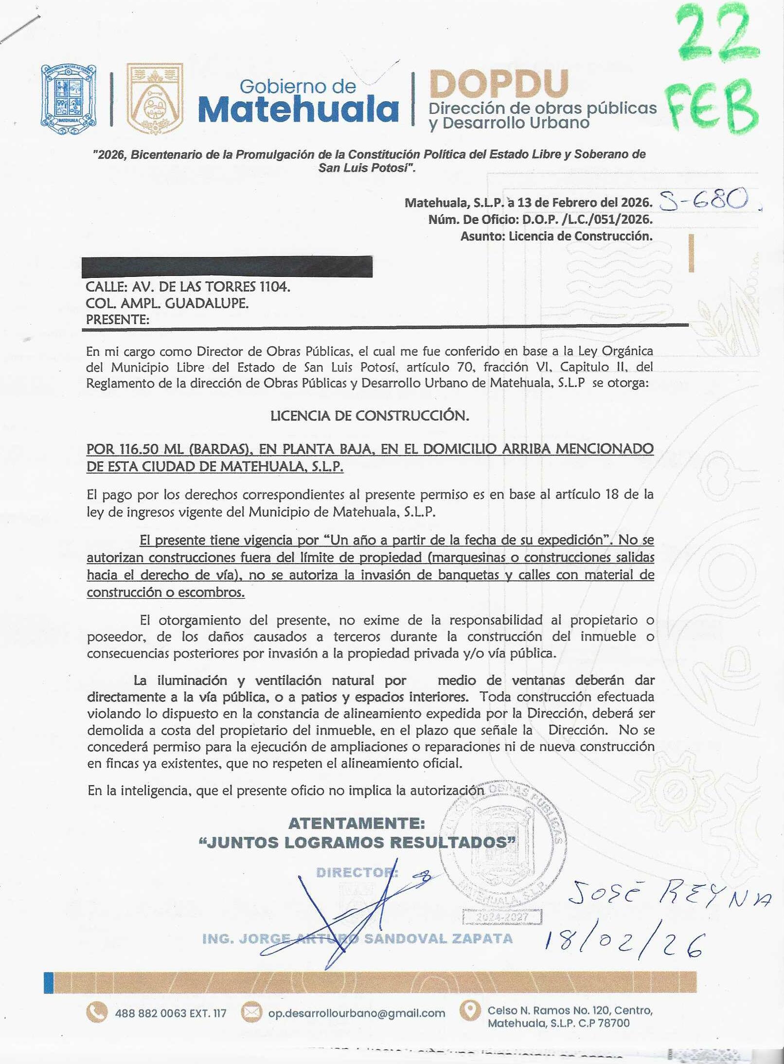 2026 01/02/2026 28/02/2026 DOP/LC/051/2026 CONSTRUCCION JOSE REYNA CASTRO no se genero información Calle AV. DE LAS TORRES 1104 0 Colonia AMPLIACION GUADALUPE 20 MATEHUALA 20 MATEHUALA 24 San Luis Potosí 78786 "http://www.cegaipslp.org.mx/HV2026.nsf/nombre_de_la_vista/B51DC1BF462D42F506258DB6005647F6/$File/22+JOSE+REYNA+CASTRO.jpg " 18/02/2026 18/02/2027 HABITACIONAL "http://www.cegaipslp.org.mx/HV2026.nsf/nombre_de_la_vista/DB06ADBF10FFDBA506258DB5005816B1/$File/22+JOSE+REYNA+CASTRO.jpg " DIRECCIÓN DE OBRAS PÚBLICAS Y DESARROLLO URBANO 10/03/2026 20 % DESCUENTO