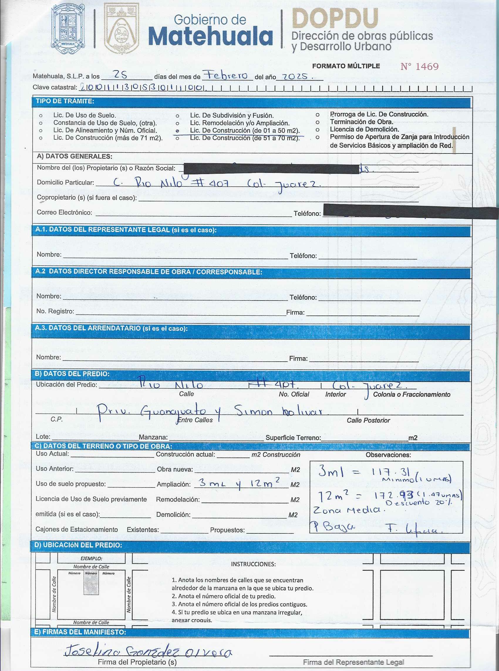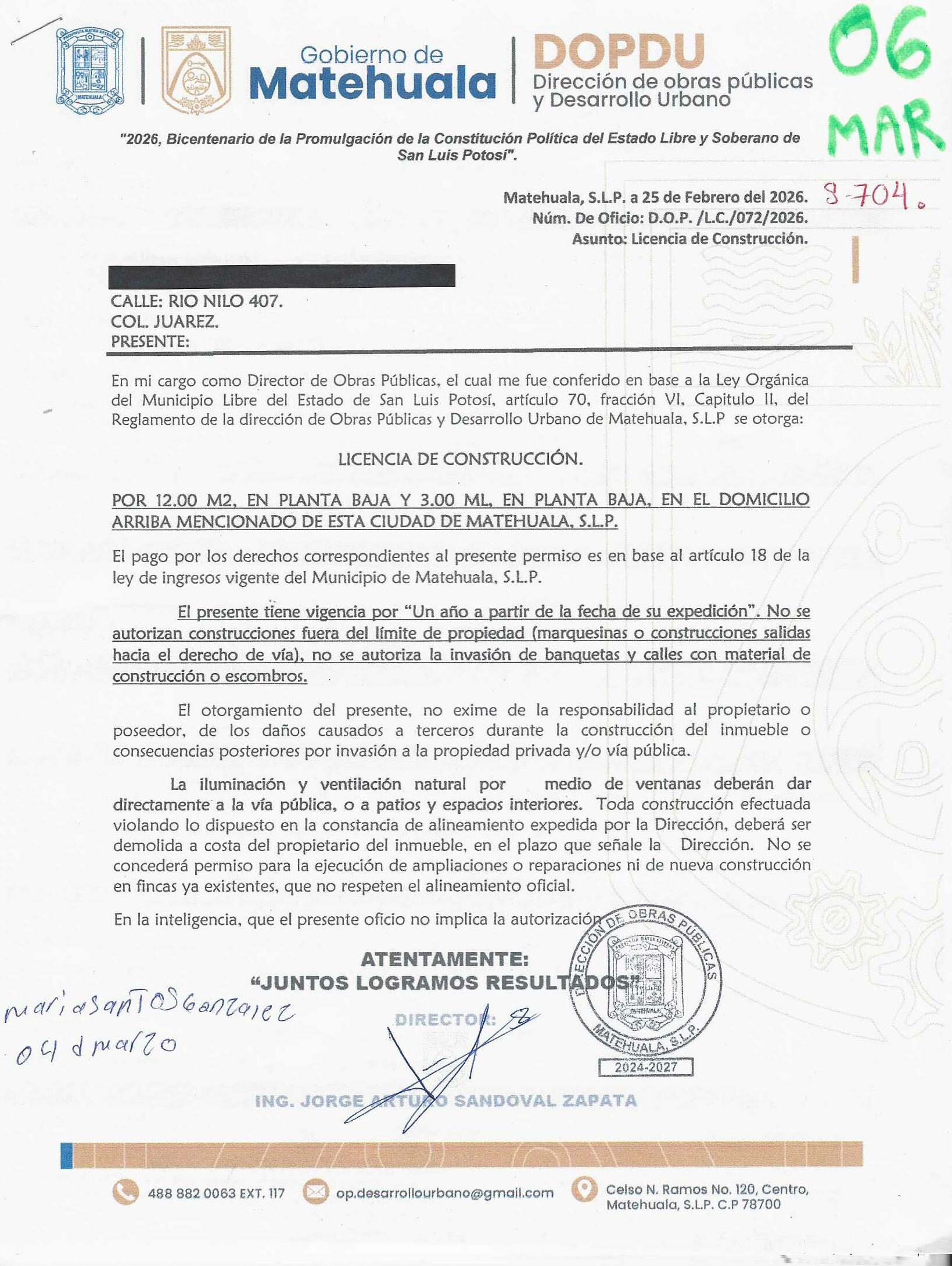 2026 01/03/2026 31/03/2026 DOP/LC/072/2026 CONSTRUCCION JOSEFINA GONZALEZ OLVERA RIO NILO 407 0 Colonia 0 Colonia JUAREZ 20 MATEHUALA 20 MATEHUALA 24 San Luis Potosí 78750 "http://www.cegaipslp.org.mx/HV2026.nsf/nombre_de_la_vista/08DF6755548E5DB806258DCD005E2949/$File/06+JOSEFINA+GONZALEZ+OLVERA.jpg " 25/02/2026 25/02/2027 HABITACIONAL "http://www.cegaipslp.org.mx/HV2026.nsf/nombre_de_la_vista/8E989F22883077EF06258DCD006213A5/$File/06+JOSEFINA+GONZALEZ+OLVERA.jpg " DIRECCIÓN DE OBRAS PÚBLICAS Y DESARROLLO URBANO 02/04/2026 20 % DESCUENTO