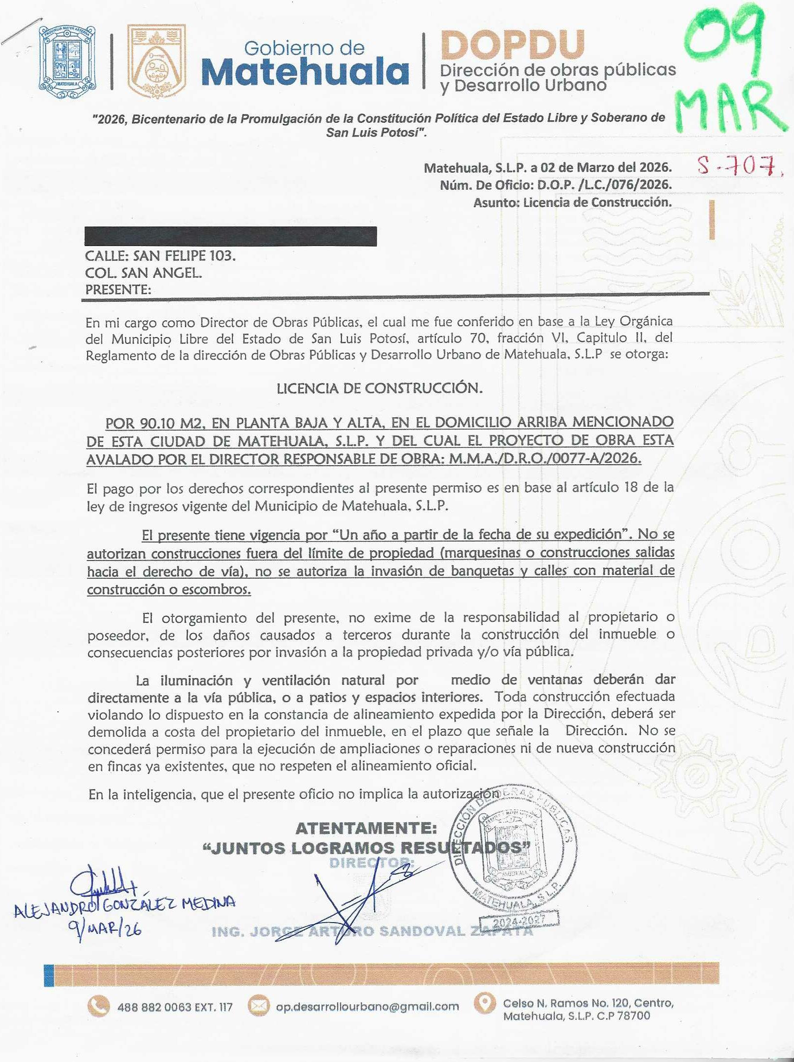 2026 01/03/2026 31/03/2026 DOP/LC/076/2026 CONSTRUCCION ALEJANDRO GONZALEZ MEDINA SAN FELIPE 103 0 Colonia 0 Colonia SAN ANGEL 20 MATEHUALA 20 MATEHUALA 24 San Luis Potosí 78784 "http://www.cegaipslp.org.mx/HV2026.nsf/nombre_de_la_vista/67E65A39F52322B106258DCD005E49DC/$File/09+ALEJANDRO+GONZALEZ+MEDINA.jpg " 09/03/2026 09/03/2027 HABITACIONAL "http://www.cegaipslp.org.mx/HV2026.nsf/nombre_de_la_vista/1030A0F621FB183A06258DCD00628EA5/$File/09+ALEJANDRO+GONZALEZ+MEDINA.jpg " DIRECCIÓN DE OBRAS PÚBLICAS Y DESARROLLO URBANO 02/04/2026 20 % DESCUENTO