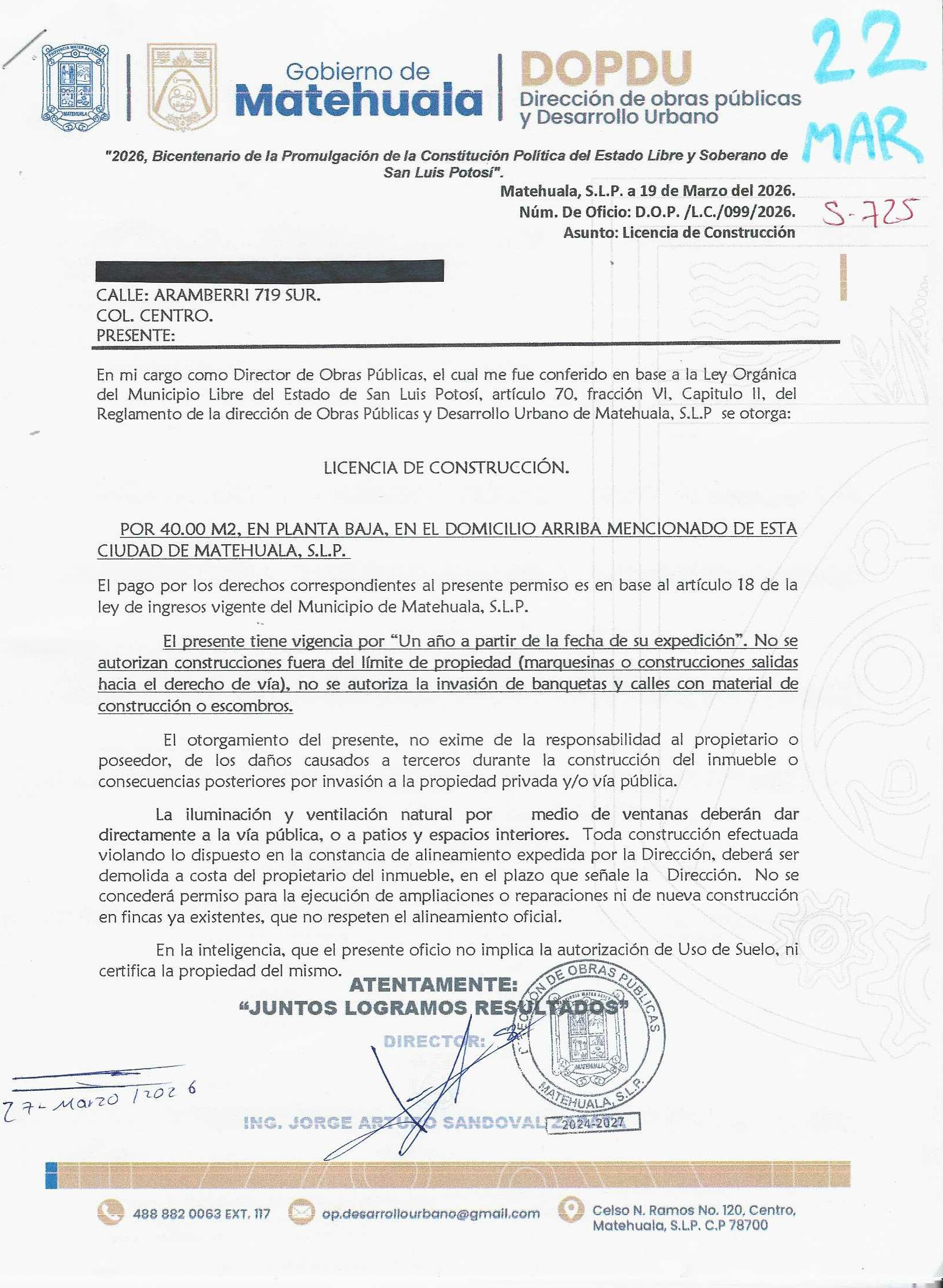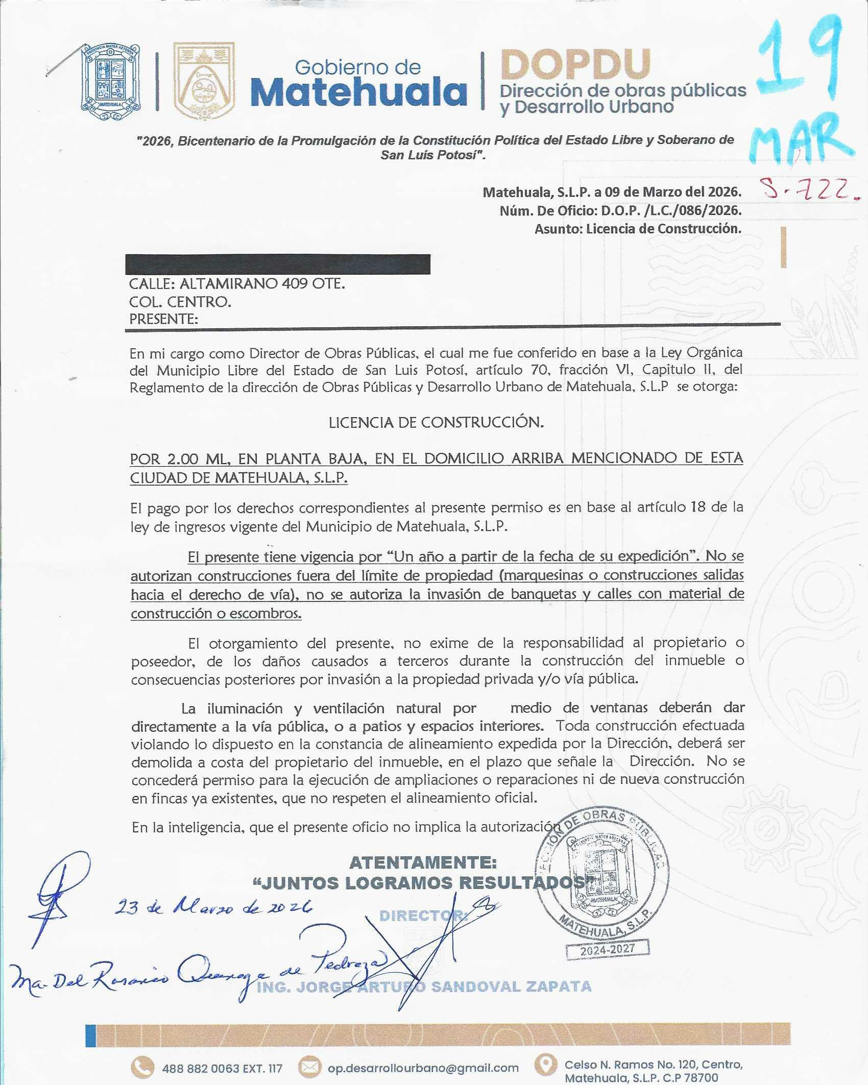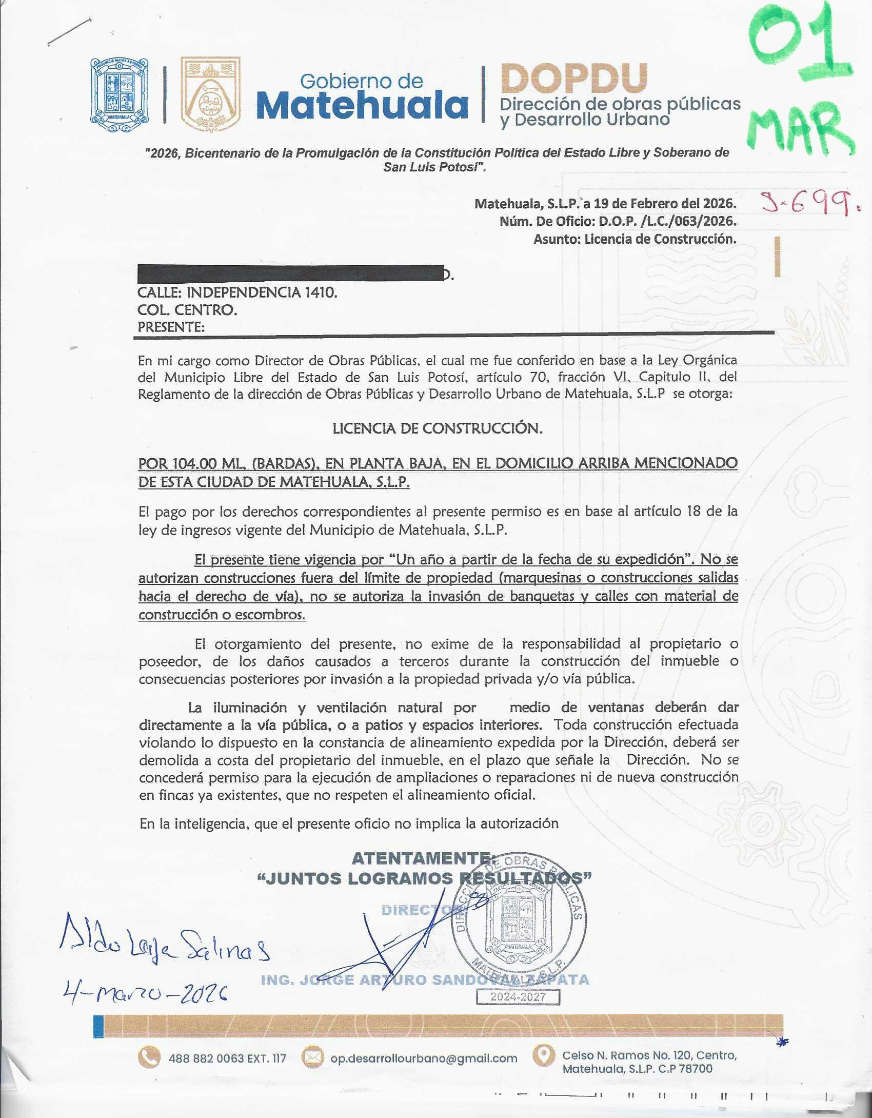 2026 01/03/2026 31/03/2026 DOP/LC/099/2026 CONSTRUCCION CELIA OROZCO MARTINEZ ARAMBERRI 719 SUR Colonia SUR Colonia CENTRO 20 MATEHUALA 20 MATEHUALA 24 San Luis Potosí 78700 "http://www.cegaipslp.org.mx/HV2026.nsf/nombre_de_la_vista/73E5B76D6E58E4E706258DCD005F0E12/$File/21+EDGAR+GALLEGOS+CORONADO.jpg " 19/03/2026 19/03/2027 HABITACIONAL "http://www.cegaipslp.org.mx/HV2026.nsf/nombre_de_la_vista/50C2D11BA68EEF8C06258DCD00644F49/$File/22+CELIA+OROZCO+MARTINEZ.jpg " DIRECCIÓN DE OBRAS PÚBLICAS Y DESARROLLO URBANO 02/04/2026 COBRO NORMAL
