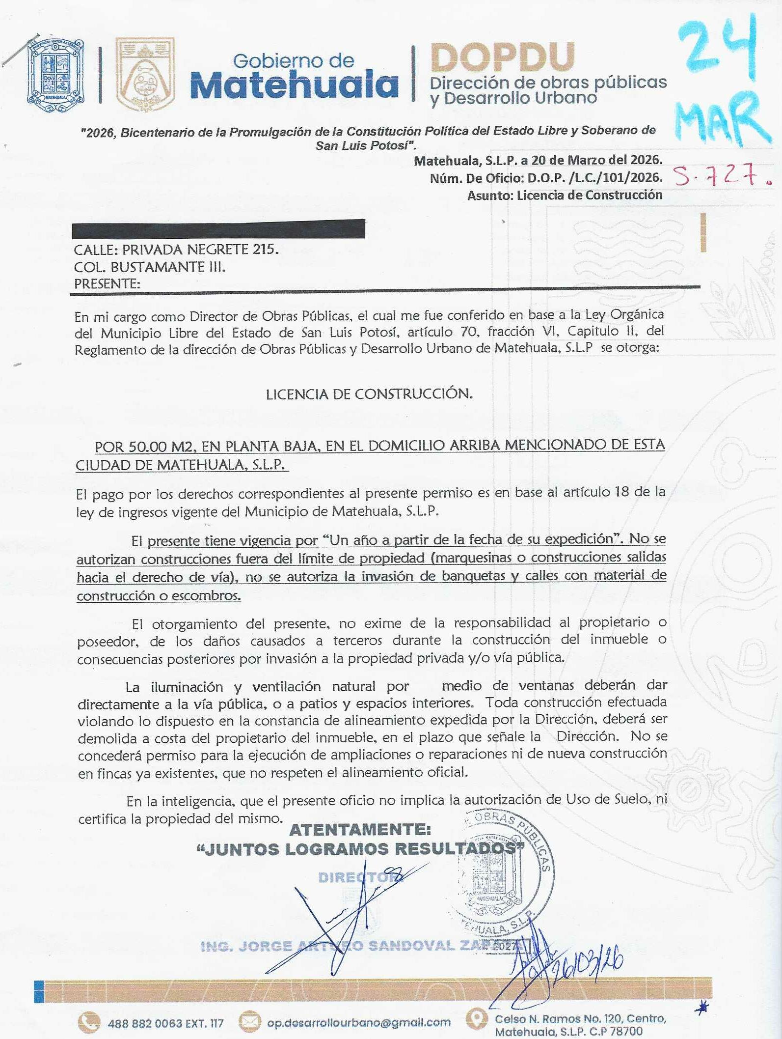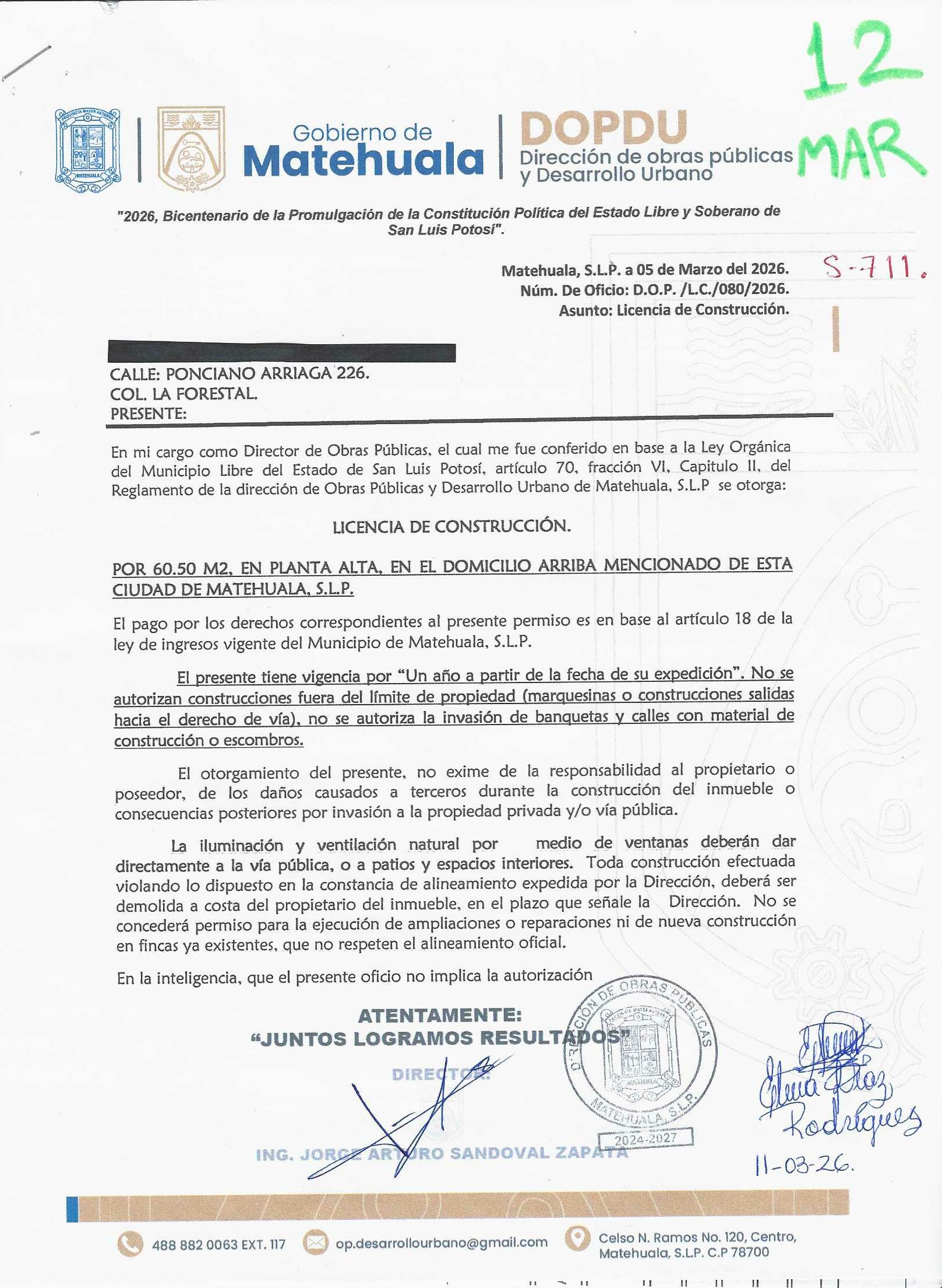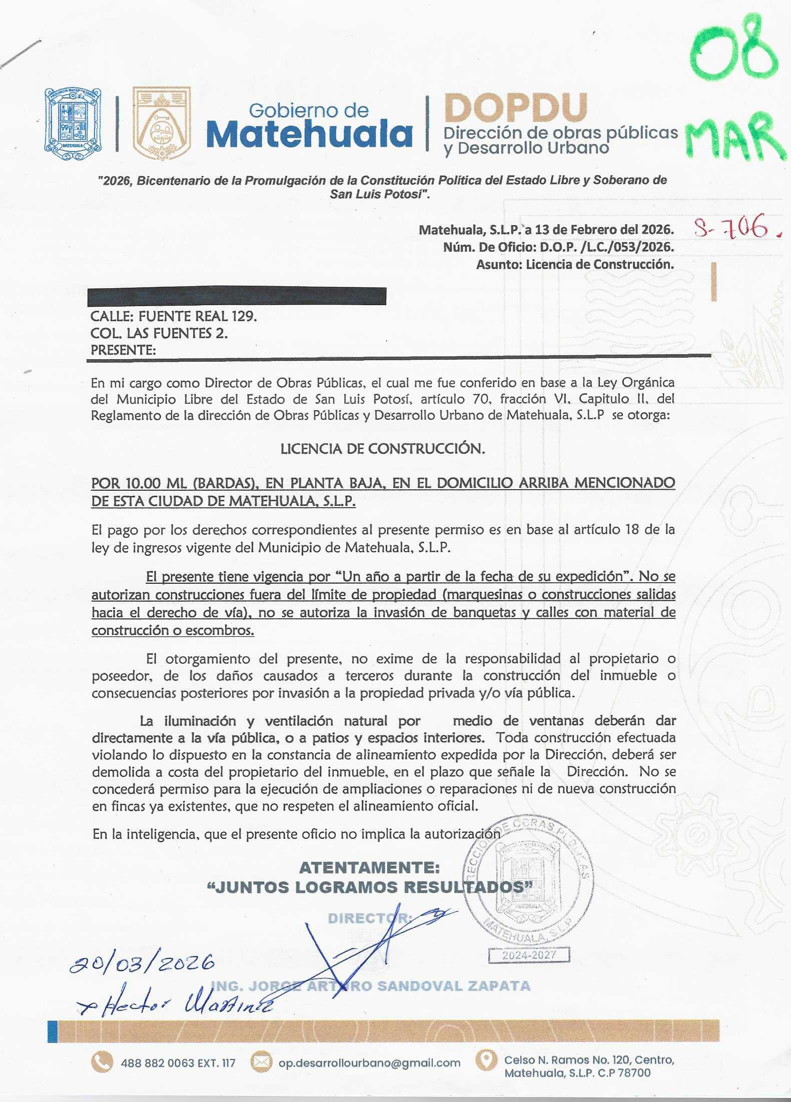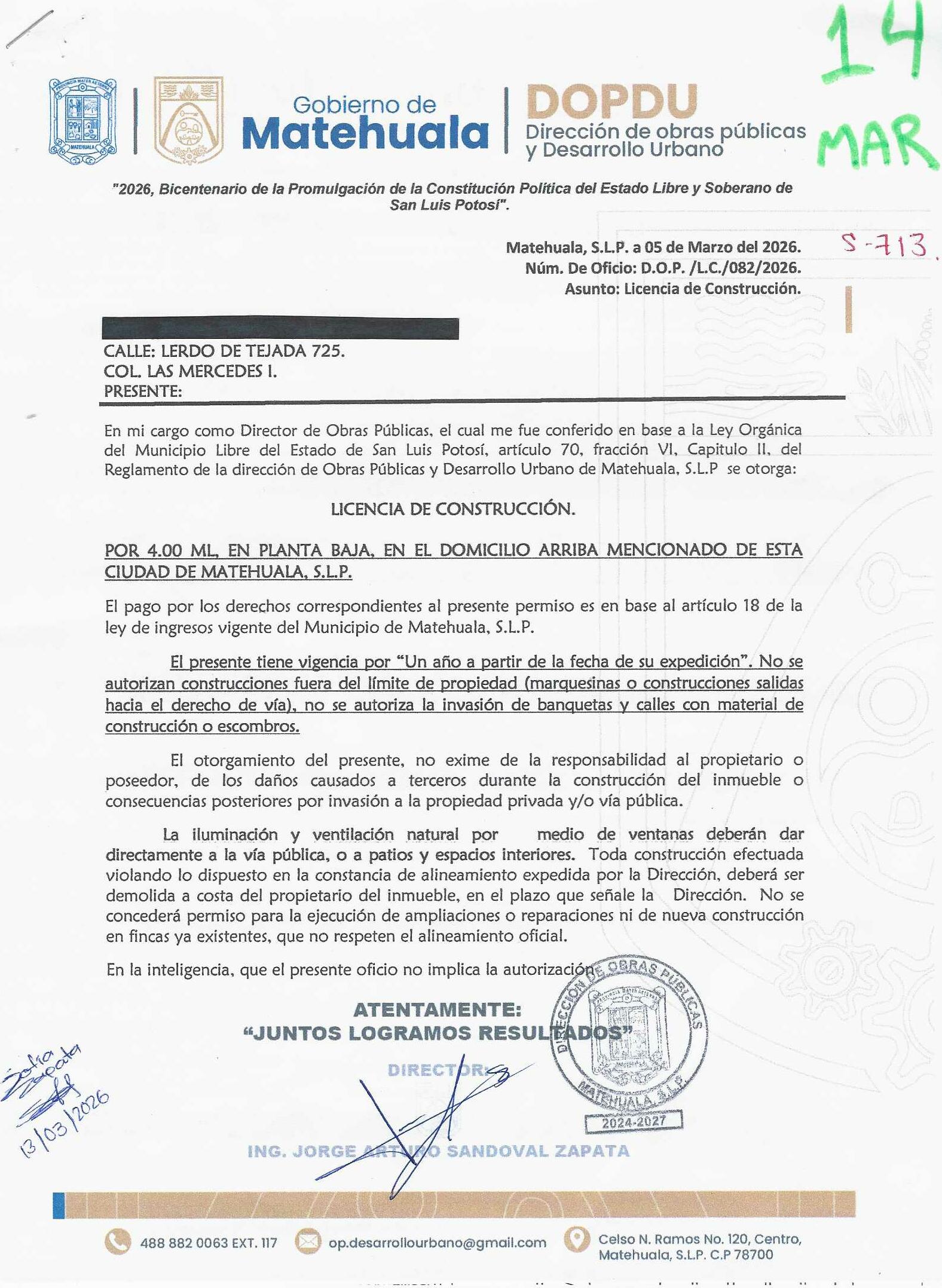 2026 01/03/2026 31/03/2026 DOP/LC/082/2026 CONSTRUCCION RAUL ZAPATA SUSTAITA LERDO DE TEJADA 725 0 Colonia 0 Colonia LAS MERCEDES I 20 MATEHUALA 20 MATEHUALA 24 San Luis Potosí 78716 "http://www.cegaipslp.org.mx/HV2026.nsf/nombre_de_la_vista/5EF5743E5D1D81EB06258DCD005E8ECB/$File/14+RAUL+ZAPATA+SUSTAITA.jpg " 13/03/2026 13/03/2027 HABITACIONAL "http://www.cegaipslp.org.mx/HV2026.nsf/nombre_de_la_vista/FBC4CC6F14DE415406258DCD0063B9C1/$File/14+RAUL+ZAPATA+SUSTAITA.jpg " DIRECCIÓN DE OBRAS PÚBLICAS Y DESARROLLO URBANO 02/04/2026 COBRO NORMAL