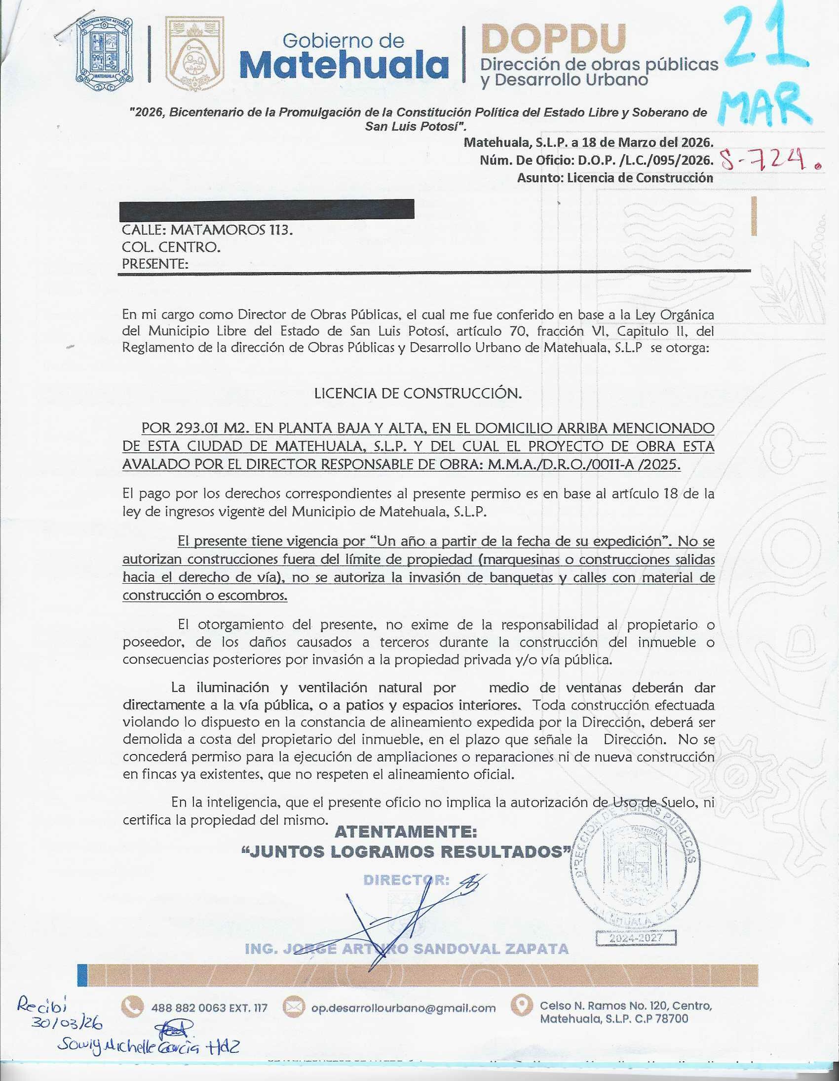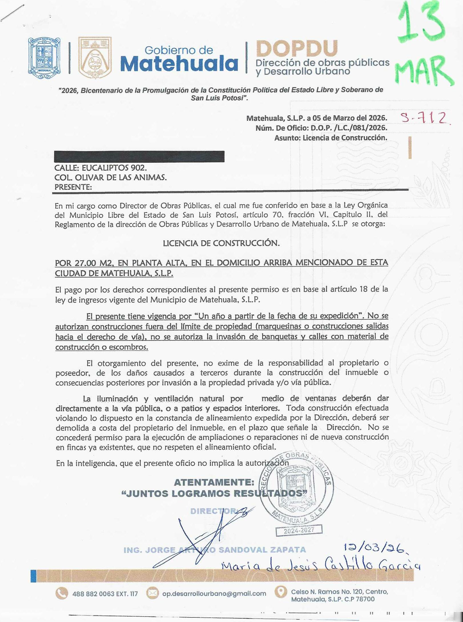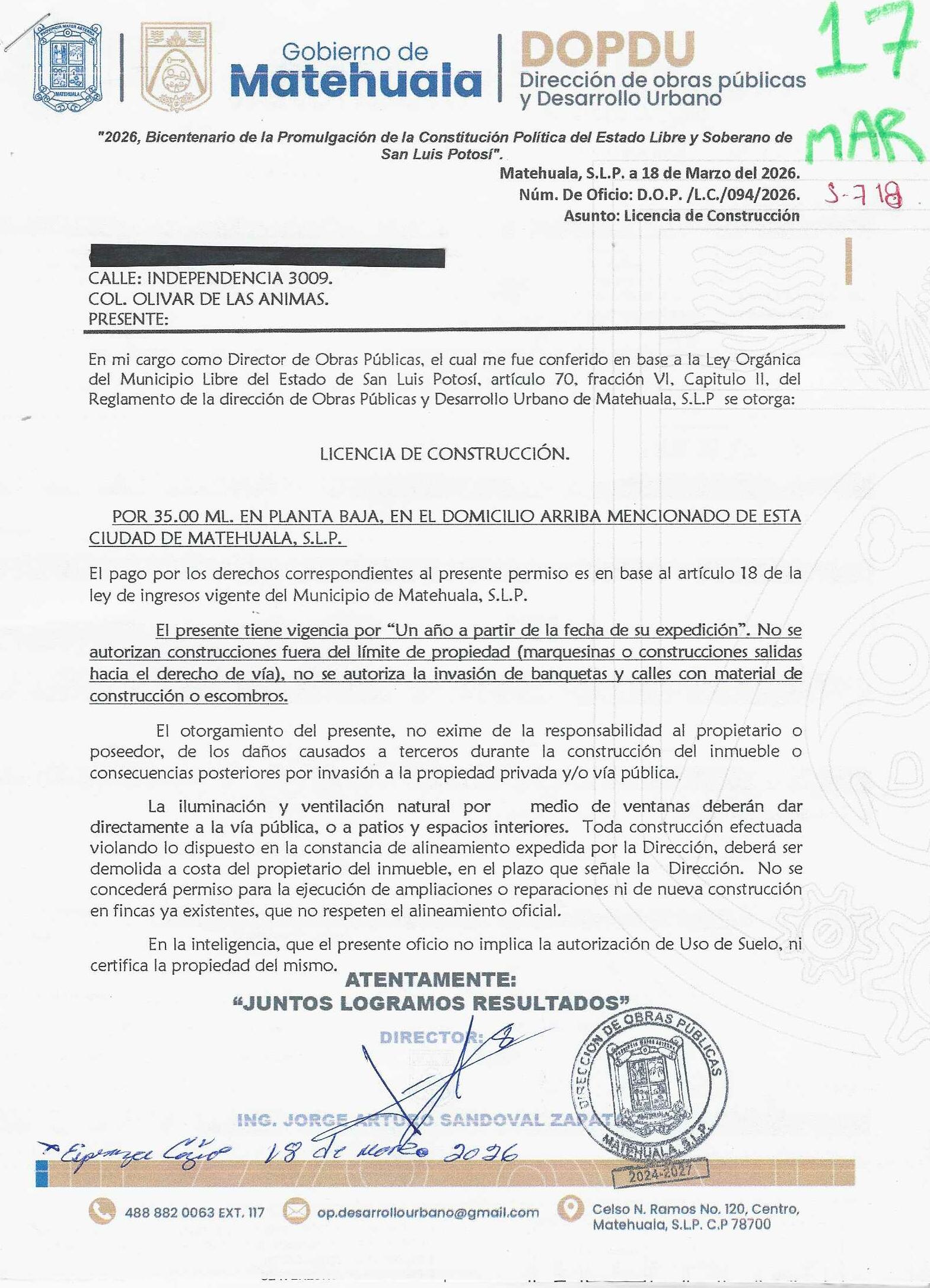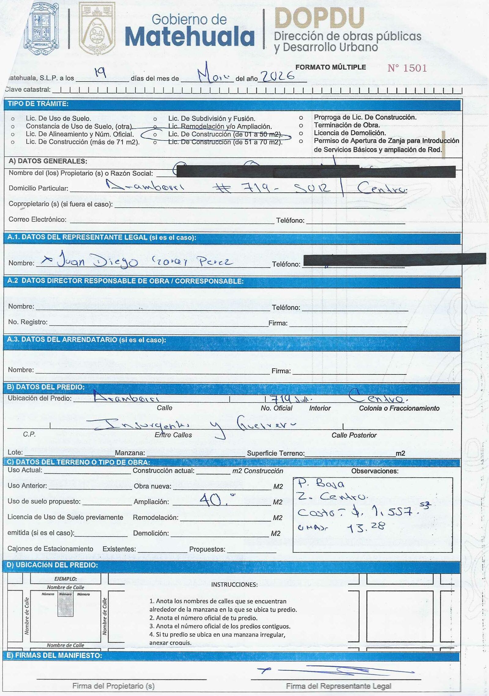 2026 01/03/2026 31/03/2026 DOP/LC/082/2026 CONSTRUCCION RAUL ZAPATA SUSTAITA LERDO DE TEJADA 725 0 Colonia 0 Colonia LAS MERCEDES I 20 MATEHUALA 20 MATEHUALA 24 San Luis Potosí 78716 "http://www.cegaipslp.org.mx/HV2026.nsf/nombre_de_la_vista/5EF5743E5D1D81EB06258DCD005E8ECB/$File/14+RAUL+ZAPATA+SUSTAITA.jpg " 13/03/2026 13/03/2027 HABITACIONAL "http://www.cegaipslp.org.mx/HV2026.nsf/nombre_de_la_vista/FBC4CC6F14DE415406258DCD0063B9C1/$File/14+RAUL+ZAPATA+SUSTAITA.jpg " DIRECCIÓN DE OBRAS PÚBLICAS Y DESARROLLO URBANO 02/04/2026 COBRO NORMAL