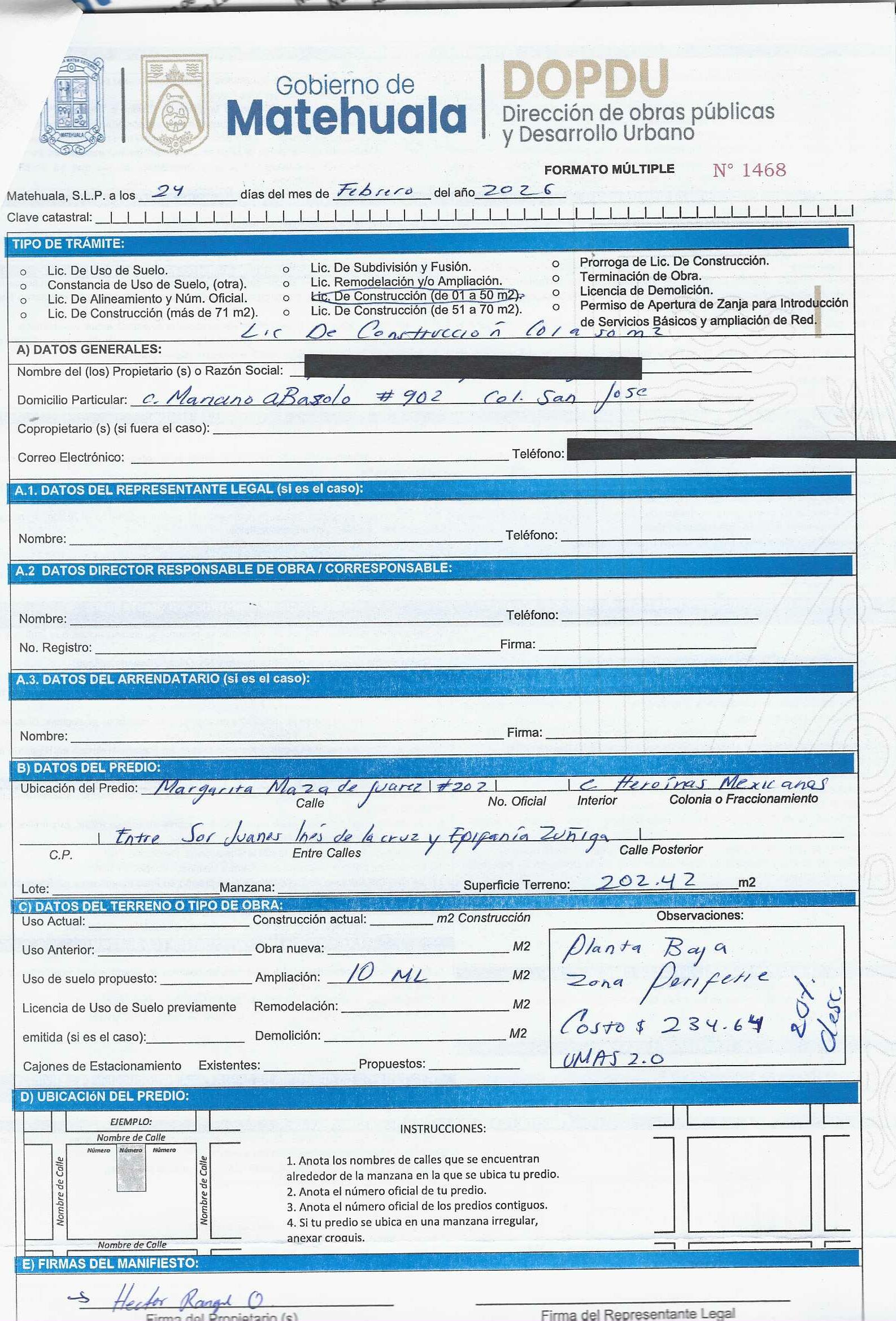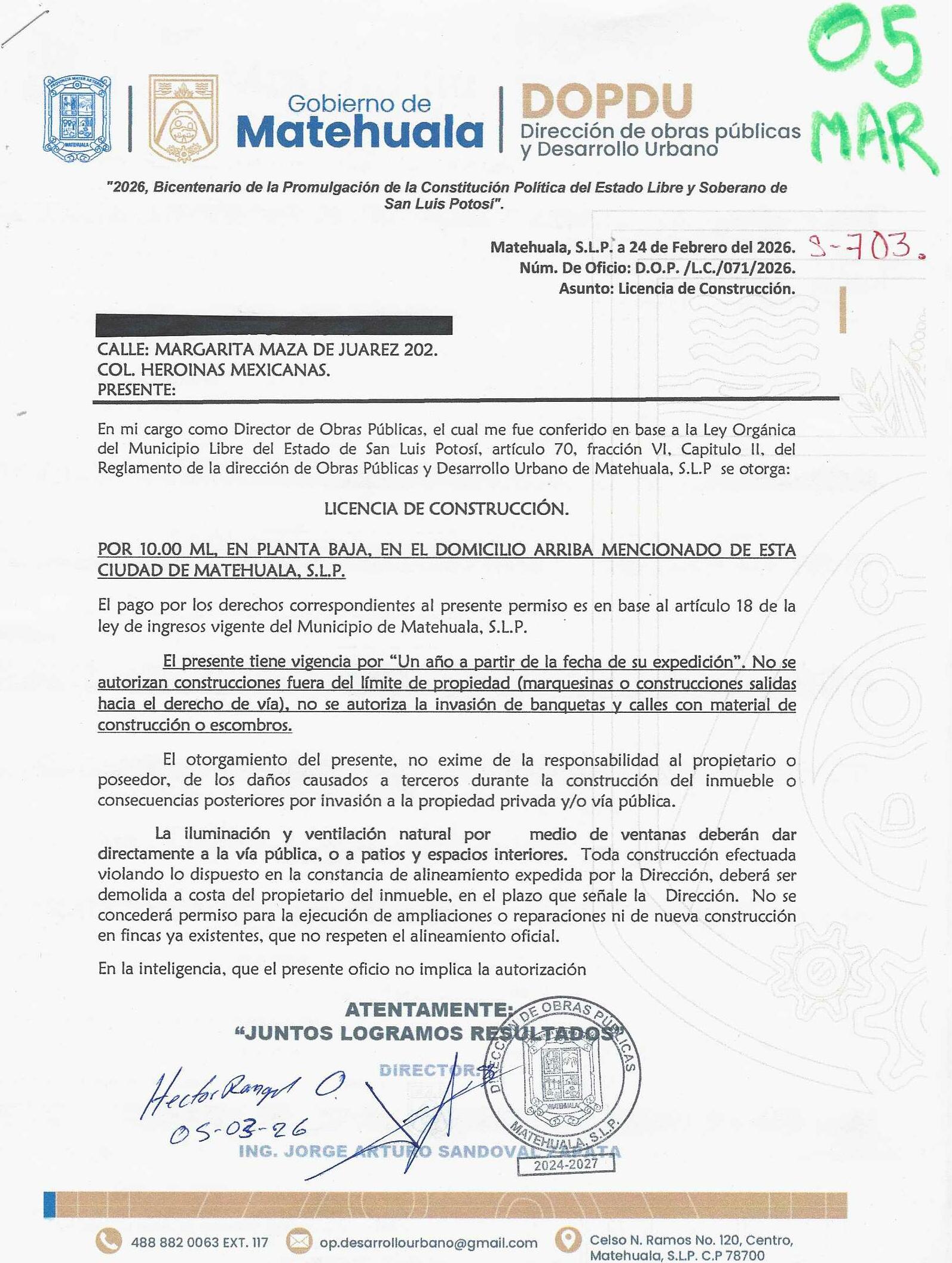 2026 01/03/2026 31/03/2026 DOP/LC/071/2026 CONSTRUCCION HECTOR RANGEL OBREGON MARGARITA MAZA DE JUAREZ 202 0 Colonia 0 Colonia HEROINAS MEXICANAS 20 MATEHUALA 20 MATEHUALA 24 San Luis Potosí 0 "http://www.cegaipslp.org.mx/HV2026.nsf/nombre_de_la_vista/2EC2784D578E883606258DCD005E200A/$File/05+HECTOR+RANGEL+OBREGON.jpg " 05/03/2026 05/03/2027 HABITACIONAL "http://www.cegaipslp.org.mx/HV2026.nsf/nombre_de_la_vista/C9B807D93FC7B22906258DCD0062000D/$File/05+HECTOR+RANGEL+OBREGON.jpg " DIRECCIÓN DE OBRAS PÚBLICAS Y DESARROLLO URBANO 02/04/2026 20 % DESCUENTO