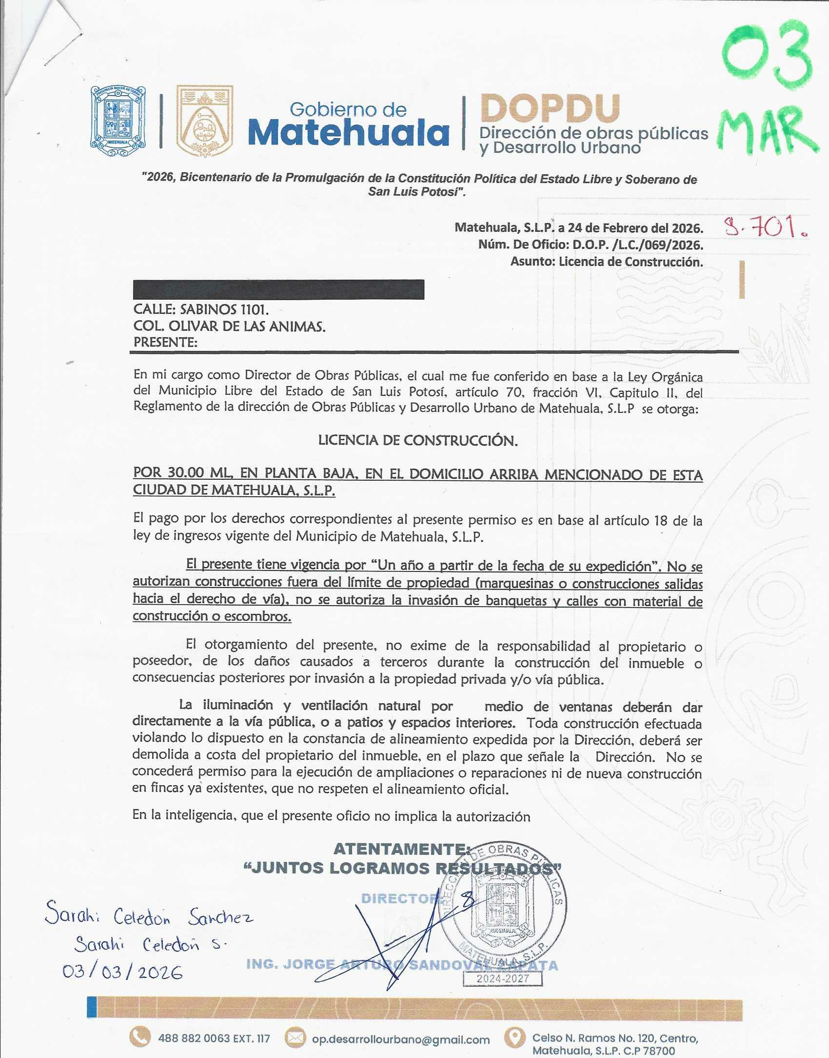 2026 01/03/2026 31/03/2026 DOP/LC/069/2026 CONSTRUCCION SARAHI CELEDON SANCHEZ SABINOS 1101 0 Colonia 0 Colonia OLIVAR DE LAS ANIMAS 20 MATEHUALA 20 MATEHUALA 24 San Luis Potosí 78790 "http://www.cegaipslp.org.mx/HV2026.nsf/nombre_de_la_vista/2A72BAEDE76B44C406258DCD005E08B1/$File/03+SARAHI+CELEDON+SANCHEZ.jpg " 03/03/2026 03/03/2027 HABITACIONAL "http://www.cegaipslp.org.mx/HV2026.nsf/nombre_de_la_vista/378108D1BEB1F9E206258DCD006166D3/$File/03+SARAHI+CELEDON+SANCHEZ.jpg " DIRECCIÓN DE OBRAS PÚBLICAS Y DESARROLLO URBANO 02/04/2026 50 % DESCUENTO INSEN
