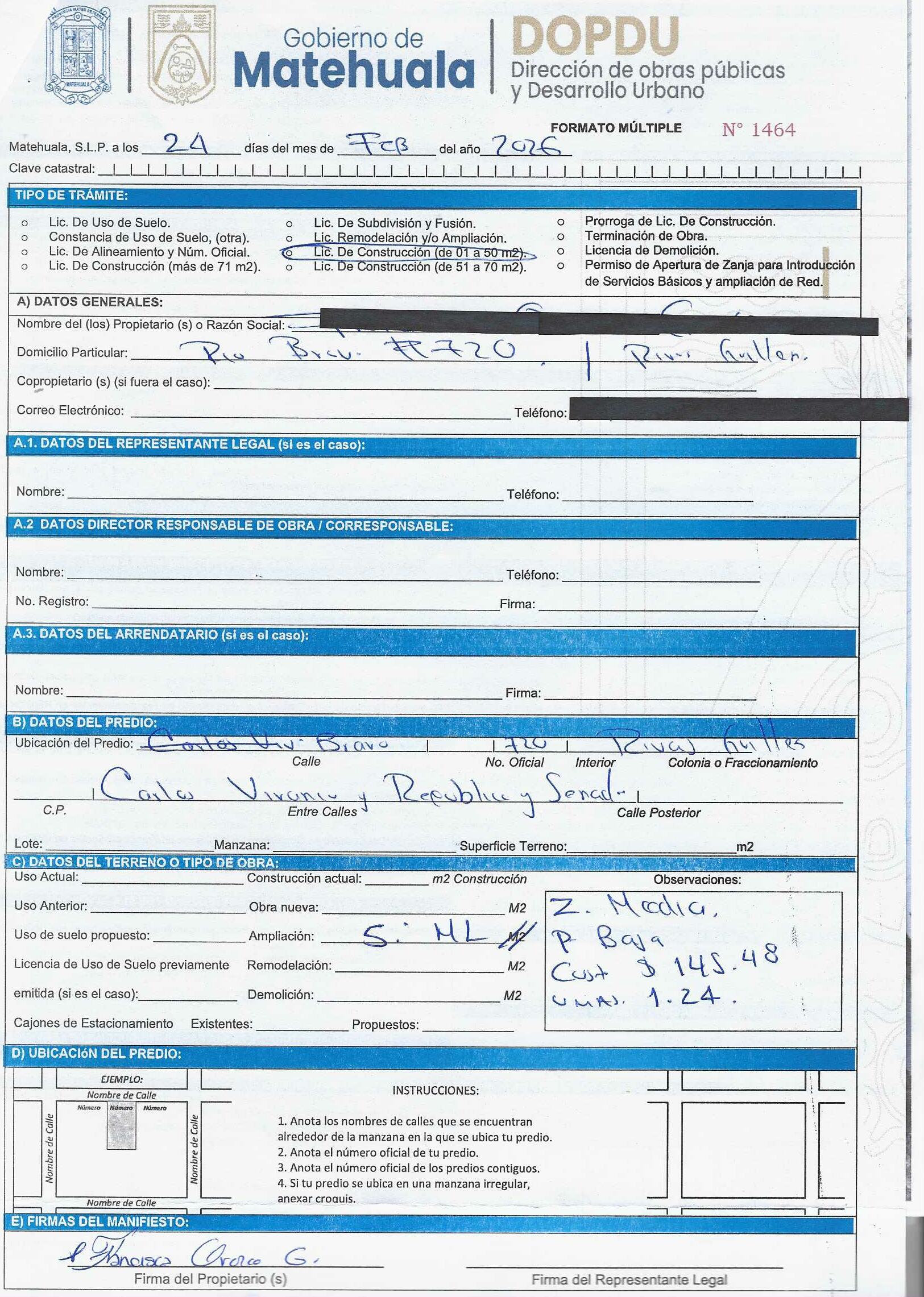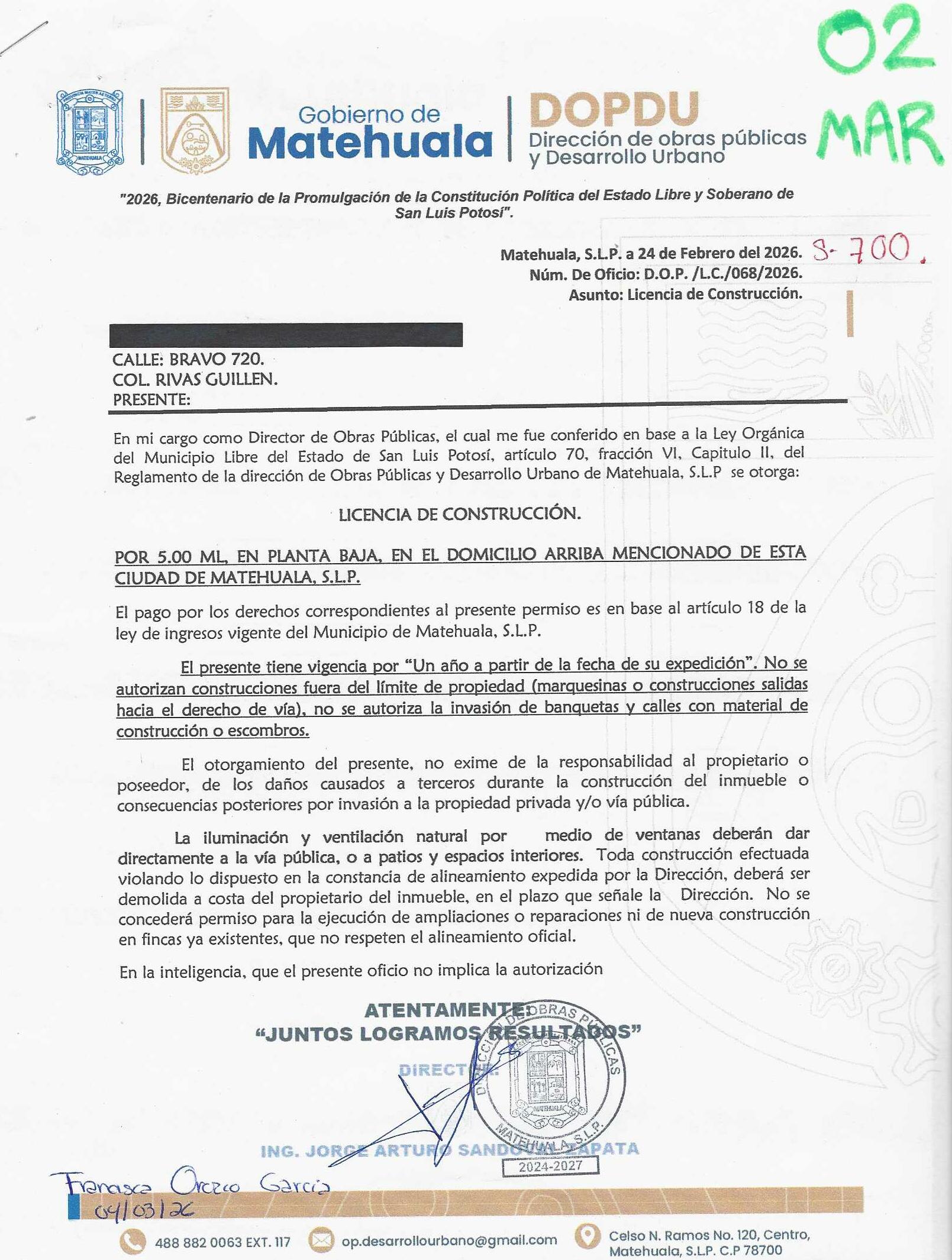 2026 01/03/2026 31/03/2026 DOP/LC/068/2026 CONSTRUCCION FRANCISCA OROZCO GARCIA BRAVO 720 0 Colonia 0 Colonia RIVAS GUILLEN 20 MATEHUALA 20 MATEHUALA 24 San Luis Potosí 78780 "http://www.cegaipslp.org.mx/HV2026.nsf/nombre_de_la_vista/385B5E61276EB6A206258DCD005DFA5E/$File/02+FRANCISCA+OROZCO+GARCIA.jpg " 24/02/2026 24/02/2027 HABITACIONAL "http://www.cegaipslp.org.mx/HV2026.nsf/nombre_de_la_vista/56025C82FA8147A906258DCD00614616/$File/02+FRANCISCA+OROZCO+GARCIA.jpg " DIRECCIÓN DE OBRAS PÚBLICAS Y DESARROLLO URBANO 02/04/2026 20 % DESCUENTO