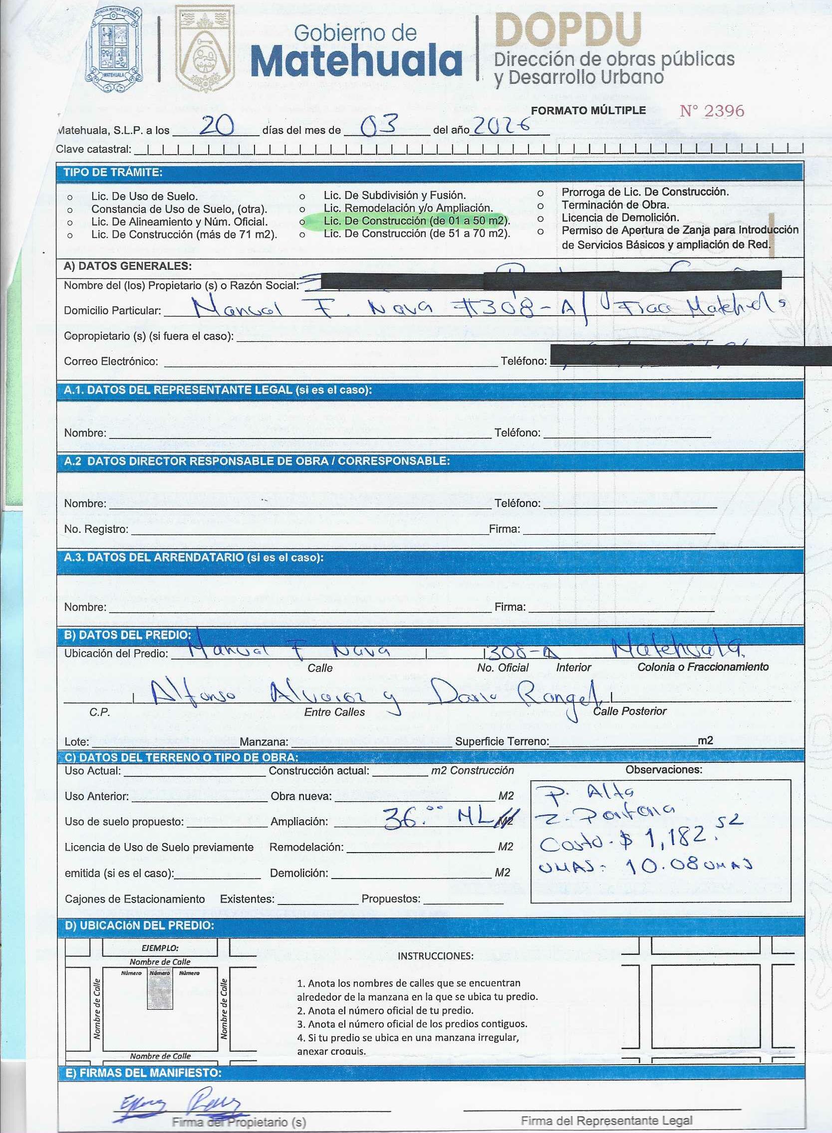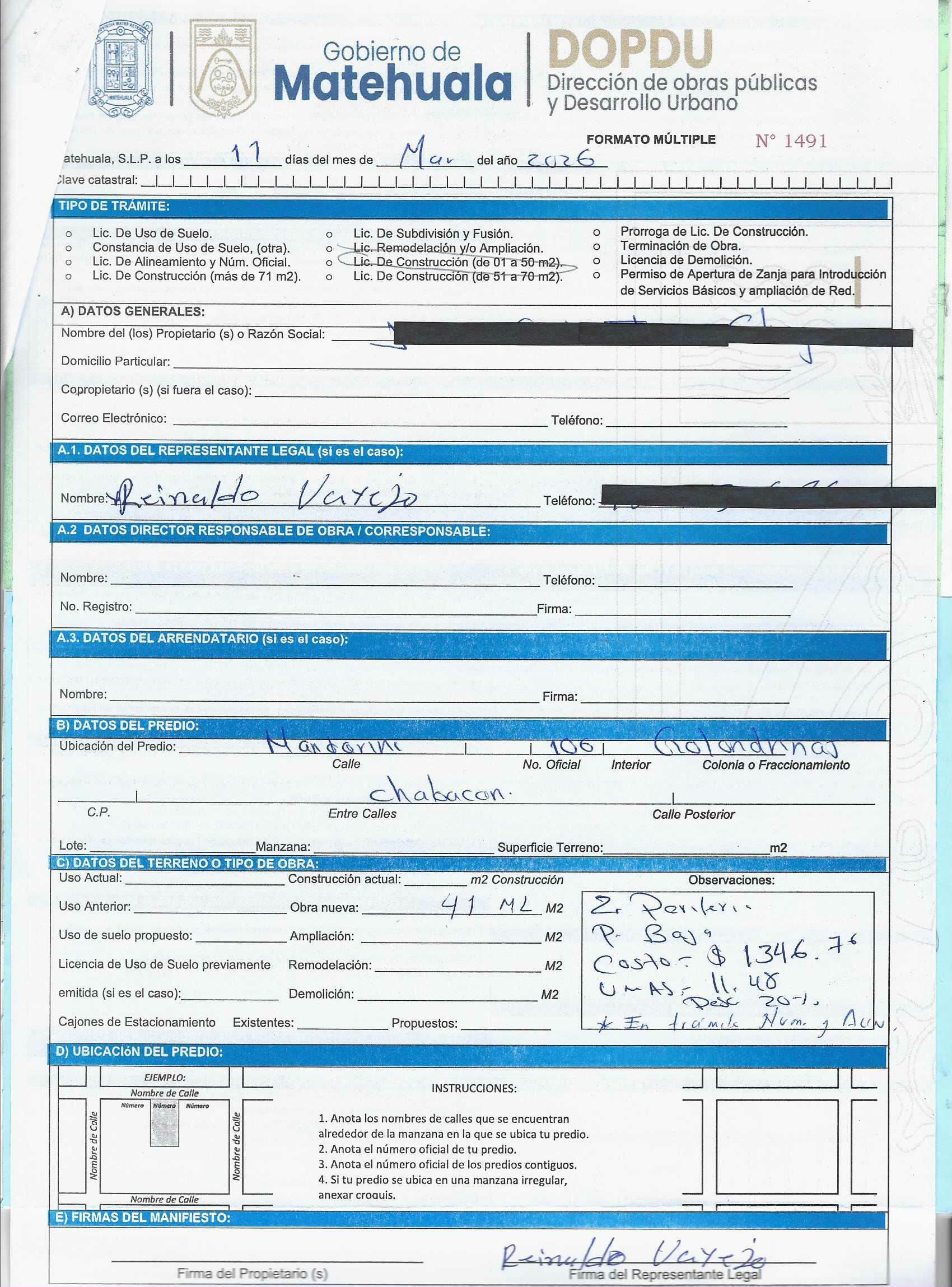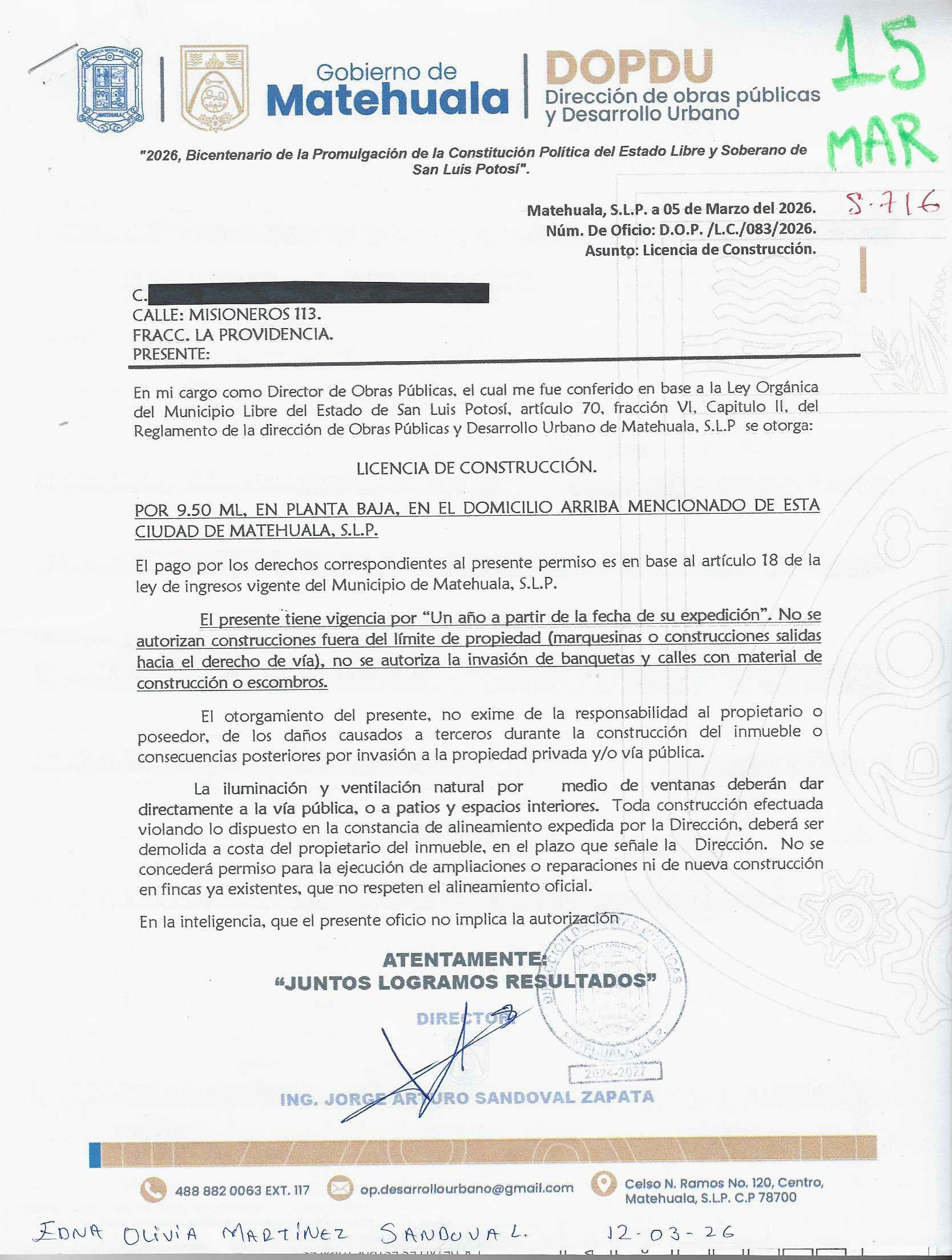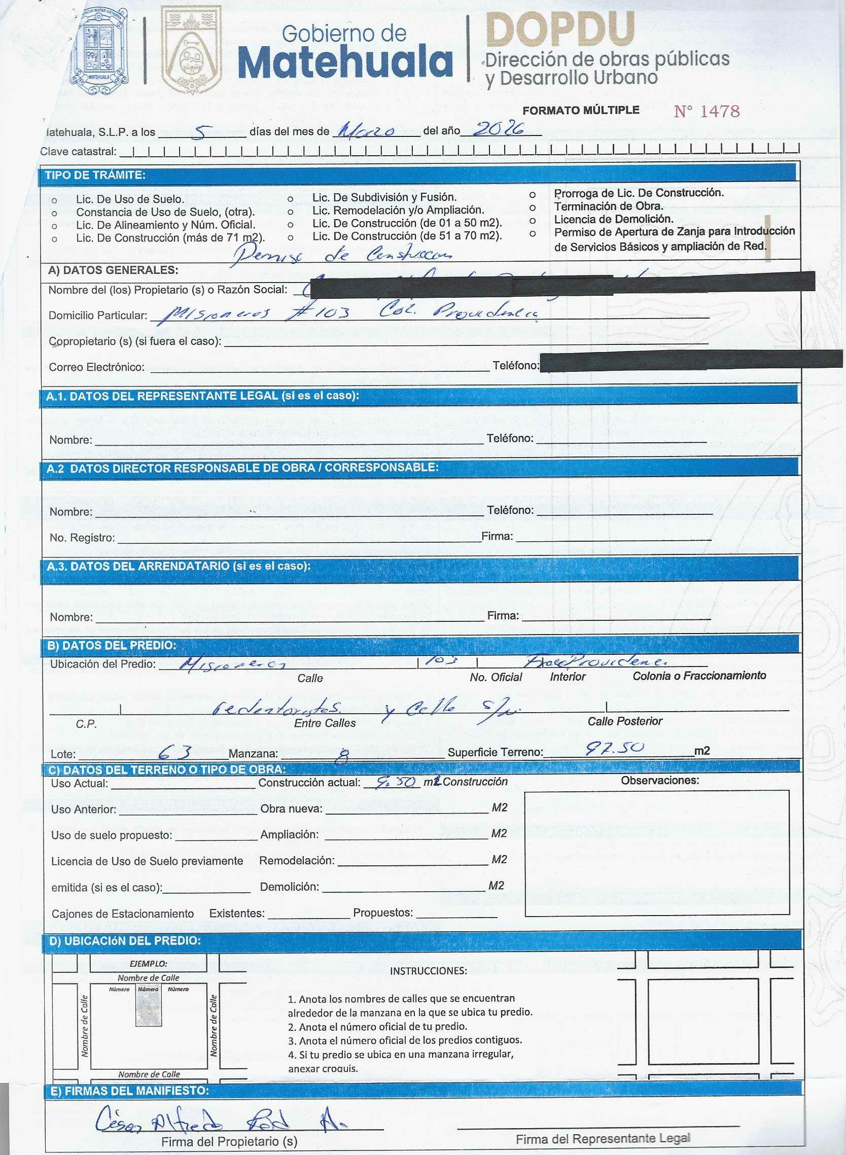 2026 01/03/2026 31/03/2026 DOP/LC/083/2026 CONSTRUCCION CESAR ALFREDO RODRIGUEZ HERRERA MISIONEROS 113 0 Fraccionamiento 0 Fraccionamiento LA PROVIDENCIA 20 MATEHUALA 20 MATEHUALA 24 San Luis Potosí 78796 "http://www.cegaipslp.org.mx/HV2026.nsf/nombre_de_la_vista/E616ED6DF18A3BD706258DCD005E9EC4/$File/15+CESAR+ALFREDO+RODRIGUEZ+HERRERA.jpg " 05/03/2026 05/03/2027 HABITACIONAL "http://www.cegaipslp.org.mx/HV2026.nsf/nombre_de_la_vista/9743B3DF7AA5DAB606258DCD0063E394/$File/15+CESAR+ALFREDO+RODRIGUEZ+HERRERA.jpg " DIRECCIÓN DE OBRAS PÚBLICAS Y DESARROLLO URBANO 02/04/2026 COBRO NORMAL