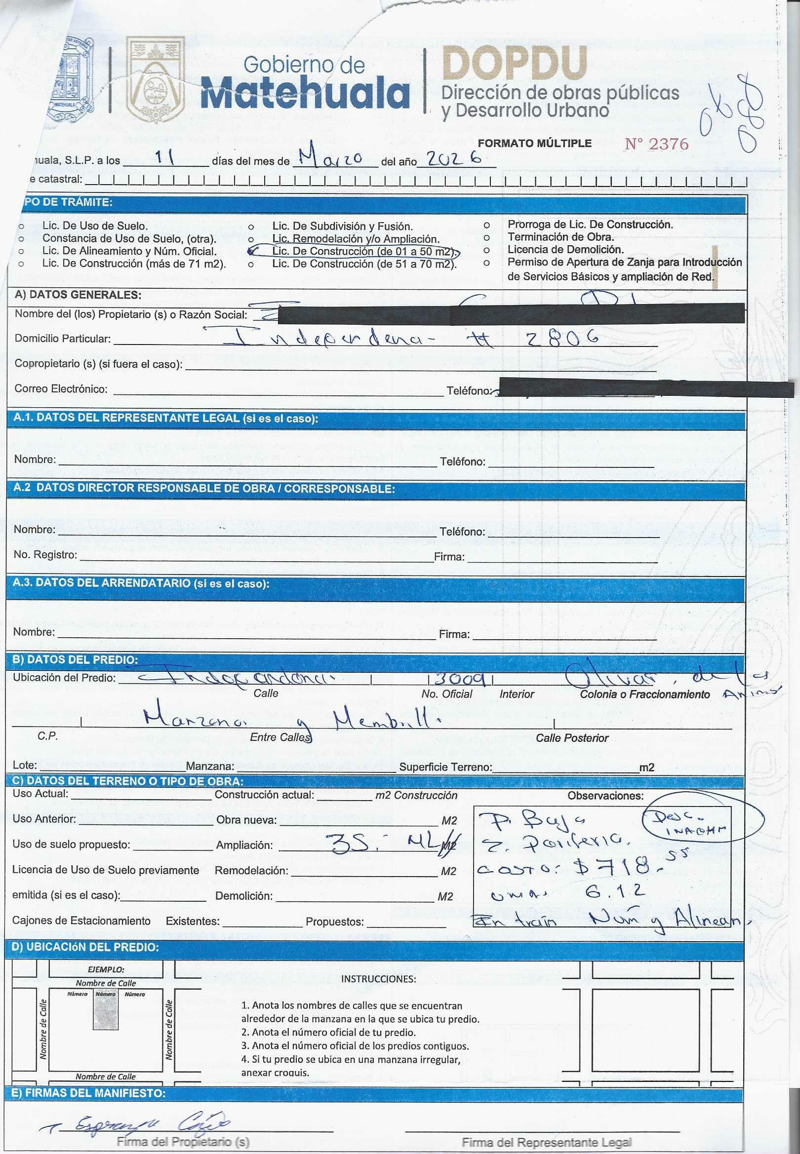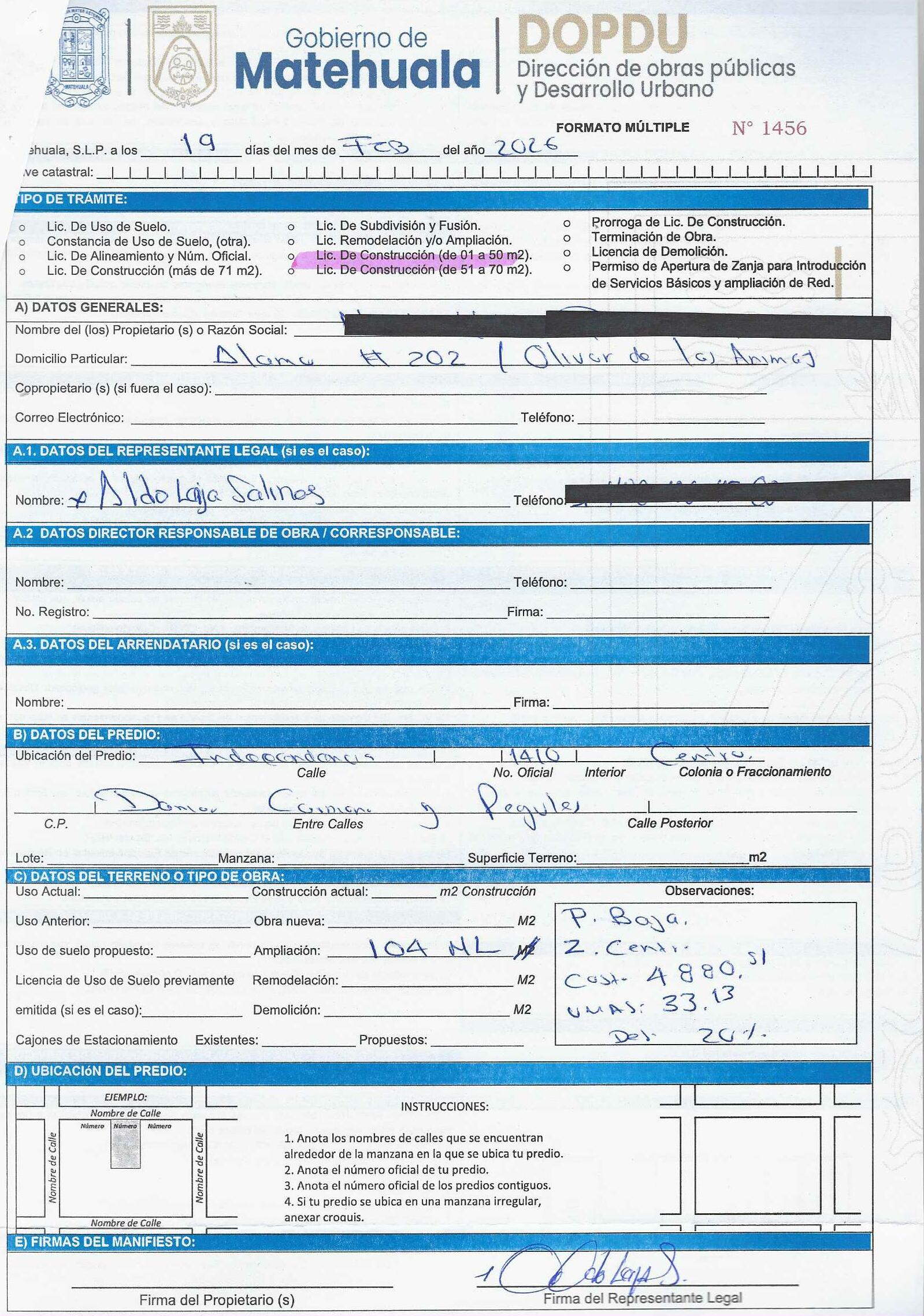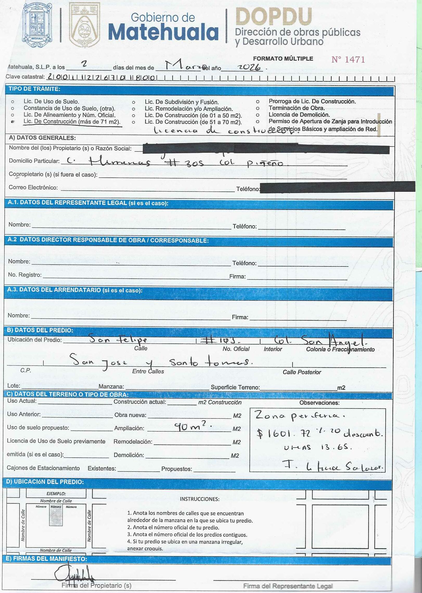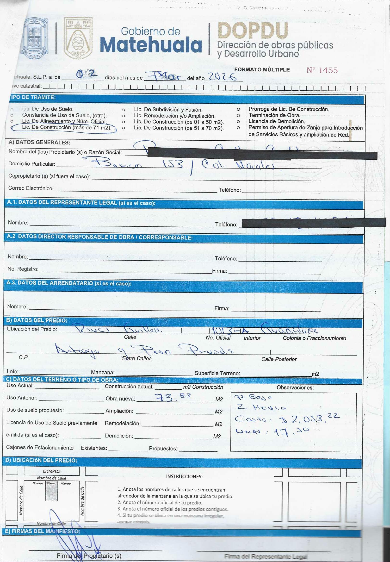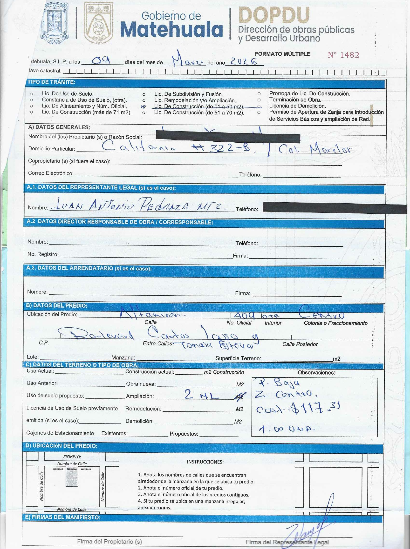 2026 01/03/2026 31/03/2026 DOP/LC/083/2026 CONSTRUCCION CESAR ALFREDO RODRIGUEZ HERRERA MISIONEROS 113 0 Fraccionamiento 0 Fraccionamiento LA PROVIDENCIA 20 MATEHUALA 20 MATEHUALA 24 San Luis Potosí 78796 "http://www.cegaipslp.org.mx/HV2026.nsf/nombre_de_la_vista/E616ED6DF18A3BD706258DCD005E9EC4/$File/15+CESAR+ALFREDO+RODRIGUEZ+HERRERA.jpg " 05/03/2026 05/03/2027 HABITACIONAL "http://www.cegaipslp.org.mx/HV2026.nsf/nombre_de_la_vista/9743B3DF7AA5DAB606258DCD0063E394/$File/15+CESAR+ALFREDO+RODRIGUEZ+HERRERA.jpg " DIRECCIÓN DE OBRAS PÚBLICAS Y DESARROLLO URBANO 02/04/2026 COBRO NORMAL