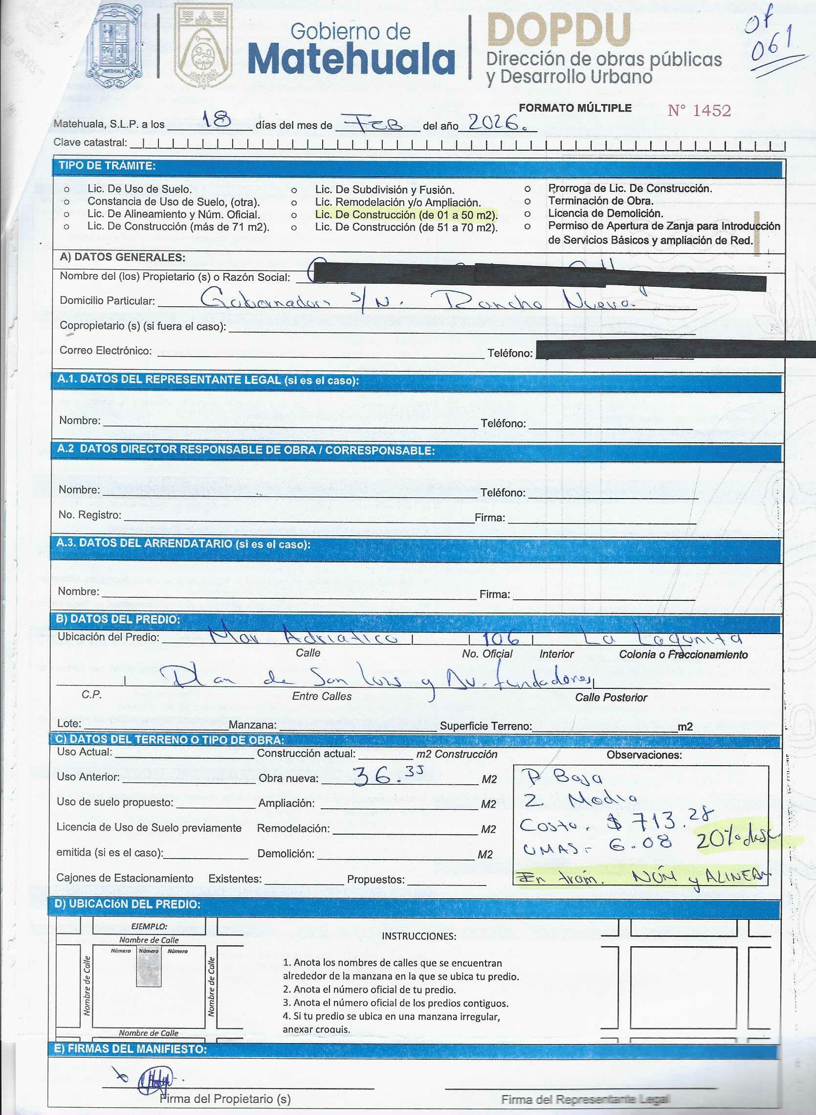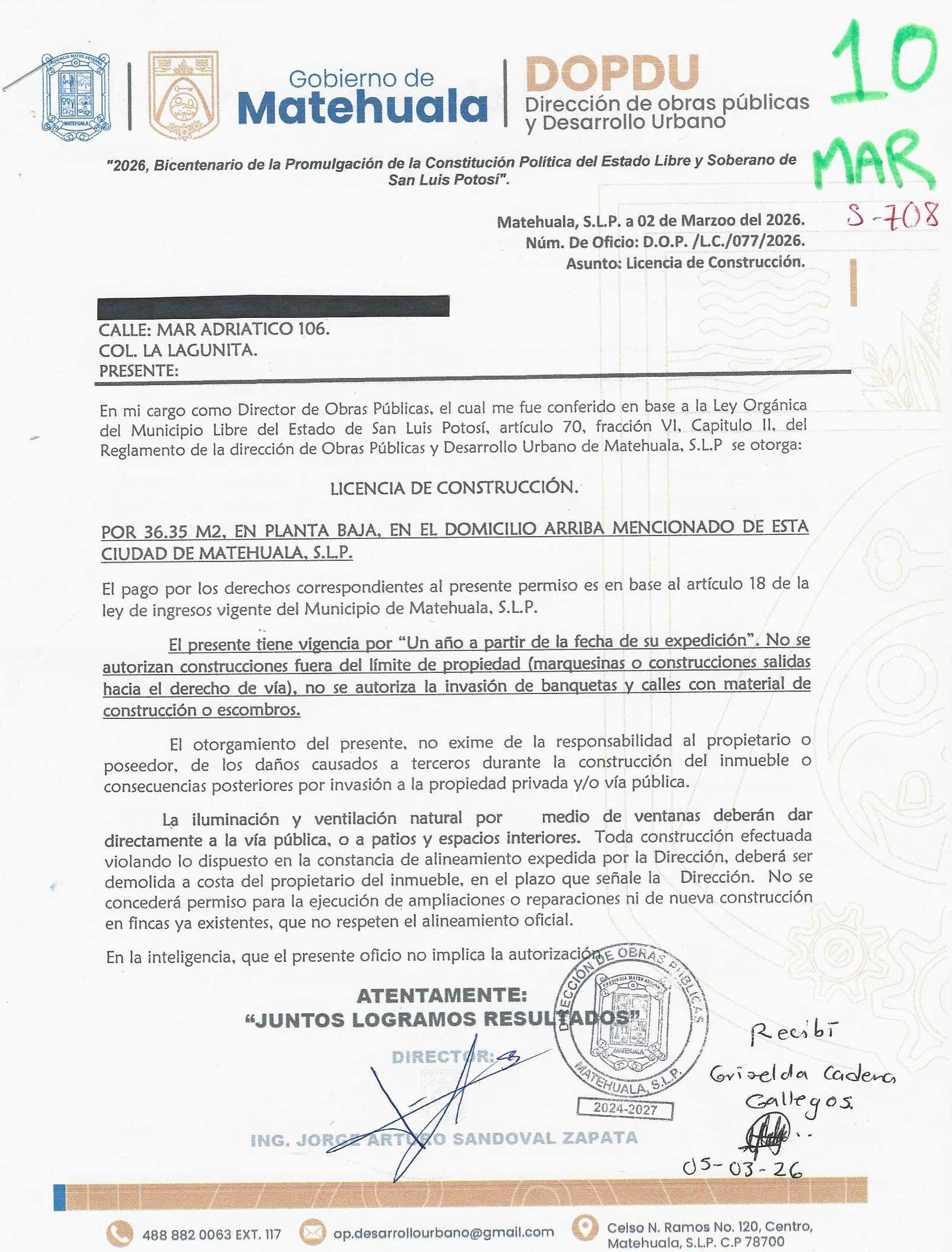 2026 01/03/2026 31/03/2026 DOP/LC/077/2026 CONSTRUCCION GRISELDA CADENA GALLEGOS MAR ADRIATICO 106 0 Colonia 0 Colonia LA LAGUNITA 20 MATEHUALA 20 MATEHUALA 24 San Luis Potosí 78770 "http://www.cegaipslp.org.mx/HV2026.nsf/nombre_de_la_vista/97A42EA8B6F8492D06258DCD005E5740/$File/10+GRISELDA+CADENA+GALLEGOS.jpg " 02/03/2026 02/03/2027 HABITACIONAL "http://www.cegaipslp.org.mx/HV2026.nsf/nombre_de_la_vista/42EB84025966AC6C06258DCD0062A2C3/$File/10+GRISELDA+CADENA+GALLEGOS.jpg " DIRECCIÓN DE OBRAS PÚBLICAS Y DESARROLLO URBANO 02/04/2026 20 % DESCUENTO