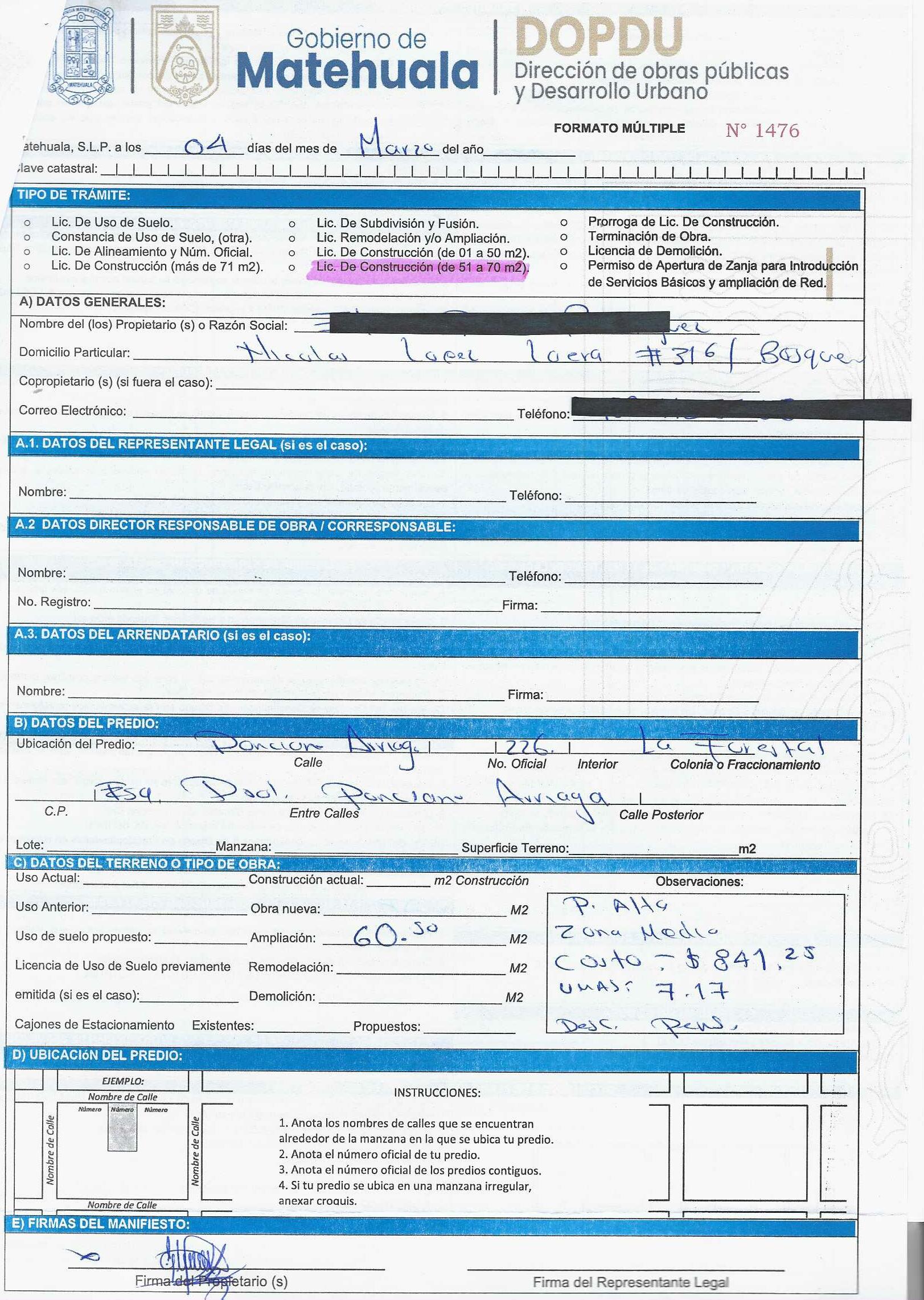 2026 01/03/2026 31/03/2026 DOP/LC/080/2026 CONSTRUCCION ELVIA DIAZ RODRIGUEZ PONCIANO ARRIAGA 226 0 Colonia 0 Colonia LA FORESTAL 20 MATEHUALA 20 MATEHUALA 24 San Luis Potosí 78730 "http://www.cegaipslp.org.mx/HV2026.nsf/nombre_de_la_vista/590FFEDB4A0763EA06258DCD005E76CD/$File/12+ELVIA+DIAZ+RODRIGUEZ.jpg " 11/03/2026 11/03/2027 HABITACIONAL "http://www.cegaipslp.org.mx/HV2026.nsf/nombre_de_la_vista/6155116AC04771DE06258DCD0062F97A/$File/12+ELVIA+DIAZ+RODRIGUEZ.jpg " DIRECCIÓN DE OBRAS PÚBLICAS Y DESARROLLO URBANO 02/04/2026 50 % DESCUENTO INSEN