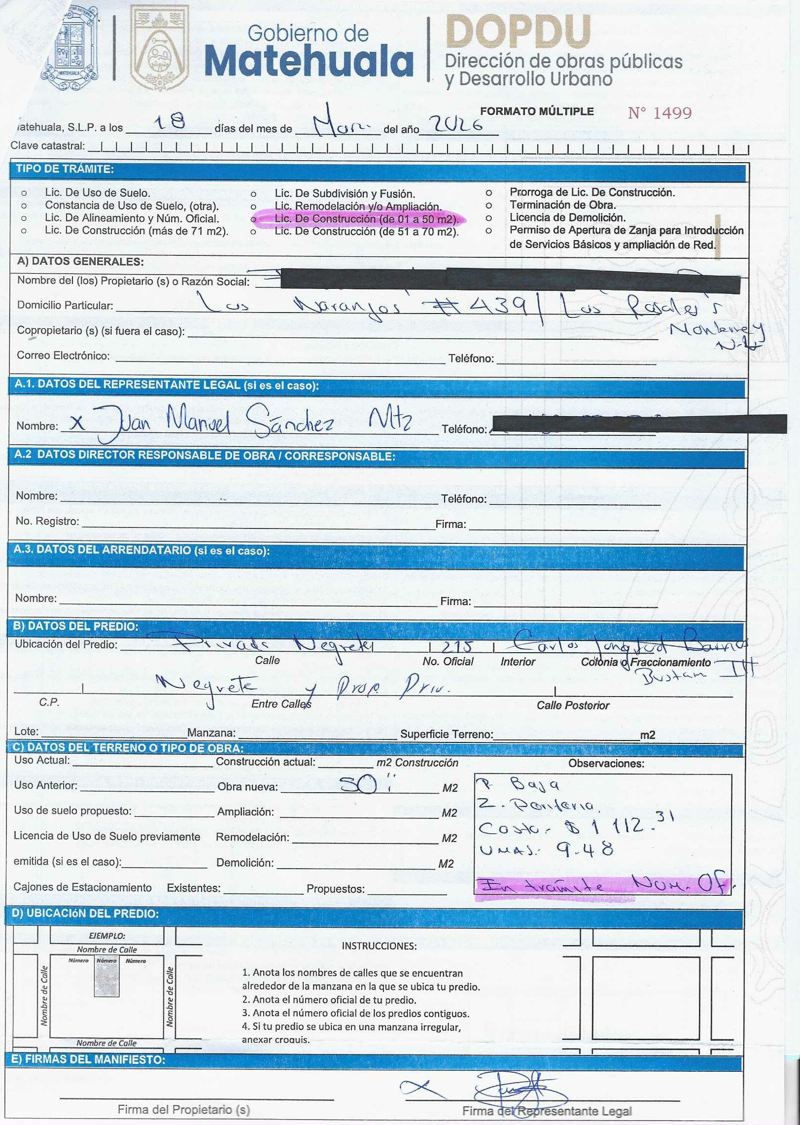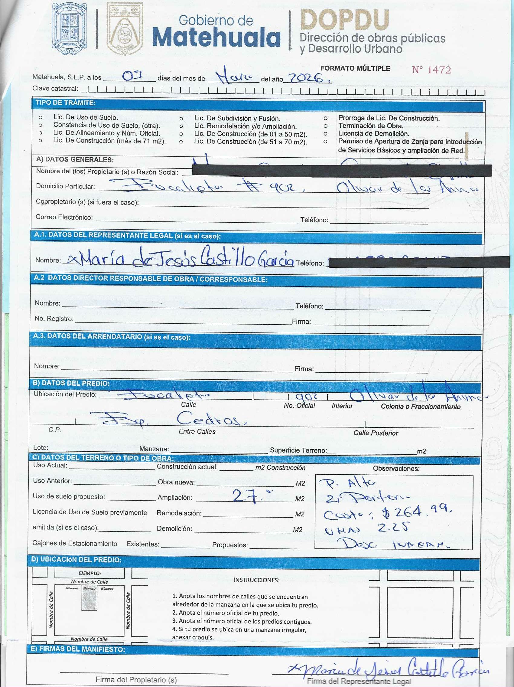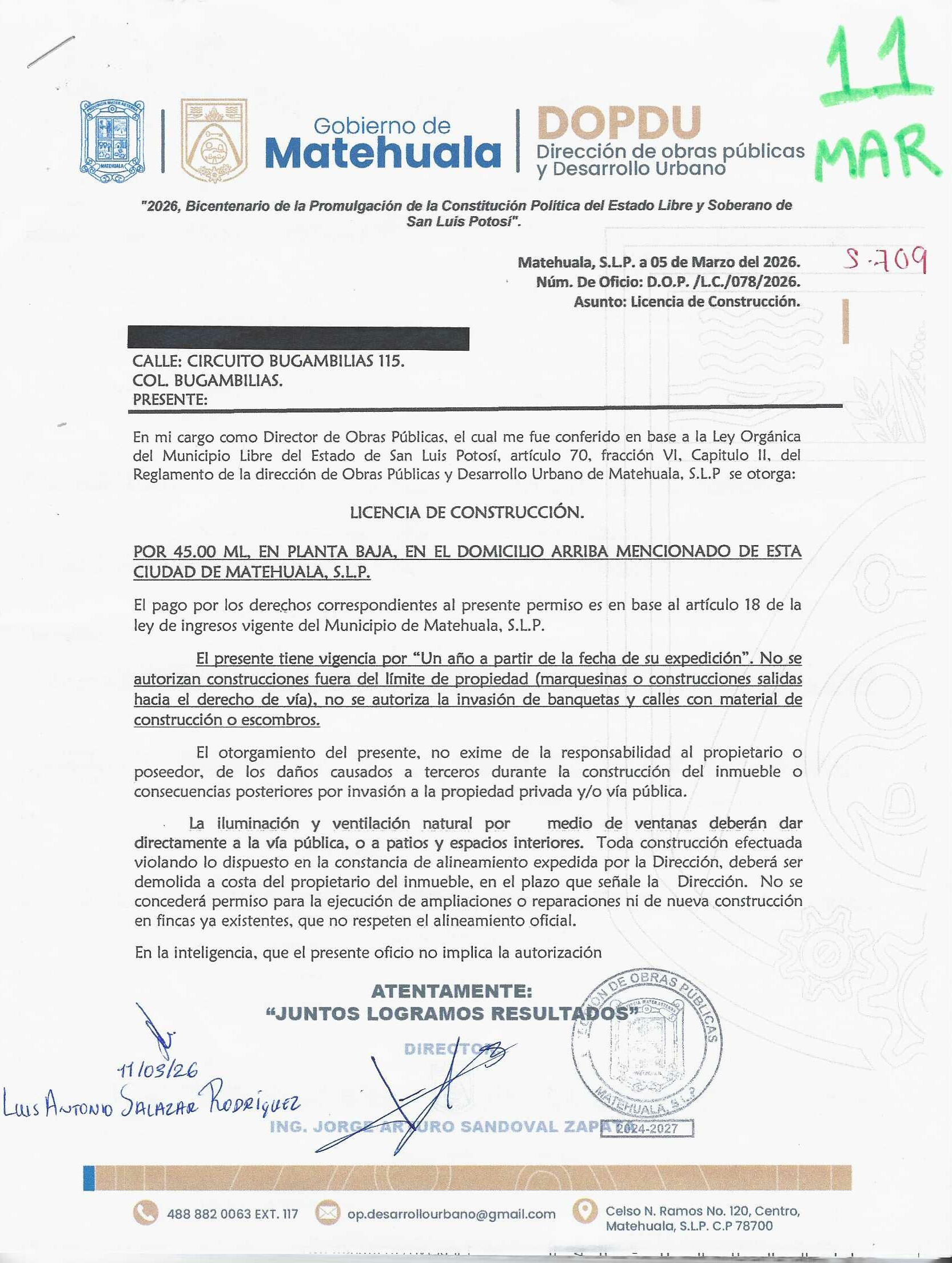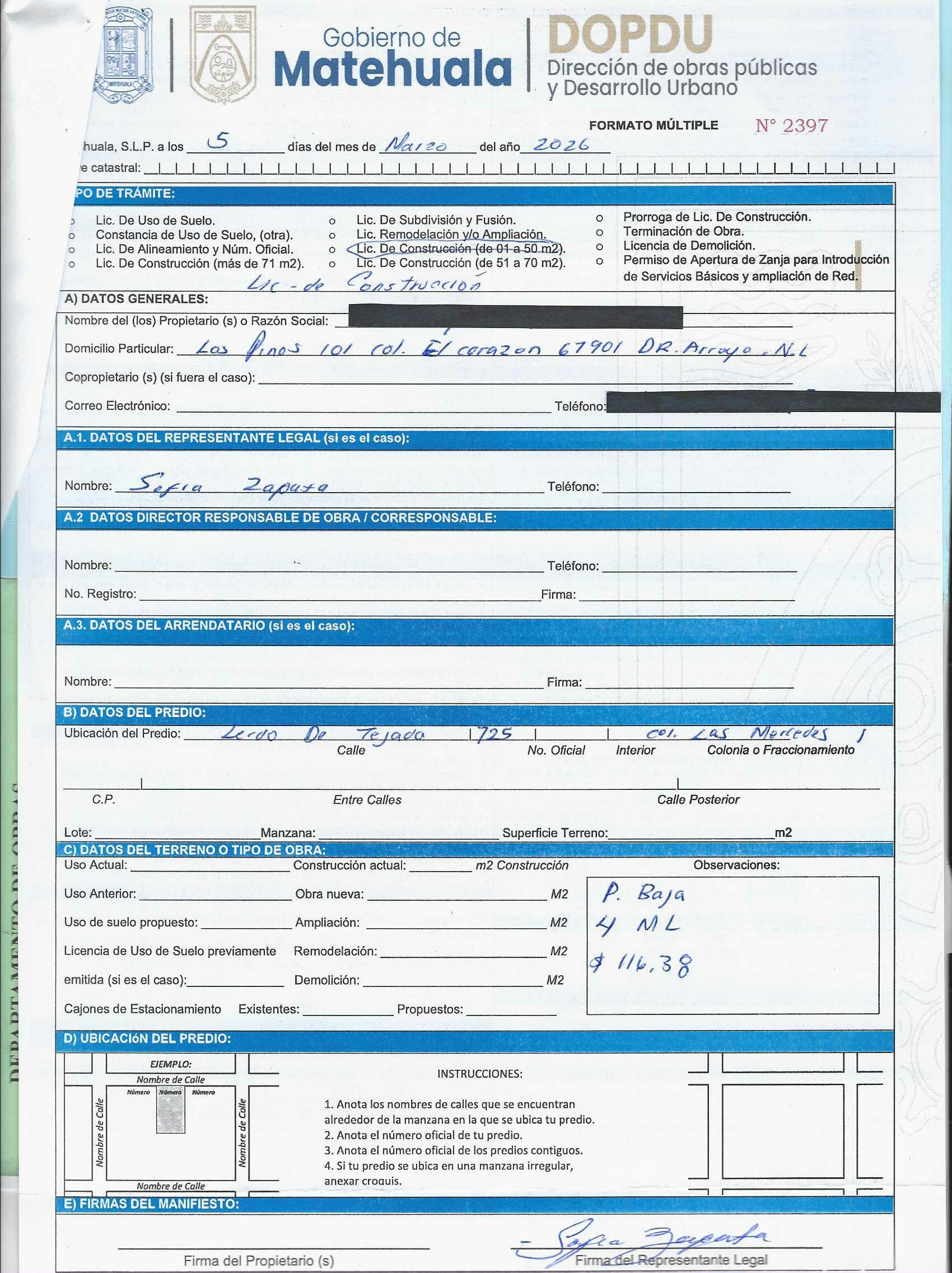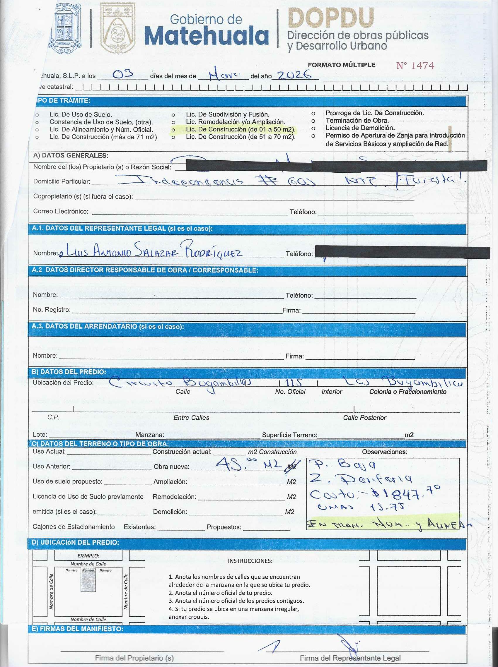2026 01/03/2026 31/03/2026 DOP/LC/078/2026 CONSTRUCCION BERENICE MARTINEZ SUSTAITA CIRCUITO BUGAMBILIAS 115 0 Colonia 0 Colonia BUGAMBILIAS 20 MATEHUALA 20 MATEHUALA 24 San Luis Potosí 78710 "http://www.cegaipslp.org.mx/HV2026.nsf/nombre_de_la_vista/B4330583167B1DC606258DCD005E6994/$File/11+BERENICE+MARTINEZ+SUSTAITA.jpg " 11/03/2026 11/03/2027 HABITACIONAL "http://www.cegaipslp.org.mx/HV2026.nsf/nombre_de_la_vista/DD9FD3C1FA80676A06258DCD0062D00A/$File/11+BERENICE+MARTINEZ+SUSTAITA.jpg " DIRECCIÓN DE OBRAS PÚBLICAS Y DESARROLLO URBANO 02/04/2026 COBRO NORMAL