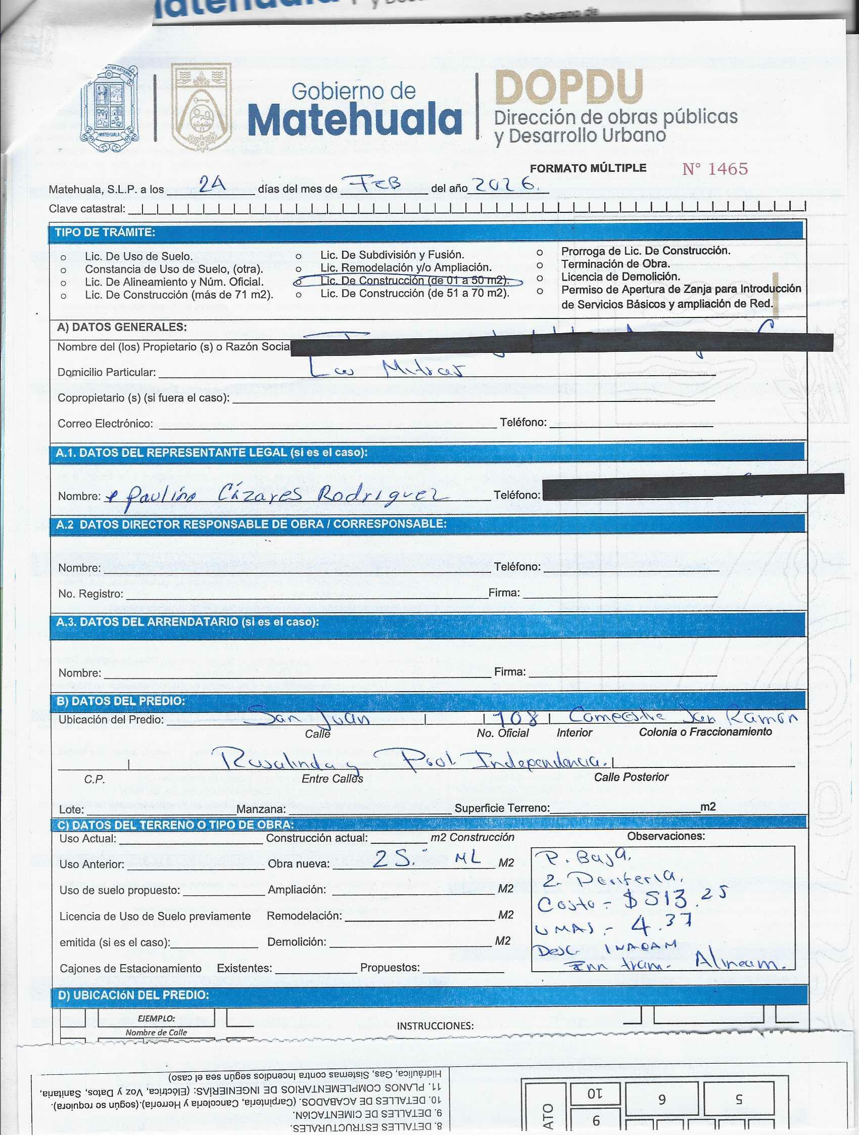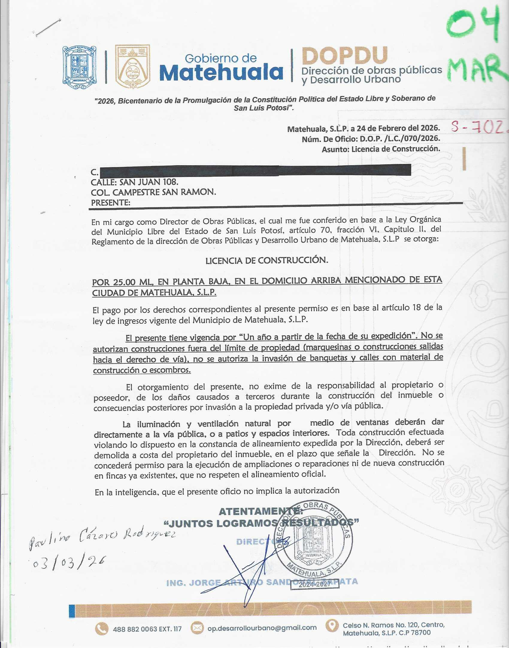 2026 01/03/2026 31/03/2026 DOP/LC/070/2026 CONSTRUCCION PAULINA CAZARES RODRIGUEZ SAN JUAN 108 0 Colonia 0 Colonia CAMPESTRE SAN RAMON 20 MATEHUALA 20 MATEHUALA 24 San Luis Potosí 0 "http://www.cegaipslp.org.mx/HV2026.nsf/nombre_de_la_vista/76CFCA2A2EF3FCDB06258DCD005E15EE/$File/04+PAULINA+CAZARES+RODRIGUEZ.jpg " 03/03/2026 03/03/2027 HABITACIONAL "http://www.cegaipslp.org.mx/HV2026.nsf/nombre_de_la_vista/E5A9303918F6C51806258DCD00617103/$File/04+PAULINA+CAZARES+RODRIGUEZ.jpg " DIRECCIÓN DE OBRAS PÚBLICAS Y DESARROLLO URBANO 02/04/2026 COBRO NORMAL
