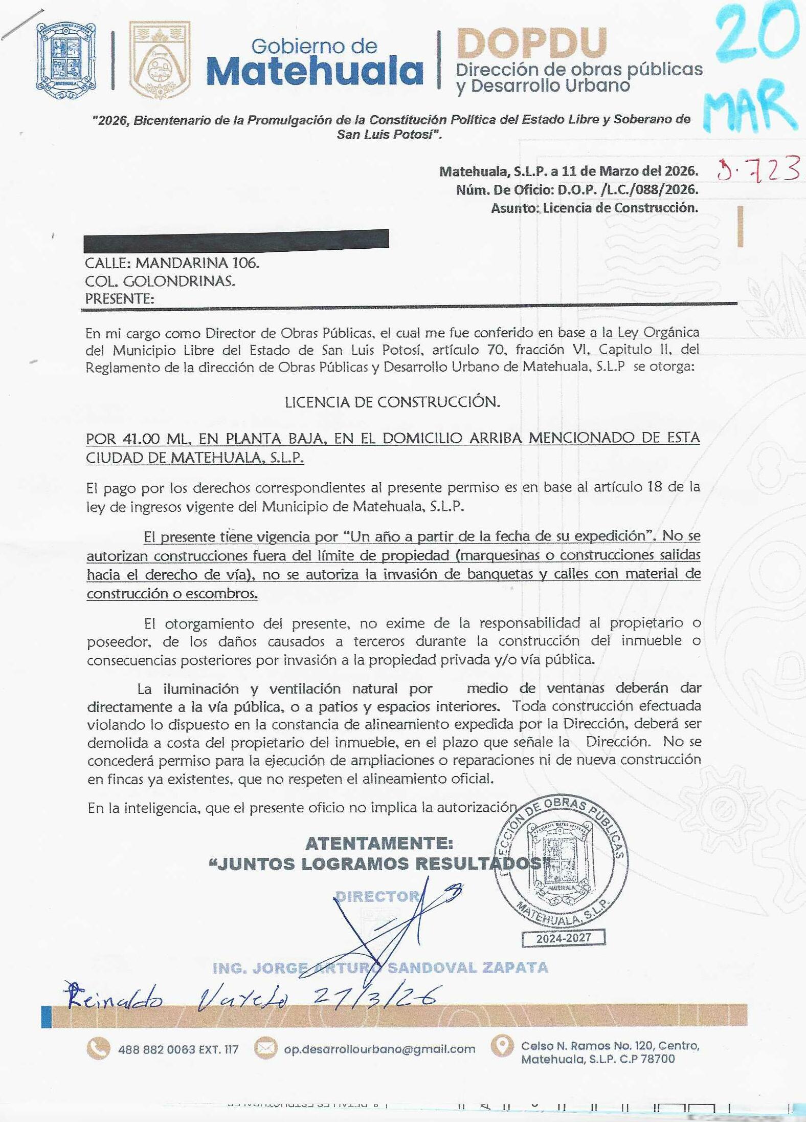 2026 01/03/2026 31/03/2026 DOP/LC/088/2026 CONSTRUCCION JUAN CARLOS TORRES COLUNGA MANDARINA 106 0 Colonia 0 Colonia GOLONDRINAS 20 MATEHUALA 20 MATEHUALA 24 San Luis Potosí 78720 "http://www.cegaipslp.org.mx/HV2026.nsf/nombre_de_la_vista/B7C0741125CA8CED06258DCD005ED232/$File/20+JUAN+CARLOS+TORRES+COLUNGA.jpg " 27/03/2026 27/03/2027 HABITACIONAL "http://www.cegaipslp.org.mx/HV2026.nsf/nombre_de_la_vista/8208BCA2292165A206258DCD00644535/$File/20+JUAN+CARLOS+TORRES+COLUNGA.jpg " DIRECCIÓN DE OBRAS PÚBLICAS Y DESARROLLO URBANO 02/04/2026 20 % DESCUENTO