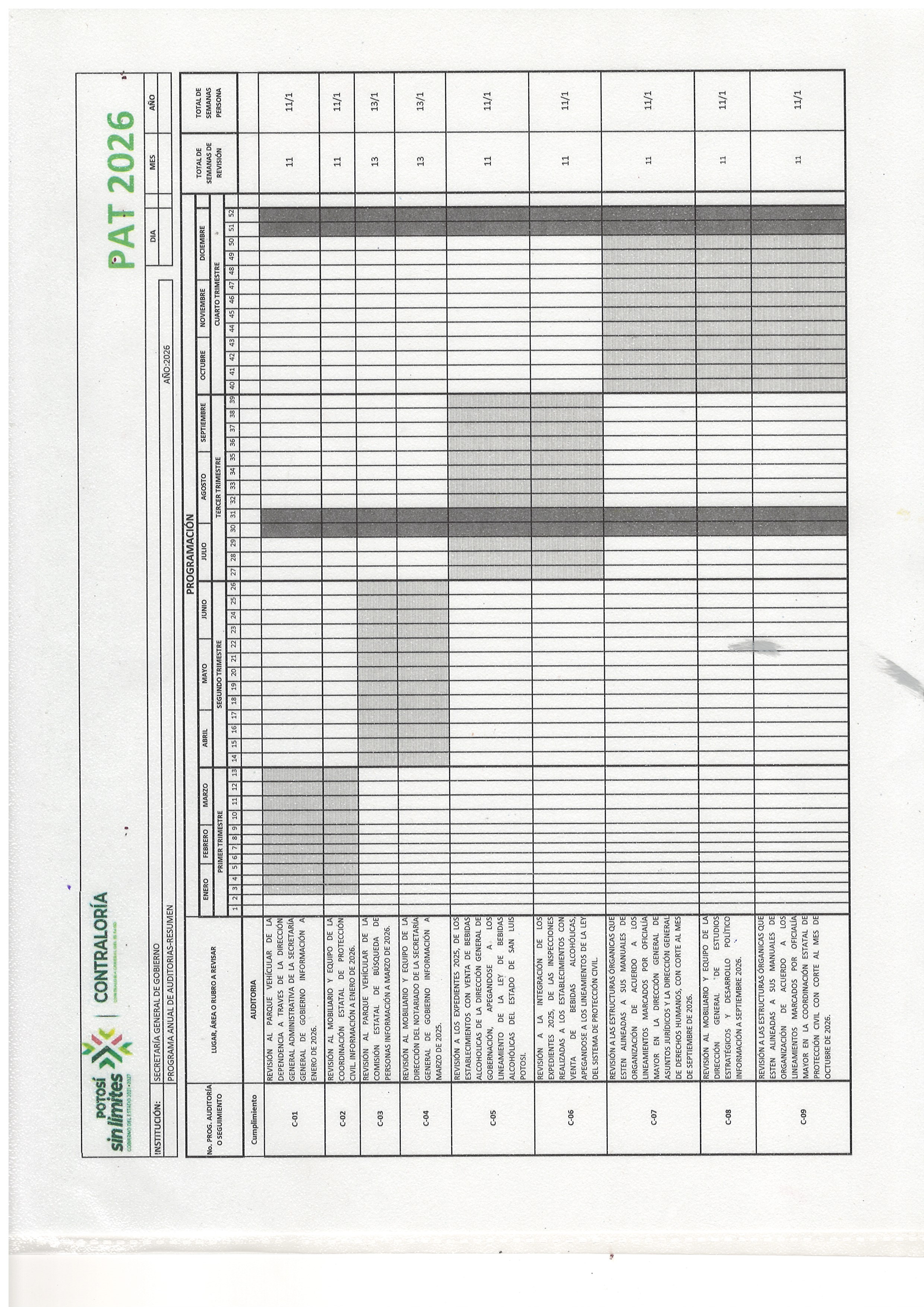del Estado, el 38 del Reglamento Interior de 1a Secretarla General de Gobierno, Ley de Bebidas Alcoholicas del S.L.P. " 0 http://www.cegaipslp.org.mx/HV2026.nsf/nombre_de_la_vista/AA450BC5BD34DE2D06258D960065D88E/$File/HIPERVINCULOXXX.docx Revision fisica del Parque vehicular. de la dependencia http://www.cegaipslp.org.mx/HV2026.nsf/nombre_de_la_vista/AA450BC5BD34DE2D06258D960065D88E/$File/HIPERVINCULOXXX.docx http://www.cegaipslp.org.mx/HV2026.nsf/nombre_de_la_vista/AA450BC5BD34DE2D06258D960065D88E/$File/HIPERVINCULOXXX.docx Auditar Dirección General Administrativa de la S.G.G. Hombre No se generó información http://www.cegaipslp.org.mx/HV2026.nsf/nombre_de_la_vista/AA450BC5BD34DE2D06258D960065D88E/$File/HIPERVINCULOXXX.docx No se generó información http://www.cegaipslp.org.mx/HV2026.nsf/nombre_de_la_vista/E895AF32C51E762C06258D9600617BD4/$File/PROGRAMA+DE+AUDITORIAS+2026.jpg Órgano Interno de Control de la Secretaría General de Gobierno 06/02/2026